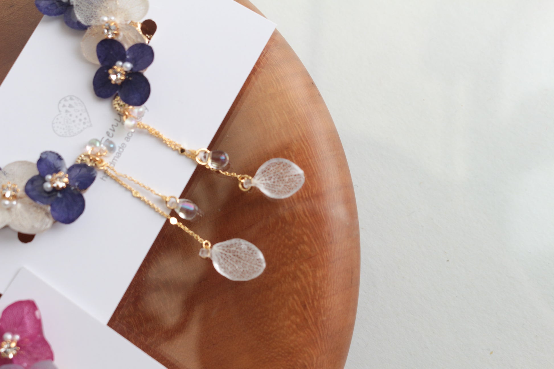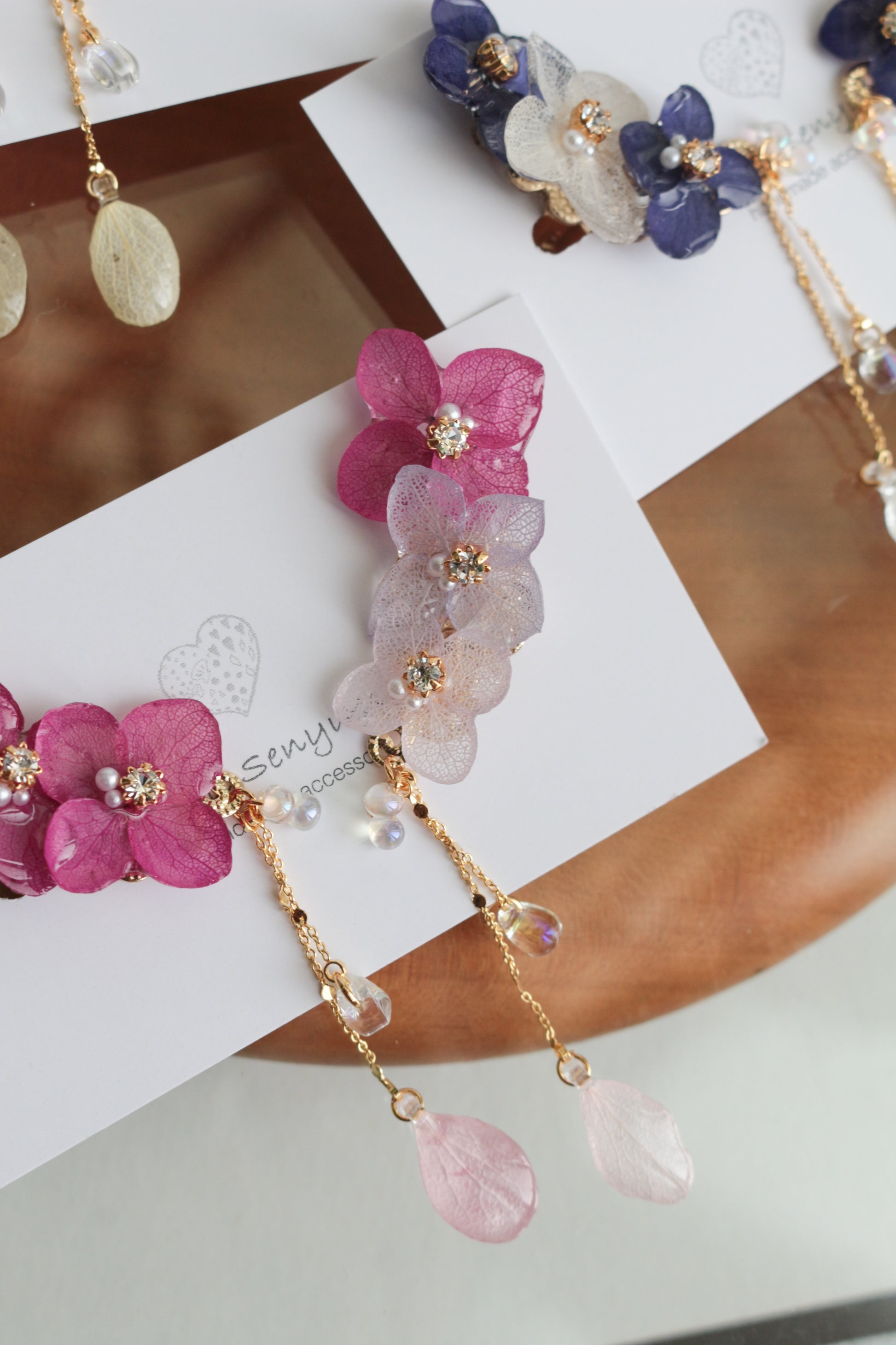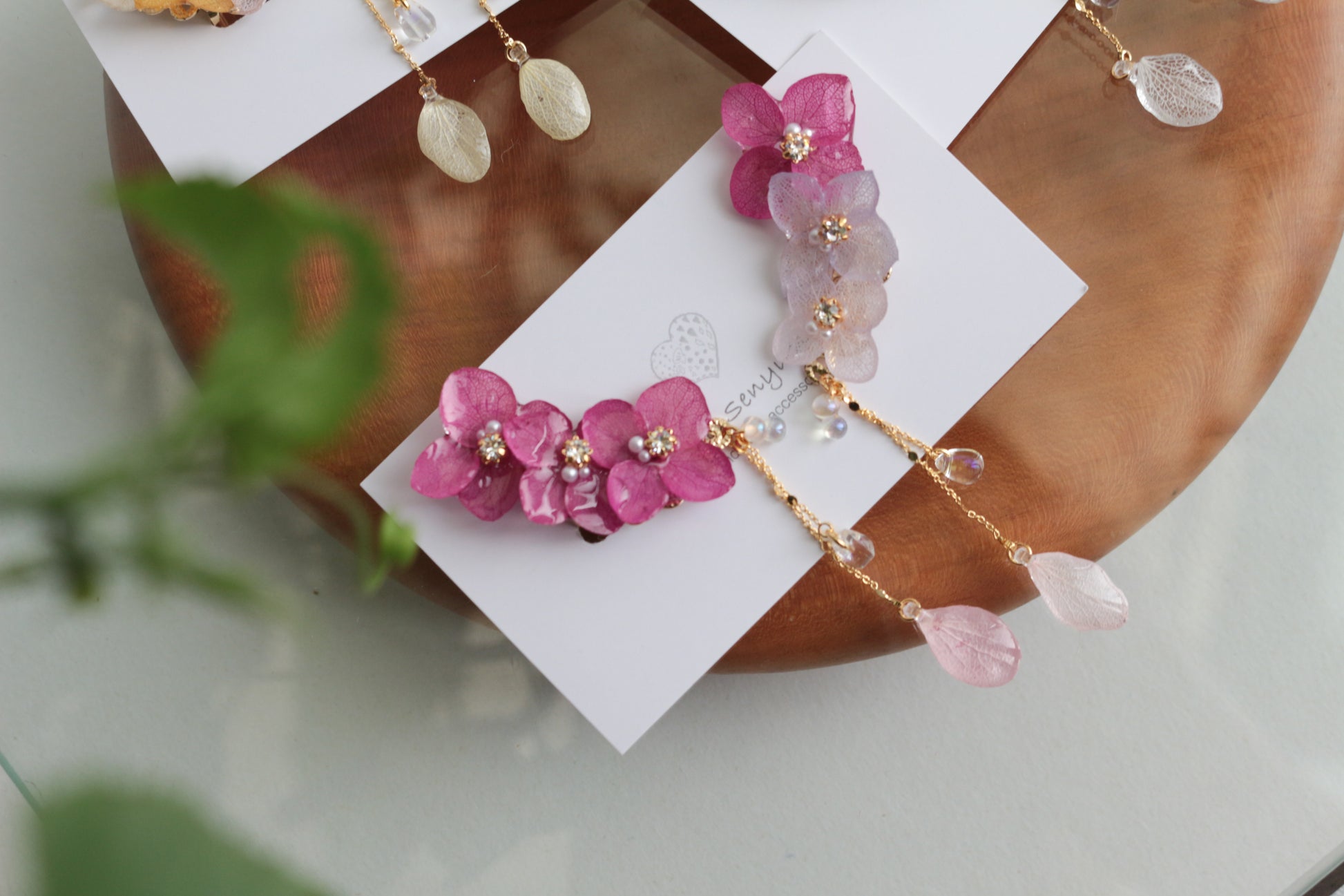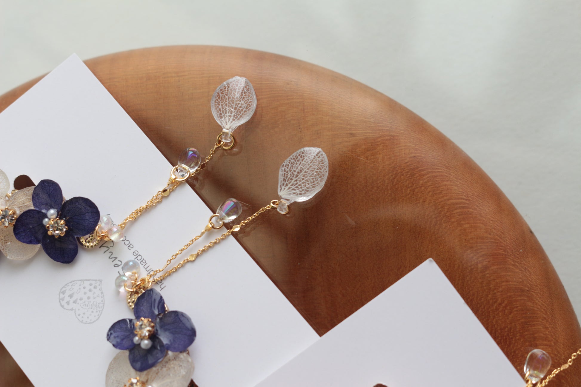 Made with real hydrangea petals to create three flowers with a flowing flower petal swinging from a golden chain.