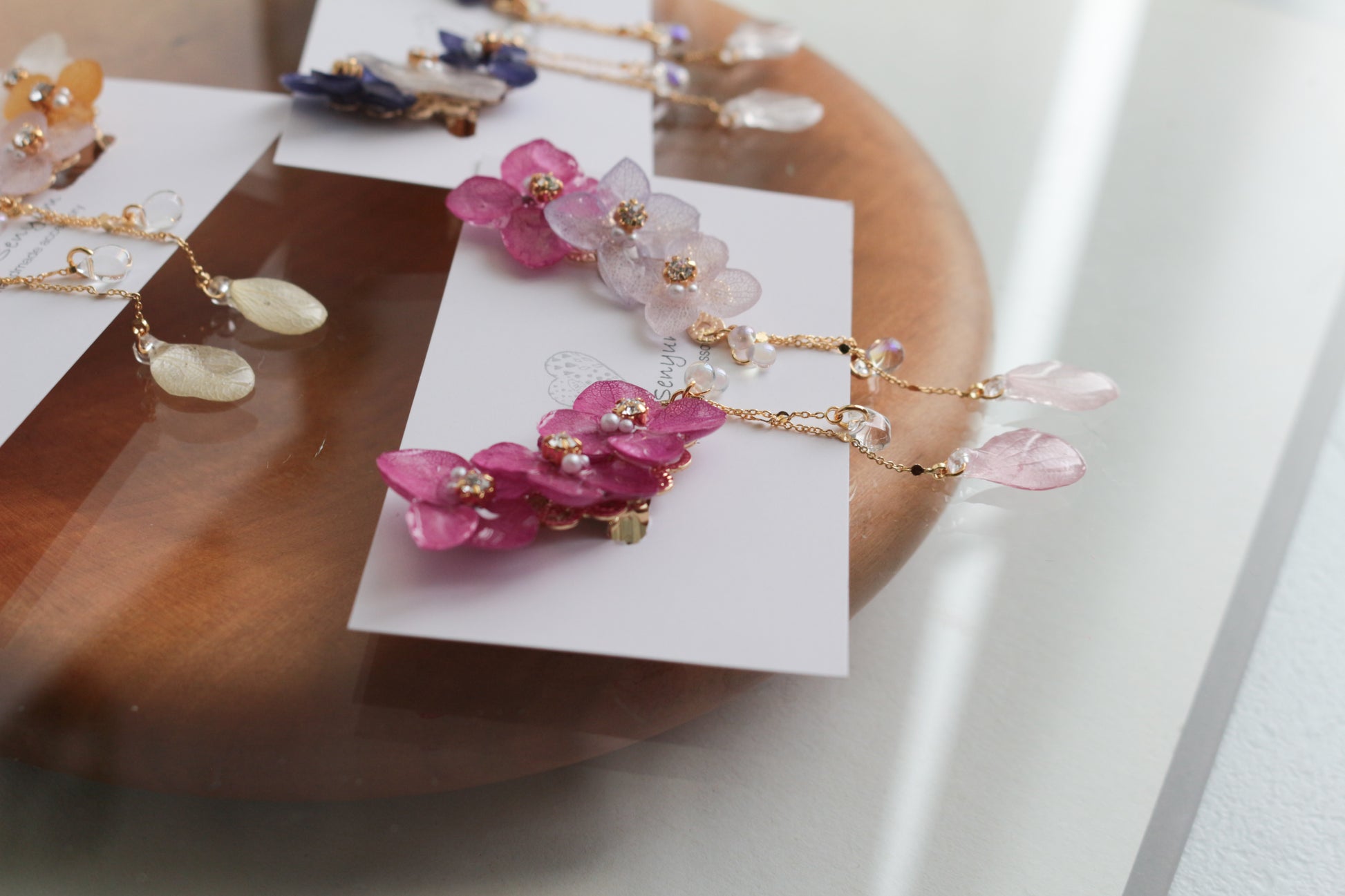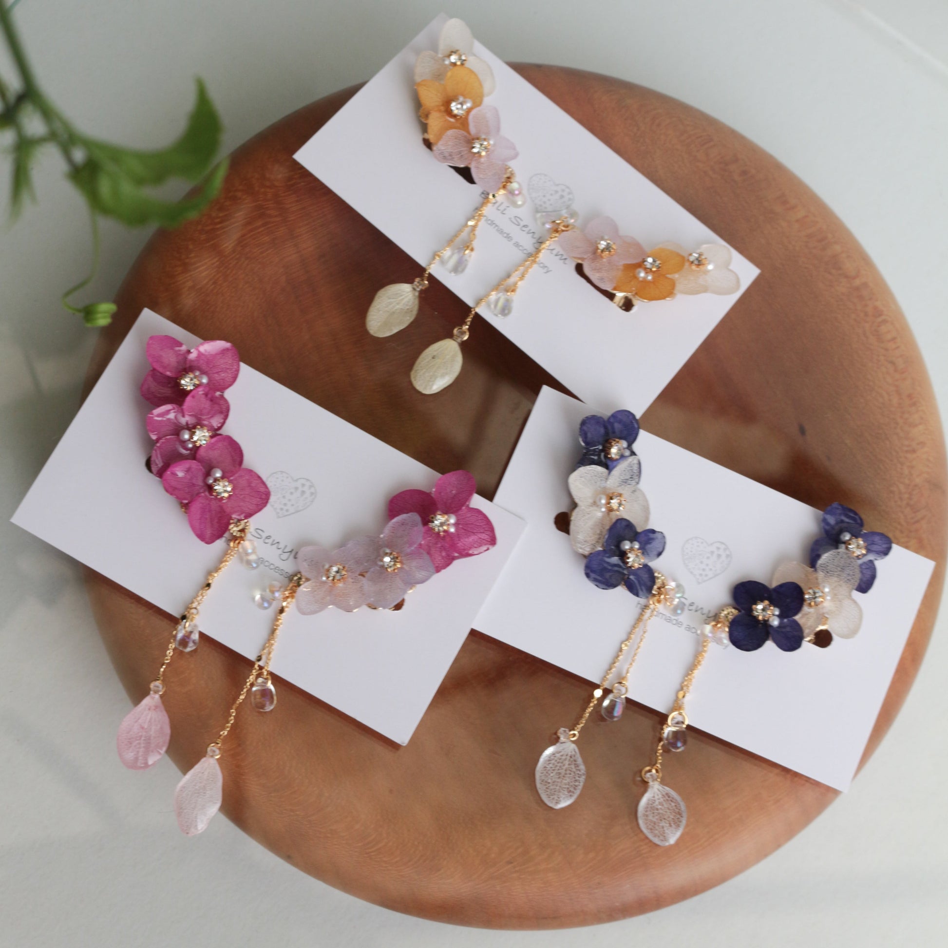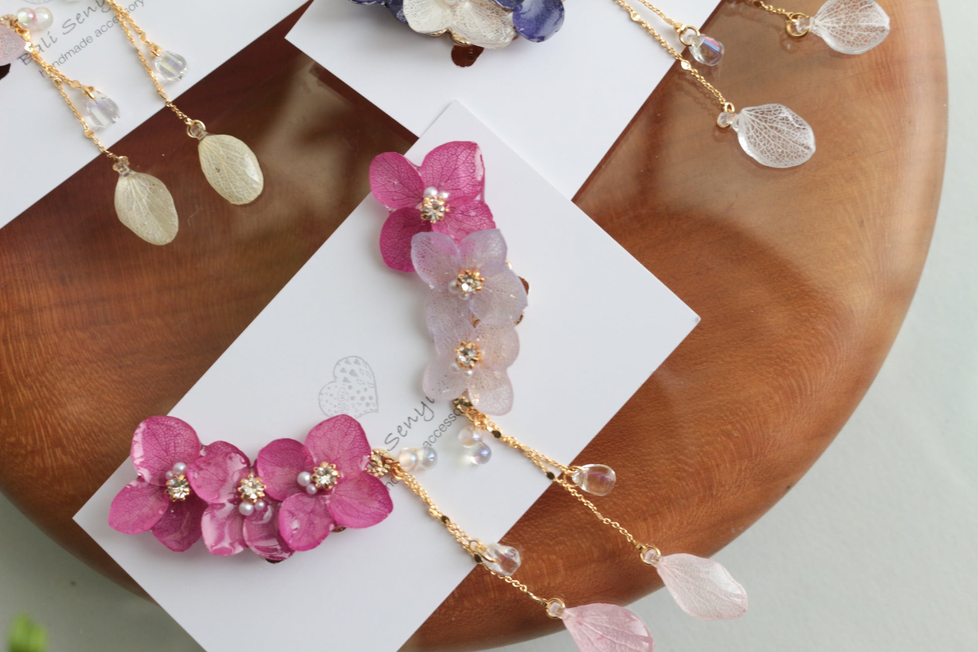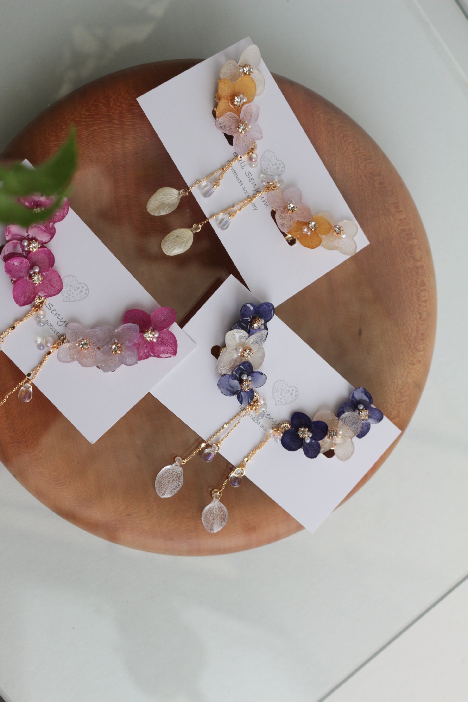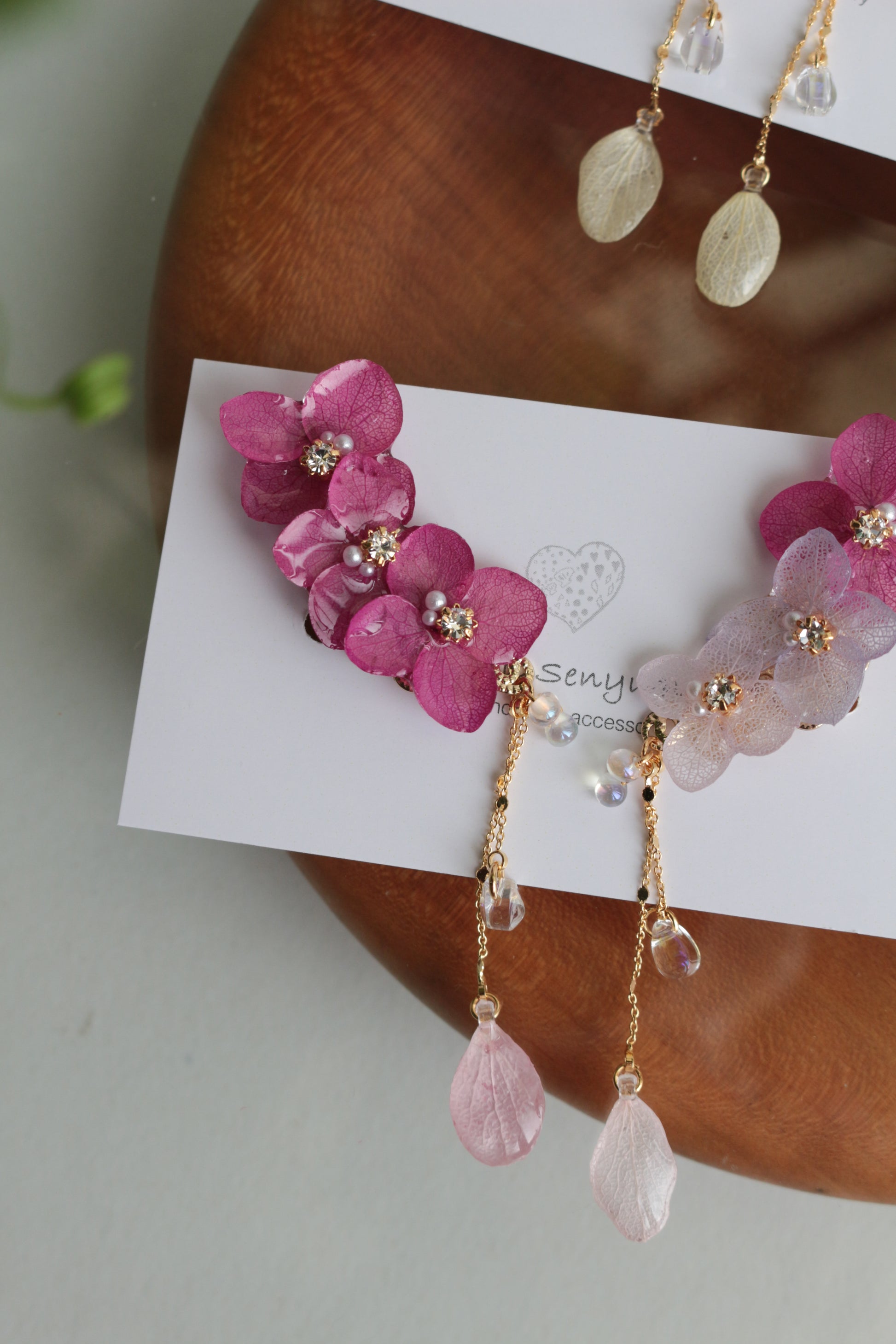 Made with real hydrangea petals to create three flowers with a flowing flower petal swinging from a golden chain.