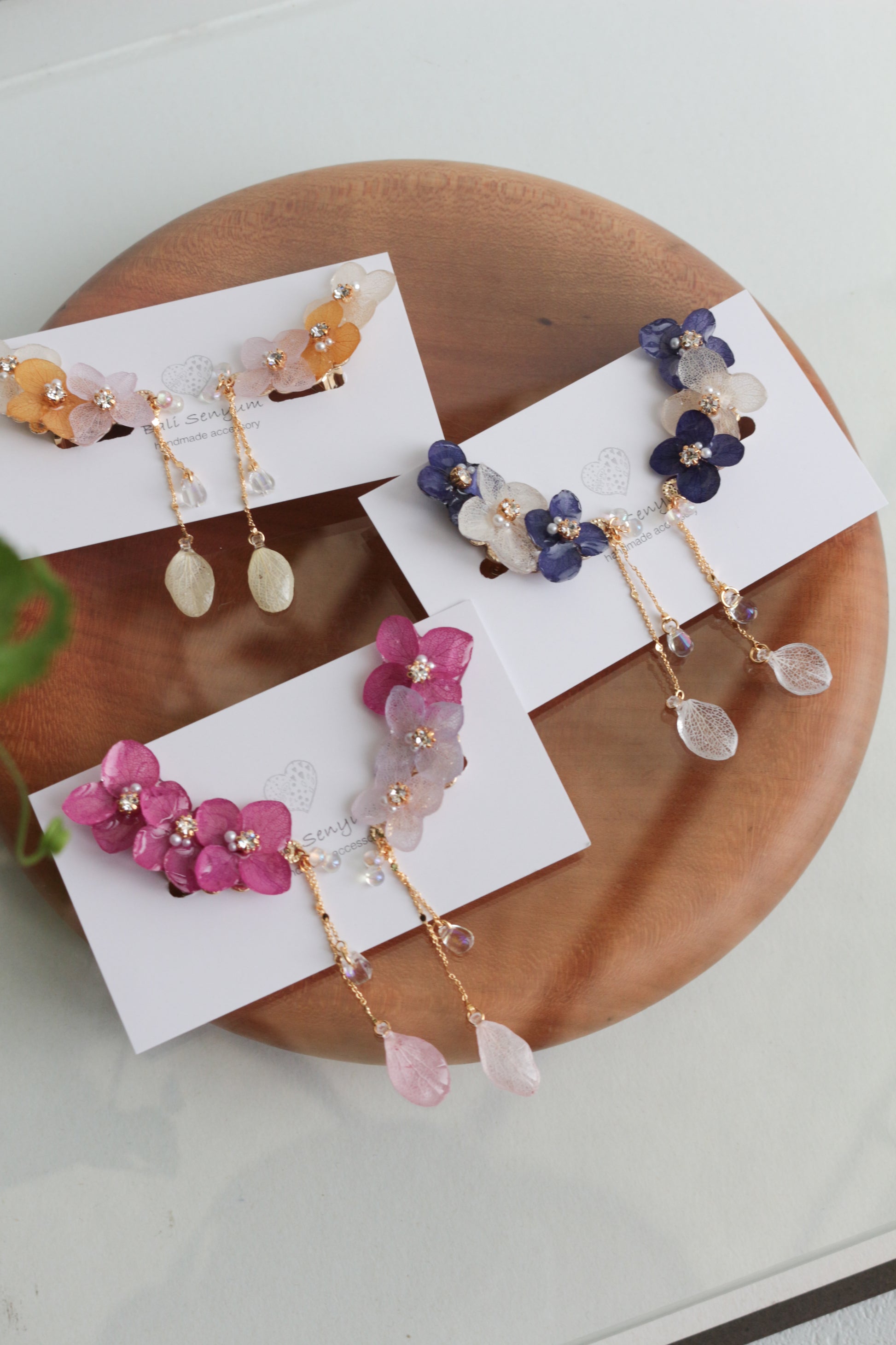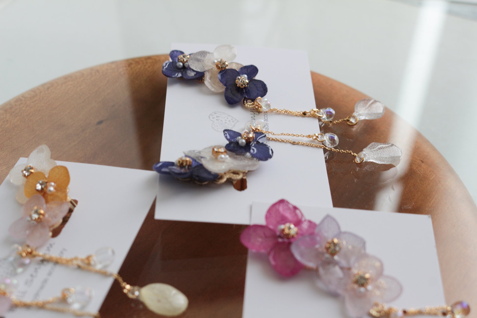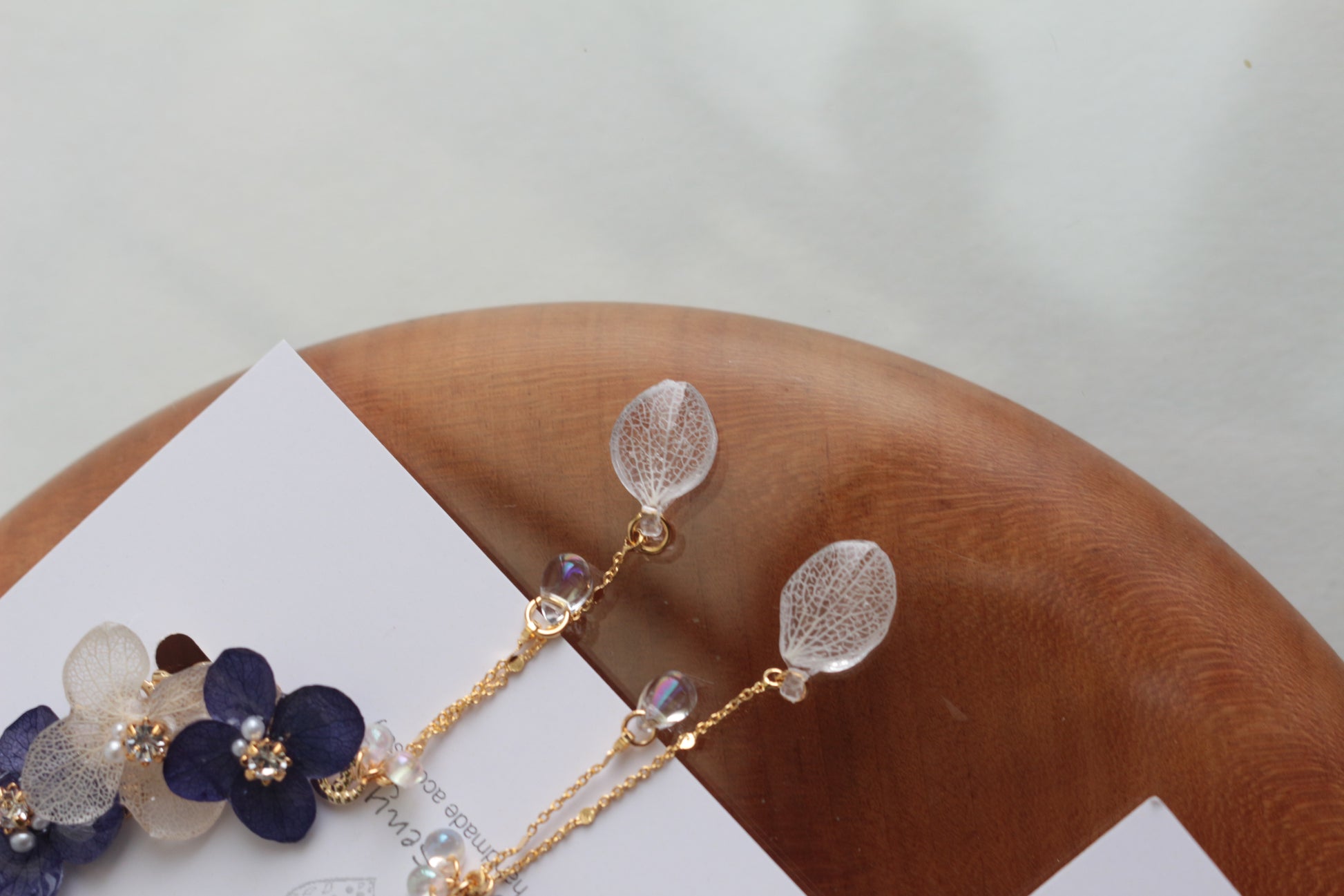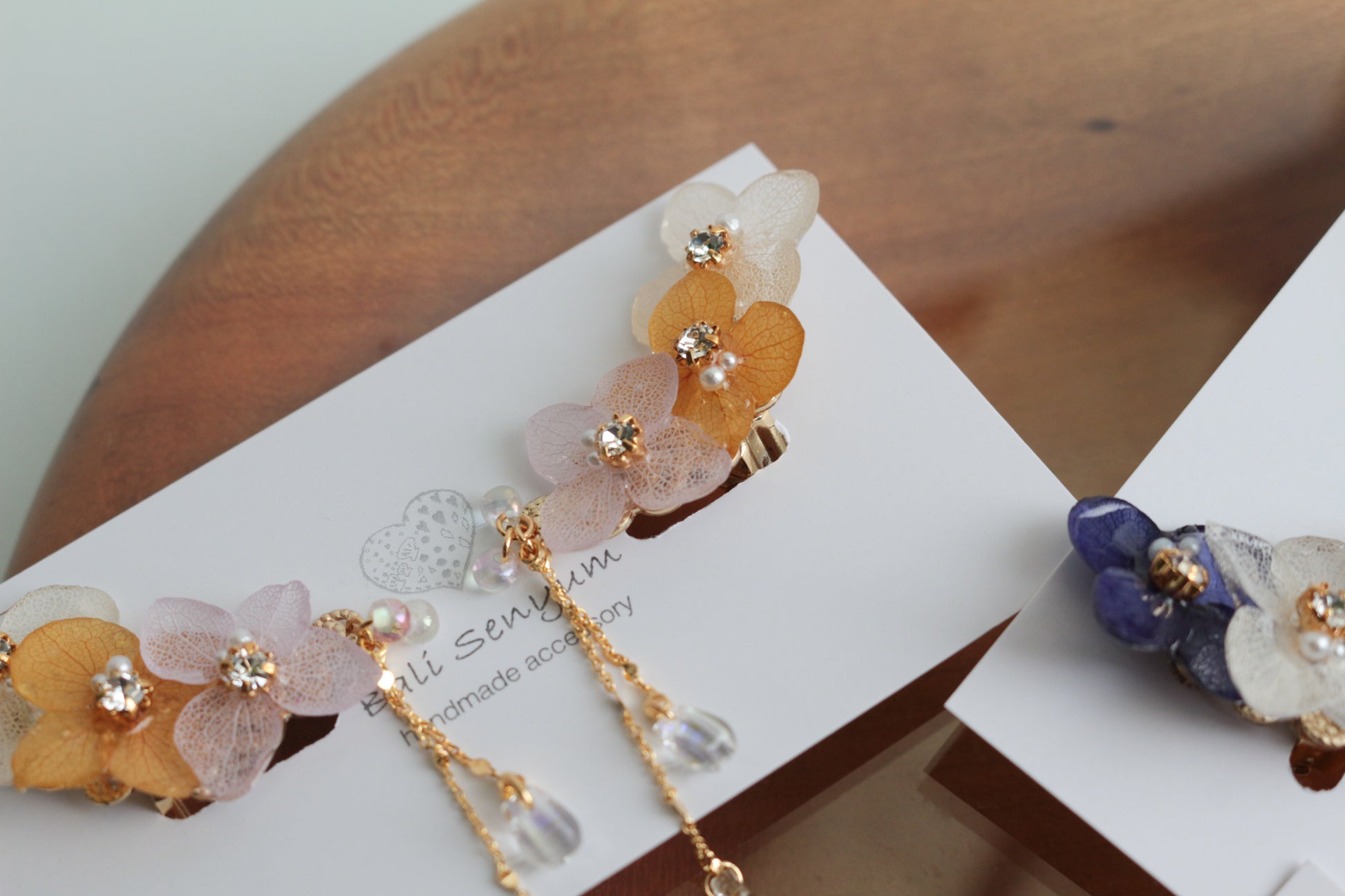Made with real hydrangea petals to create three flowers with a flowing flower petal swinging from a golden chain.