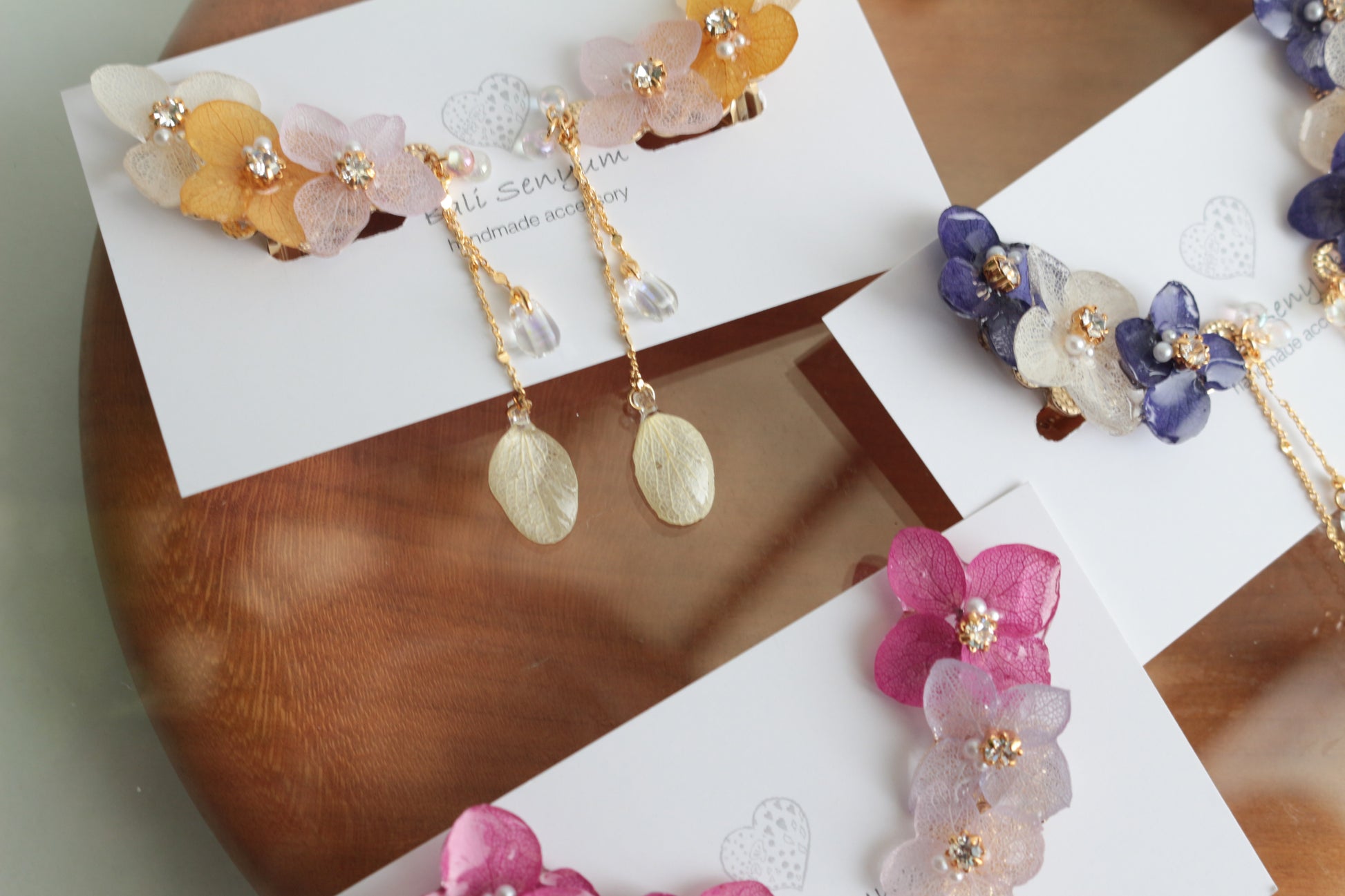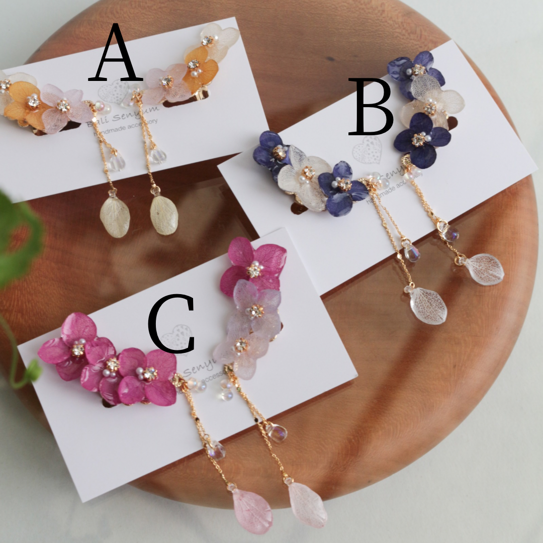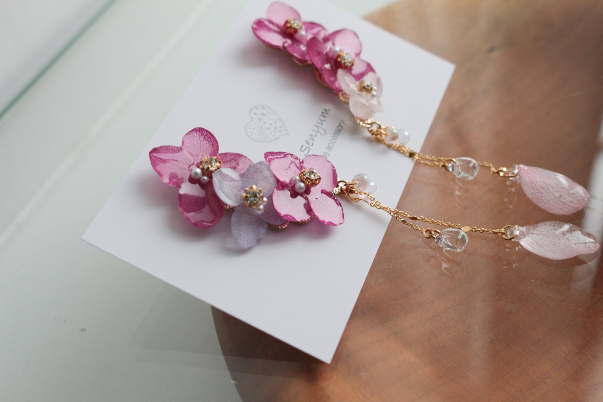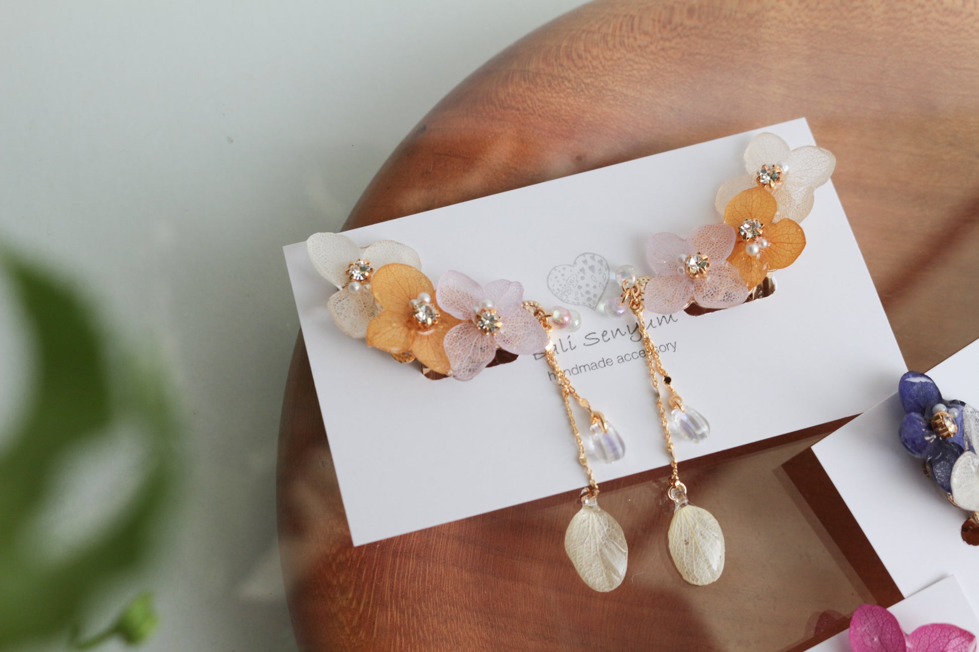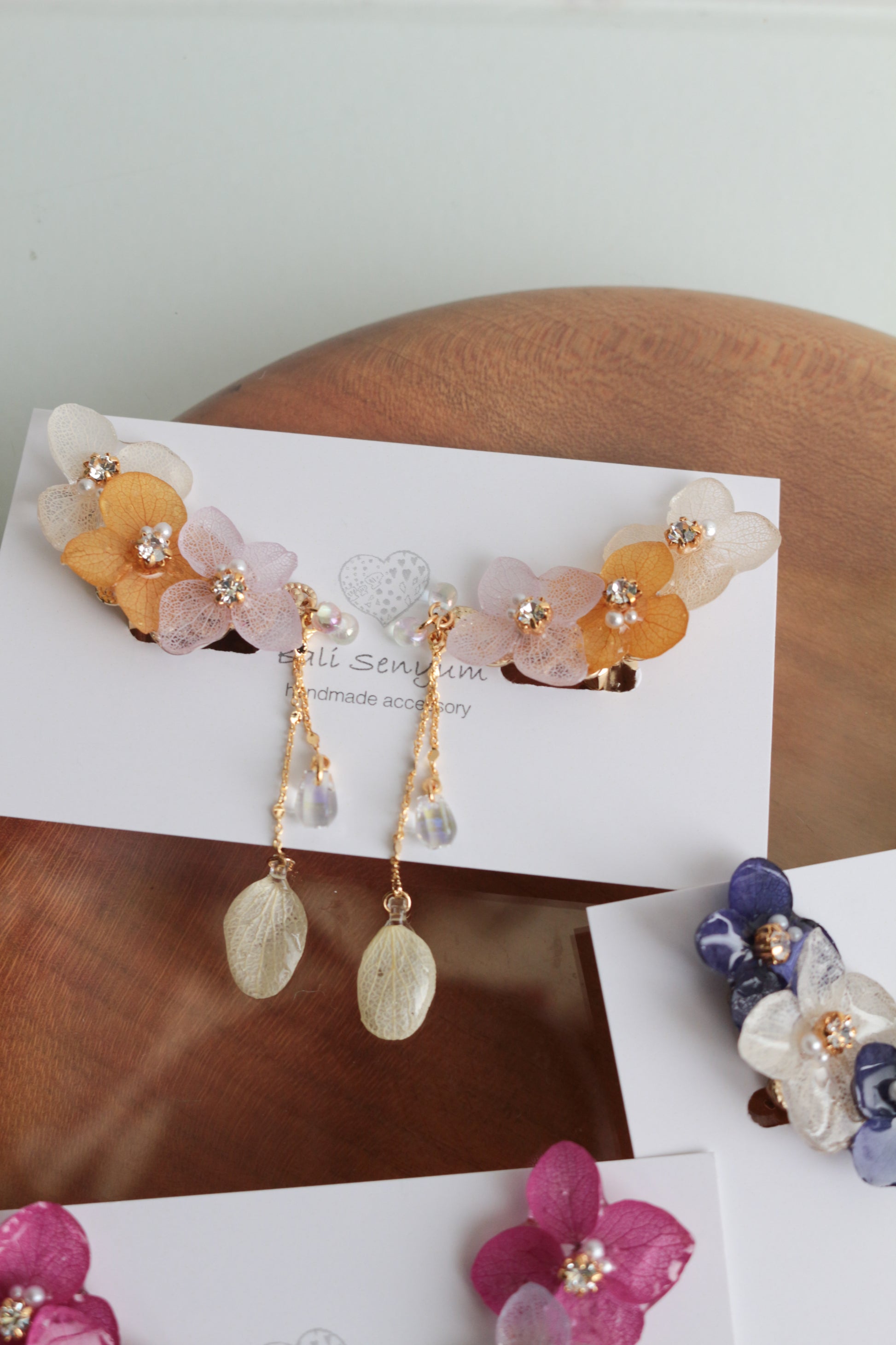 Made with real hydrangea petals to create three flowers with a flowing flower petal swinging from a golden chain.