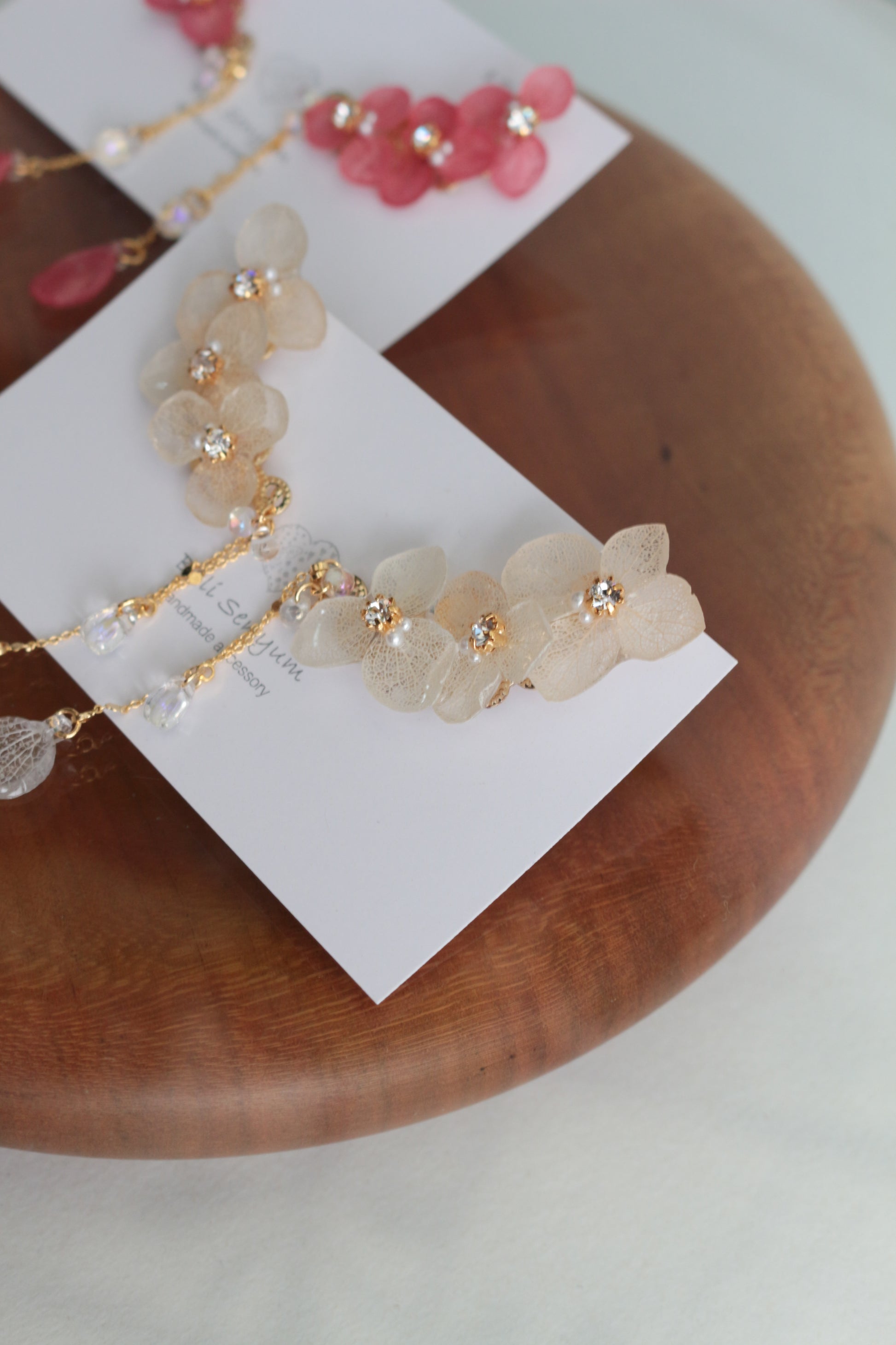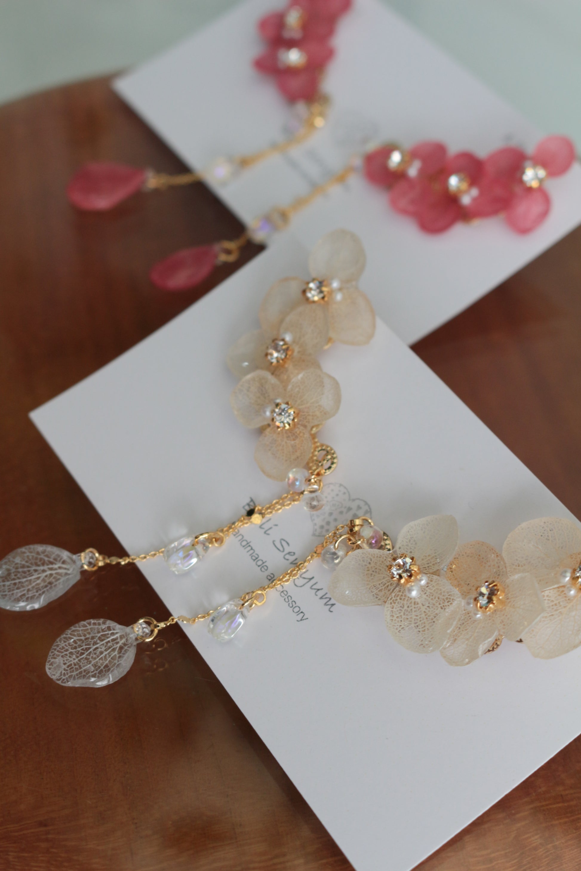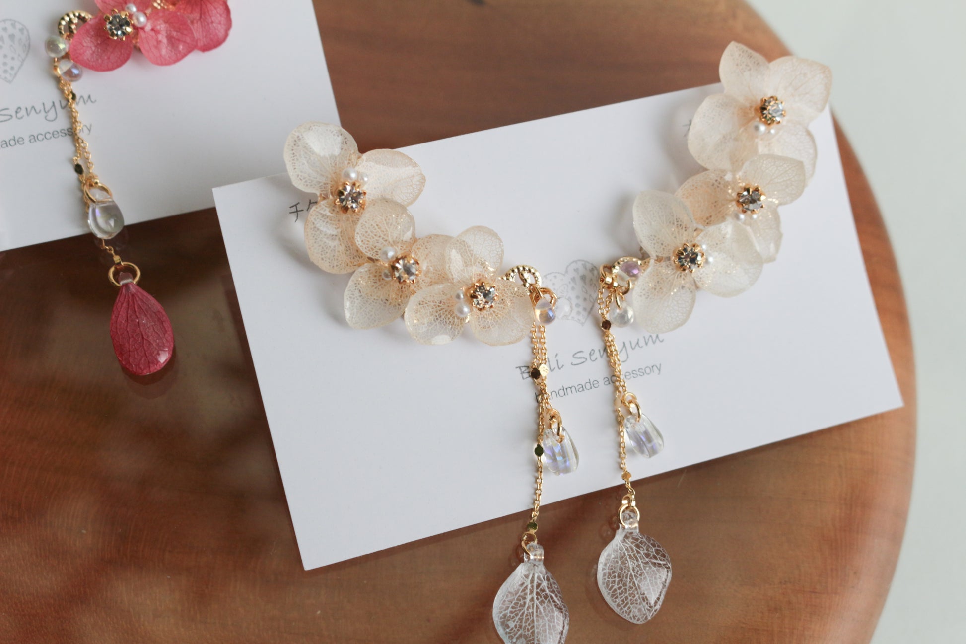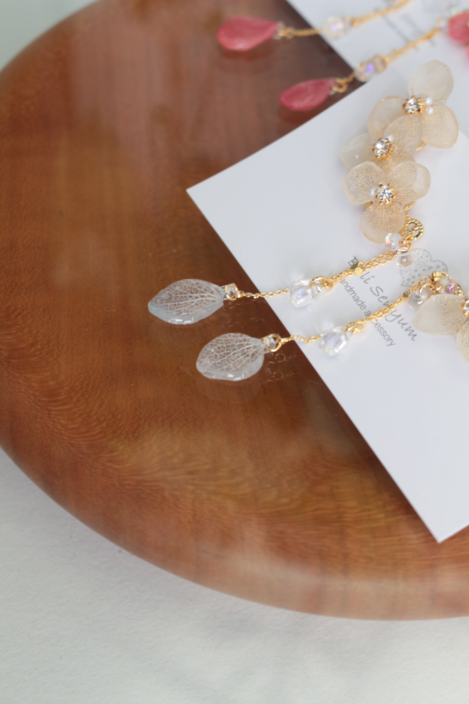Made with real hydrangea petals to create three flowers with a flowing flower petal swinging from a golden chain.
