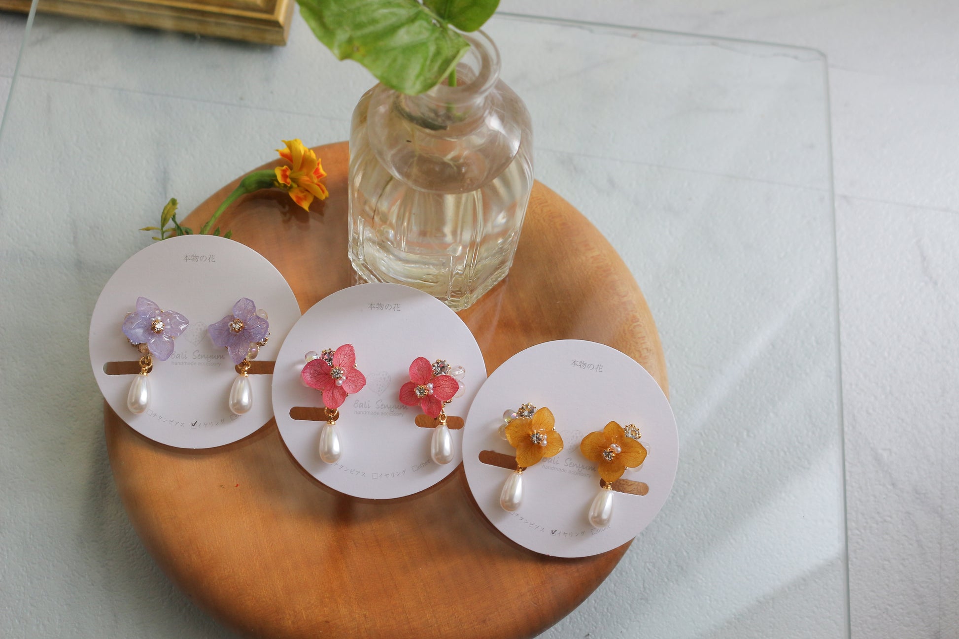 All the flower petals I use have been preserved, not dried, so that they maintain their color for a long time. I take extra care to make sure each and every one looks like it is still living on the tree.