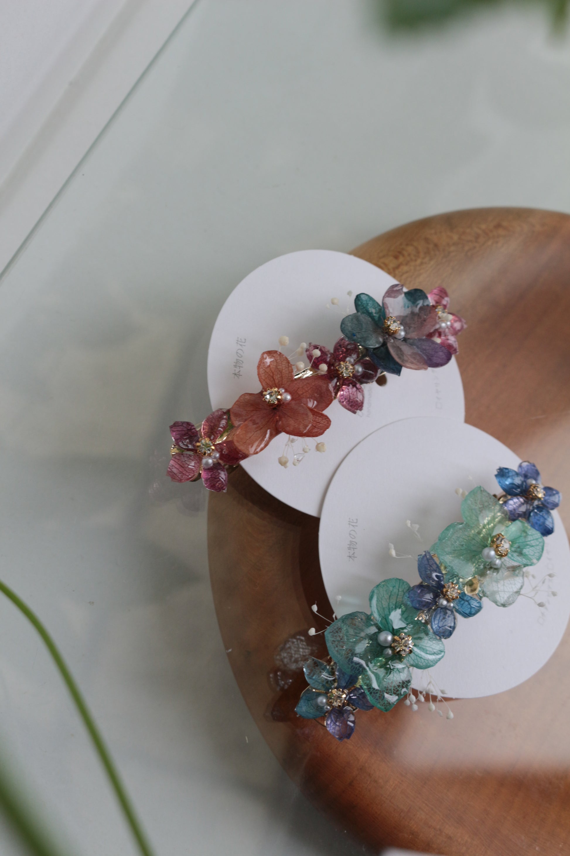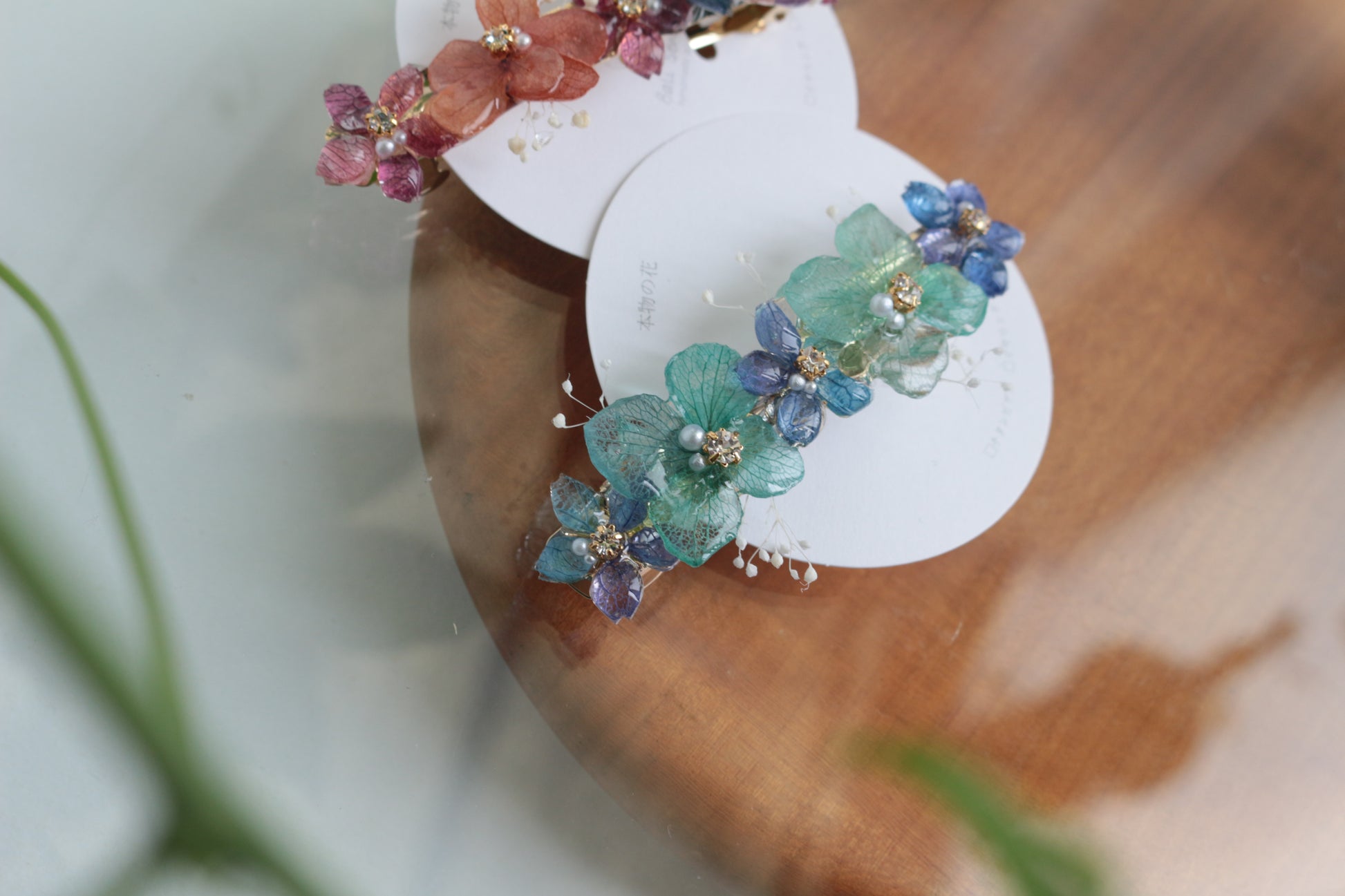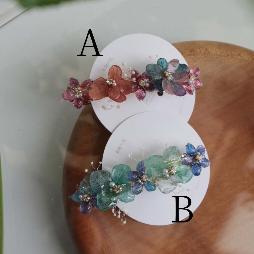 Hydrangea petals were used to create the flowers that adorn this barrette. Accented with delicate baby's breath and a gold colored clip.