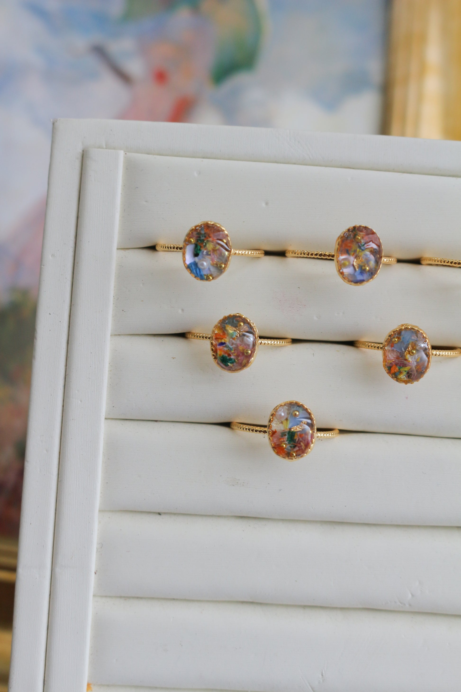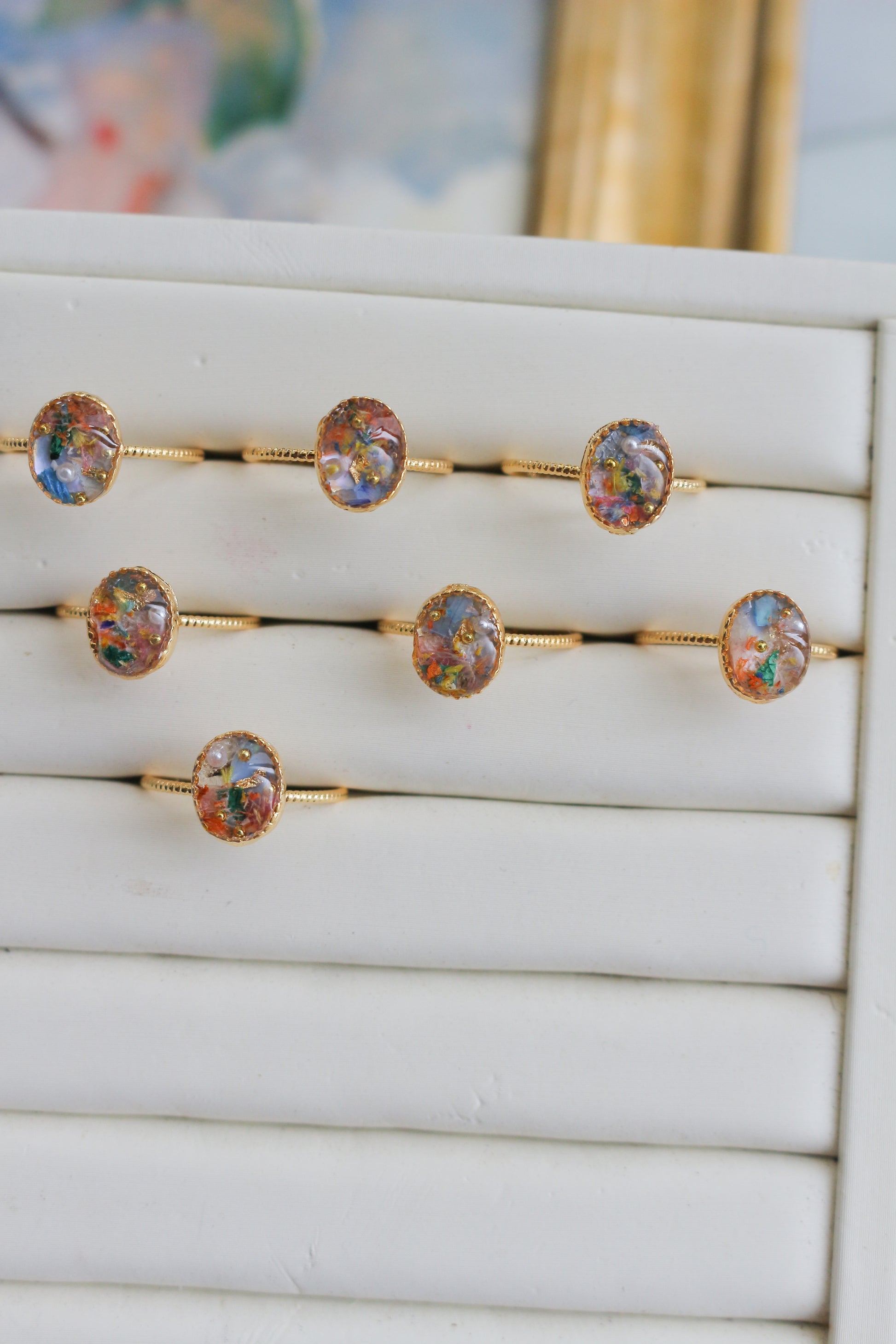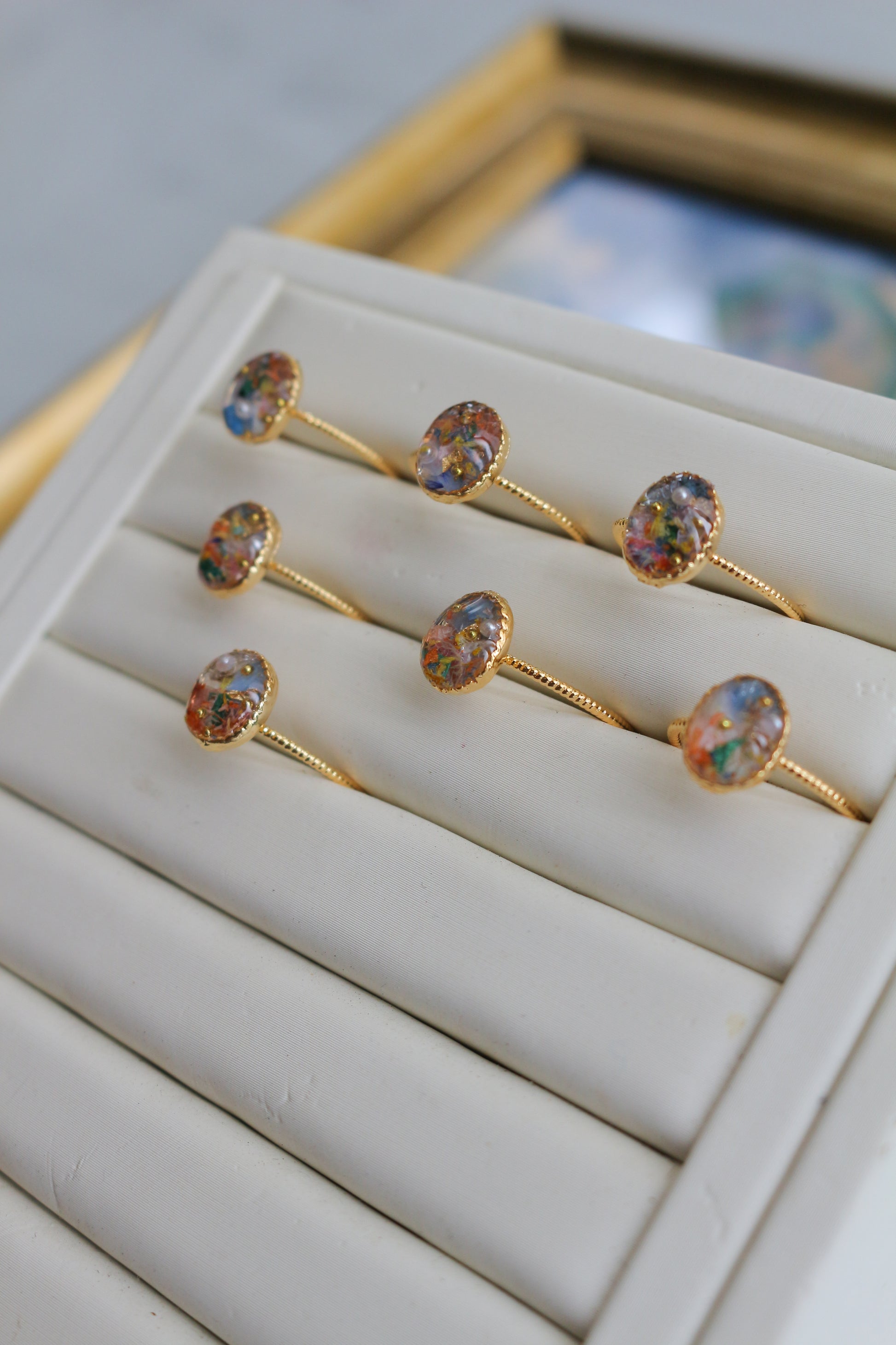 Bali Senyumオリジナルリングに絵画を植物や貝殻を使用して表現しました。