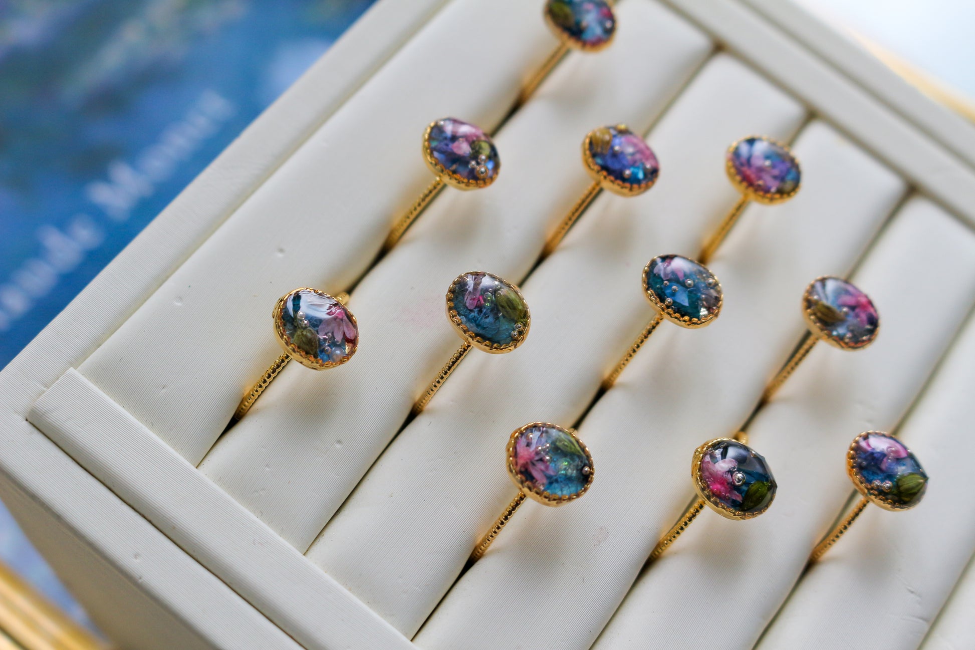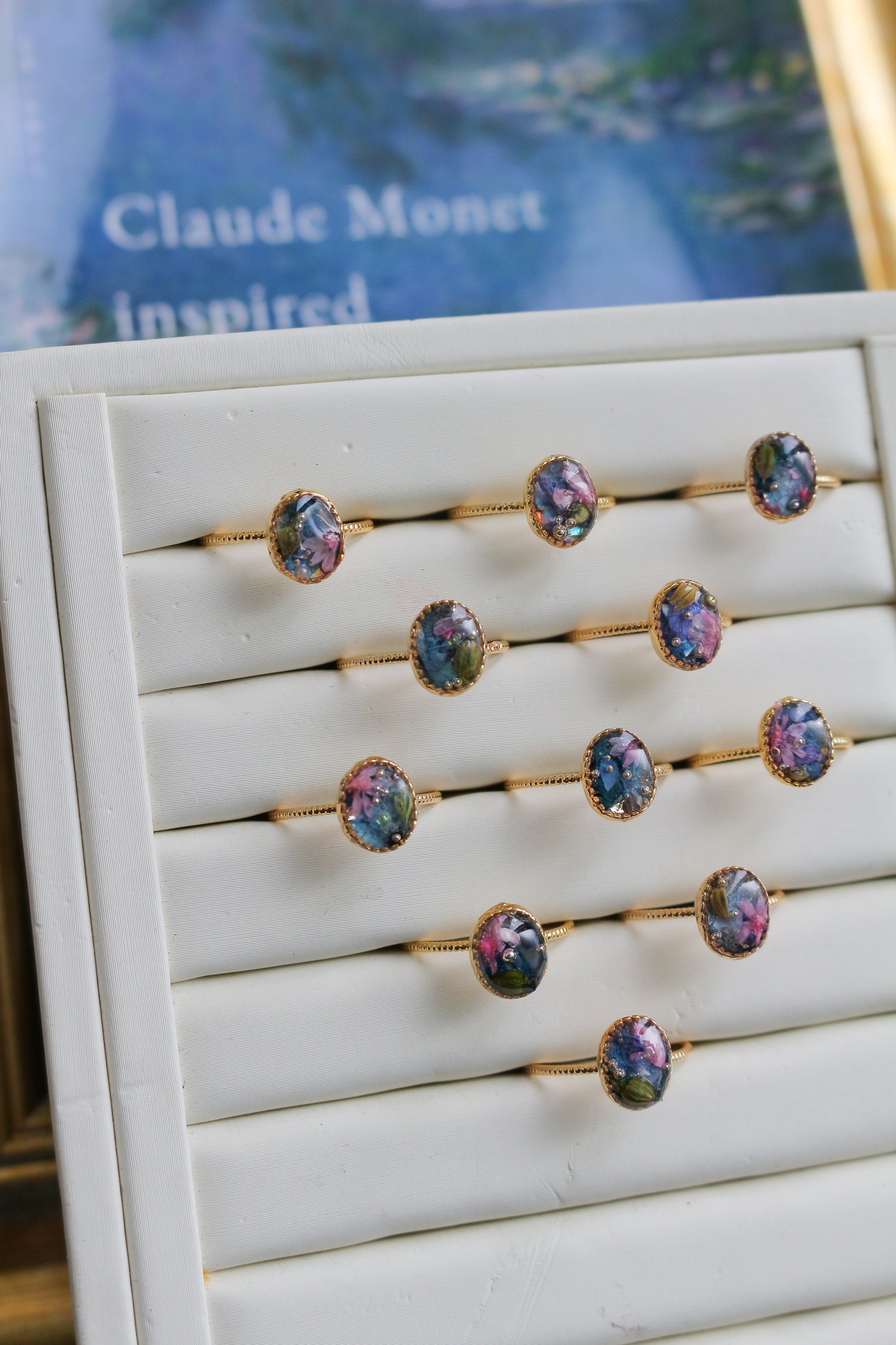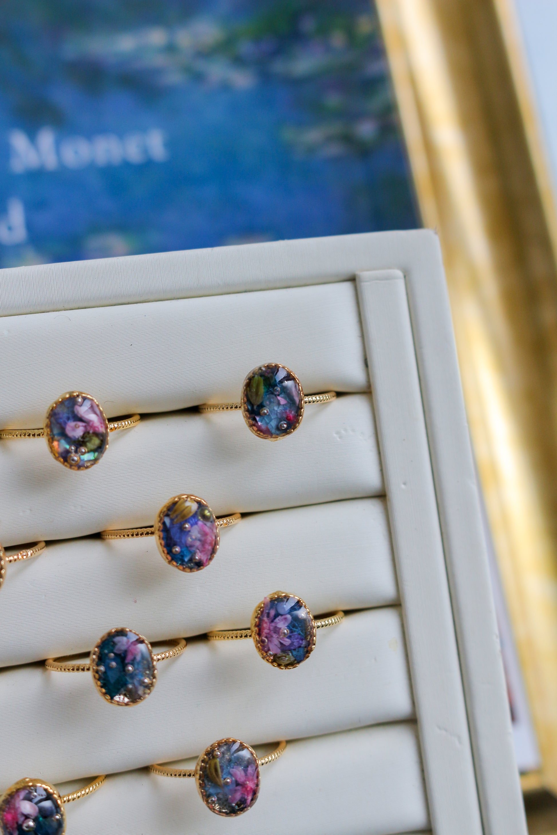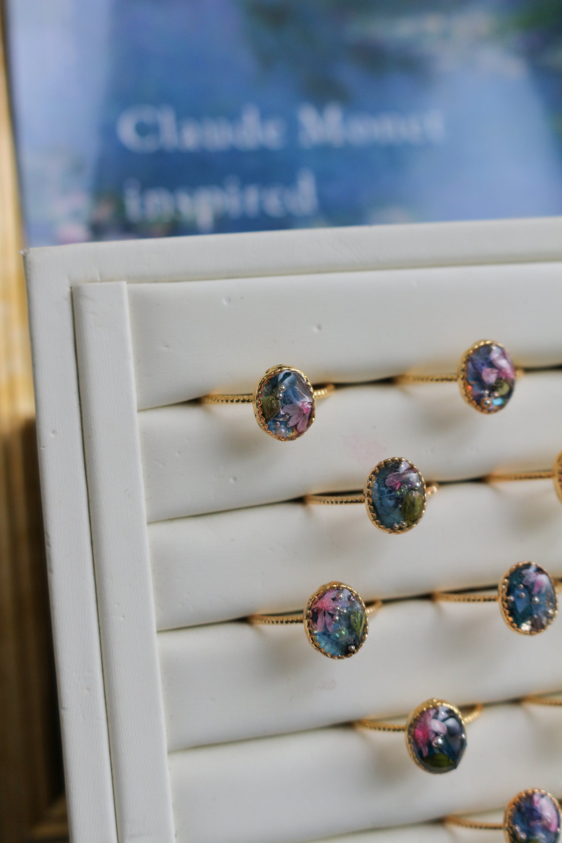 Bali Senyumオリジナルリングにモネの絵画を植物や貝殻を使用して表現しました。