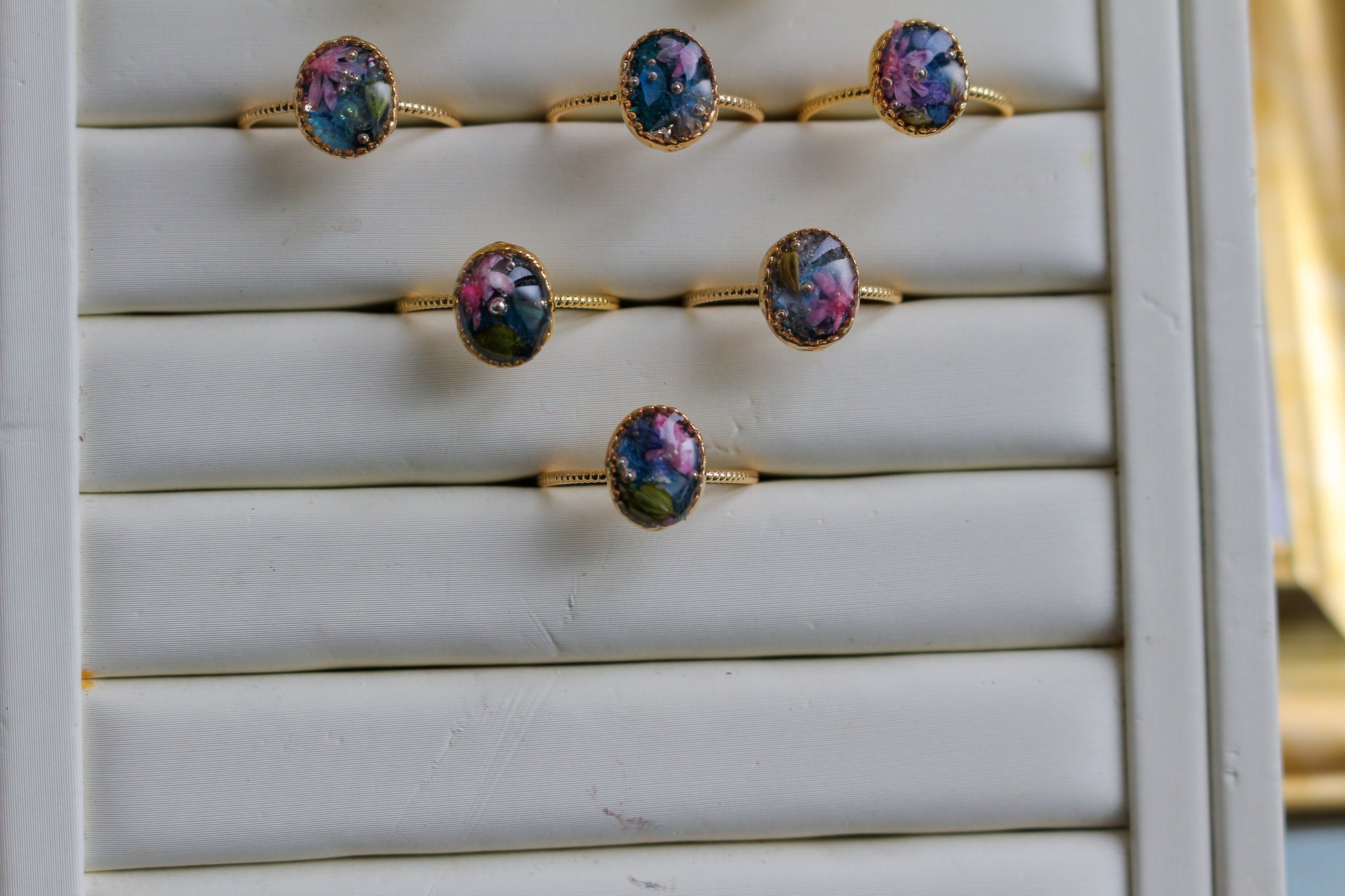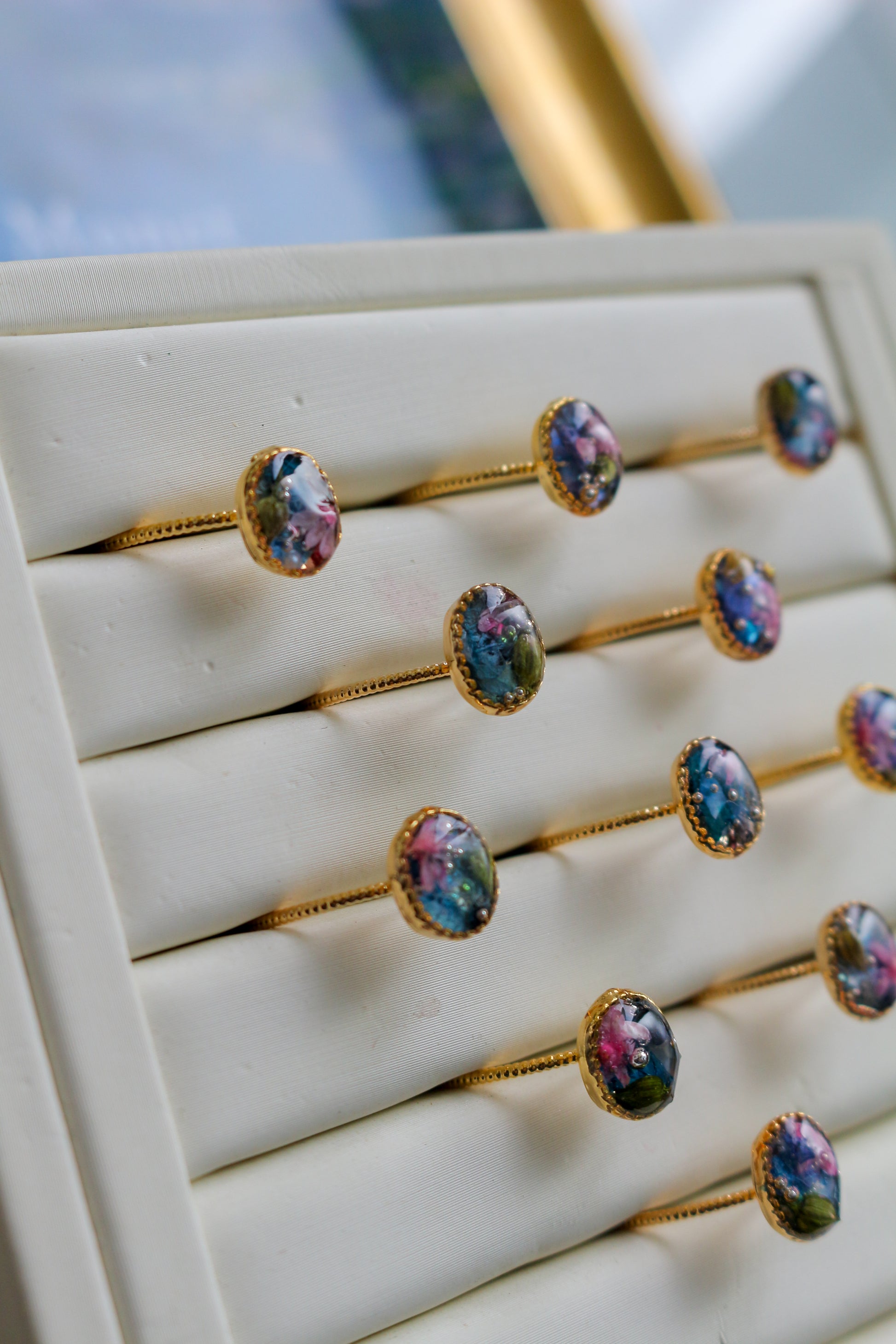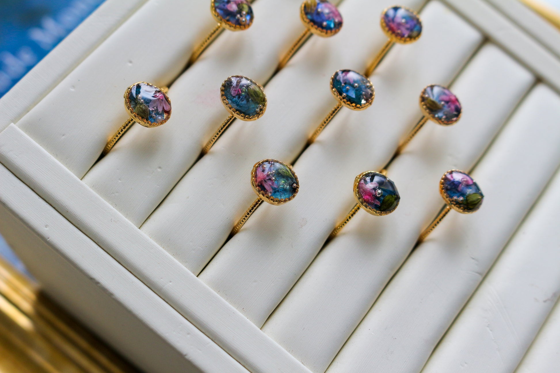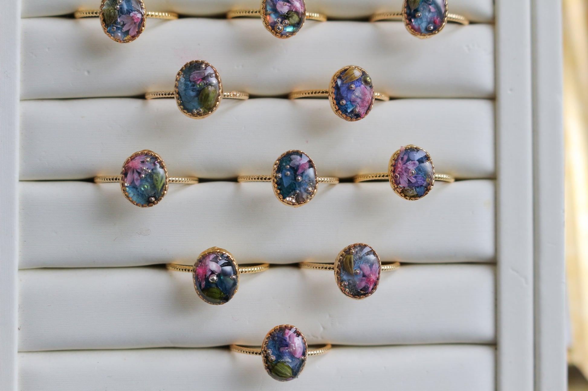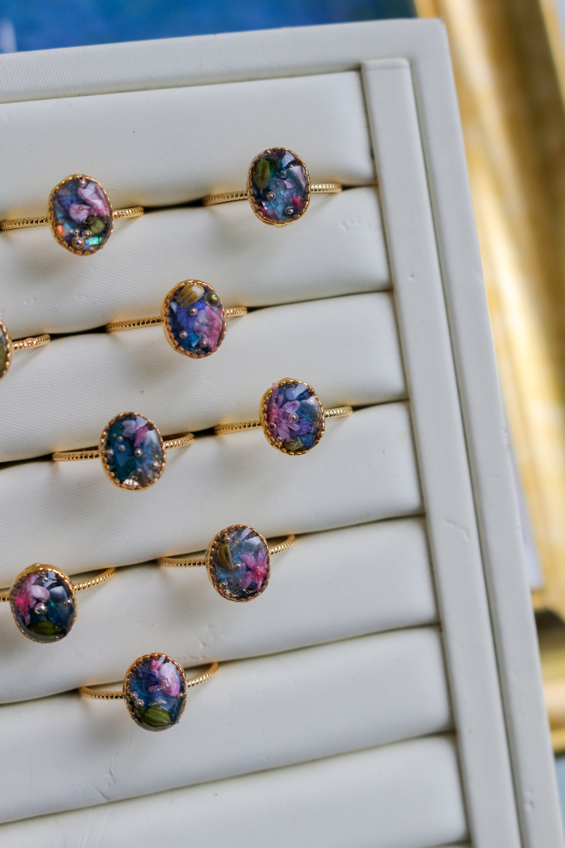 Bali Senyumオリジナルリングにモネの絵画を植物や貝殻を使用して表現しました。