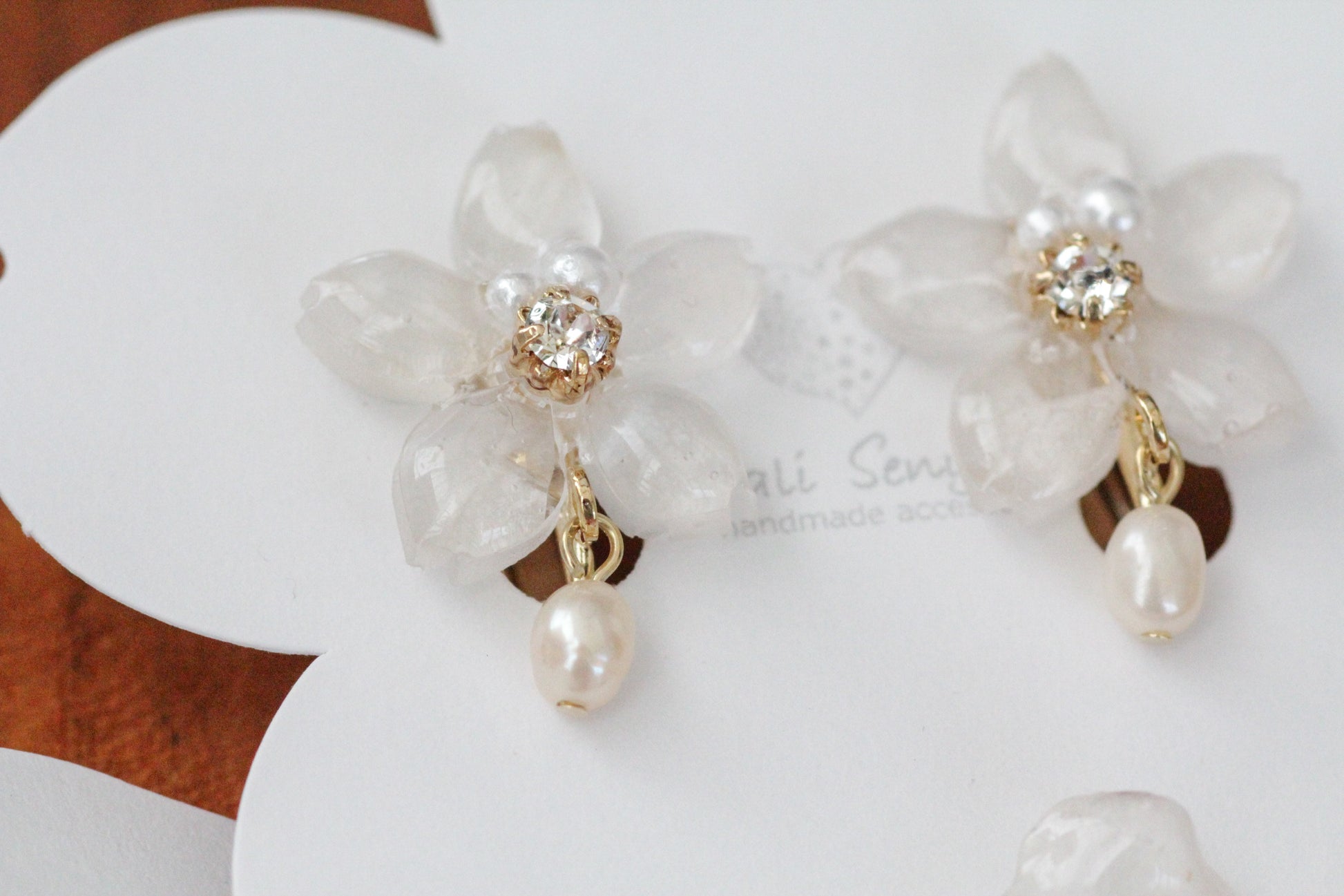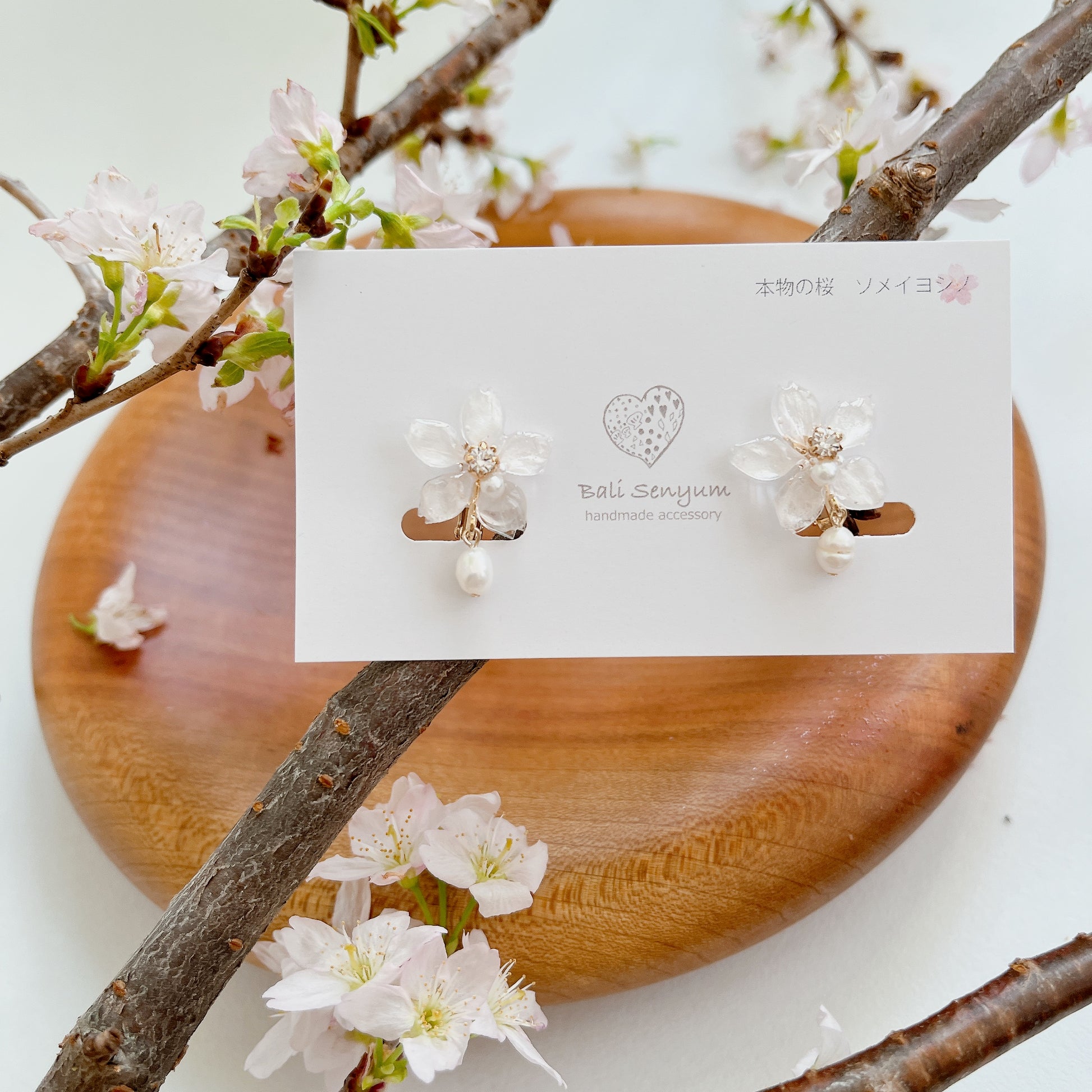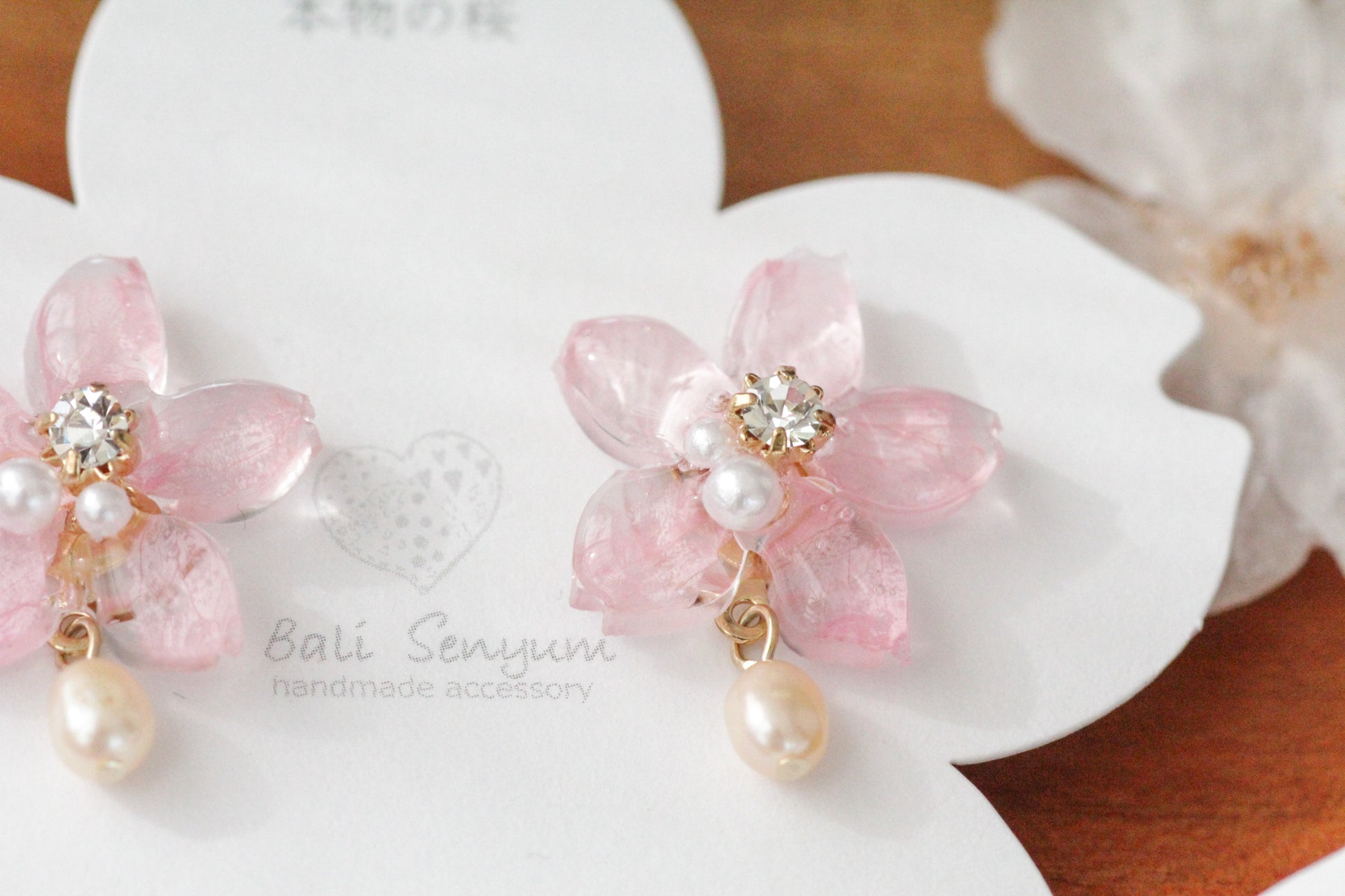 Small someyoshino sakura petals arranged around a jewel in the center along with a pearl hanging below. These cute earrings will let you take the feeling of a iconic Japanese Springtime wherever you go.