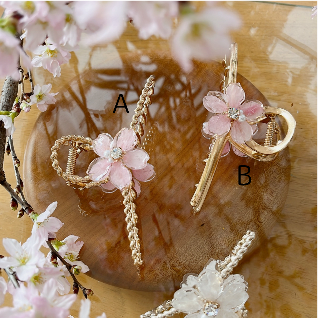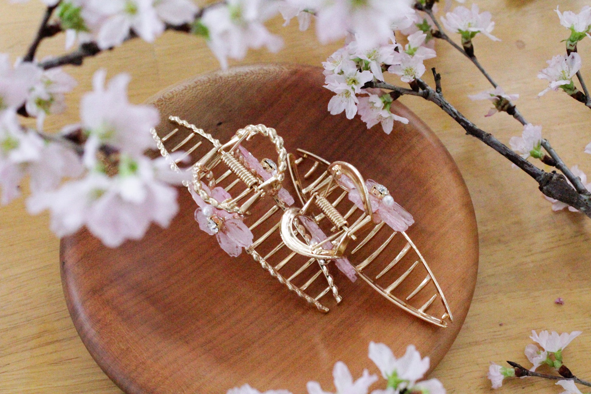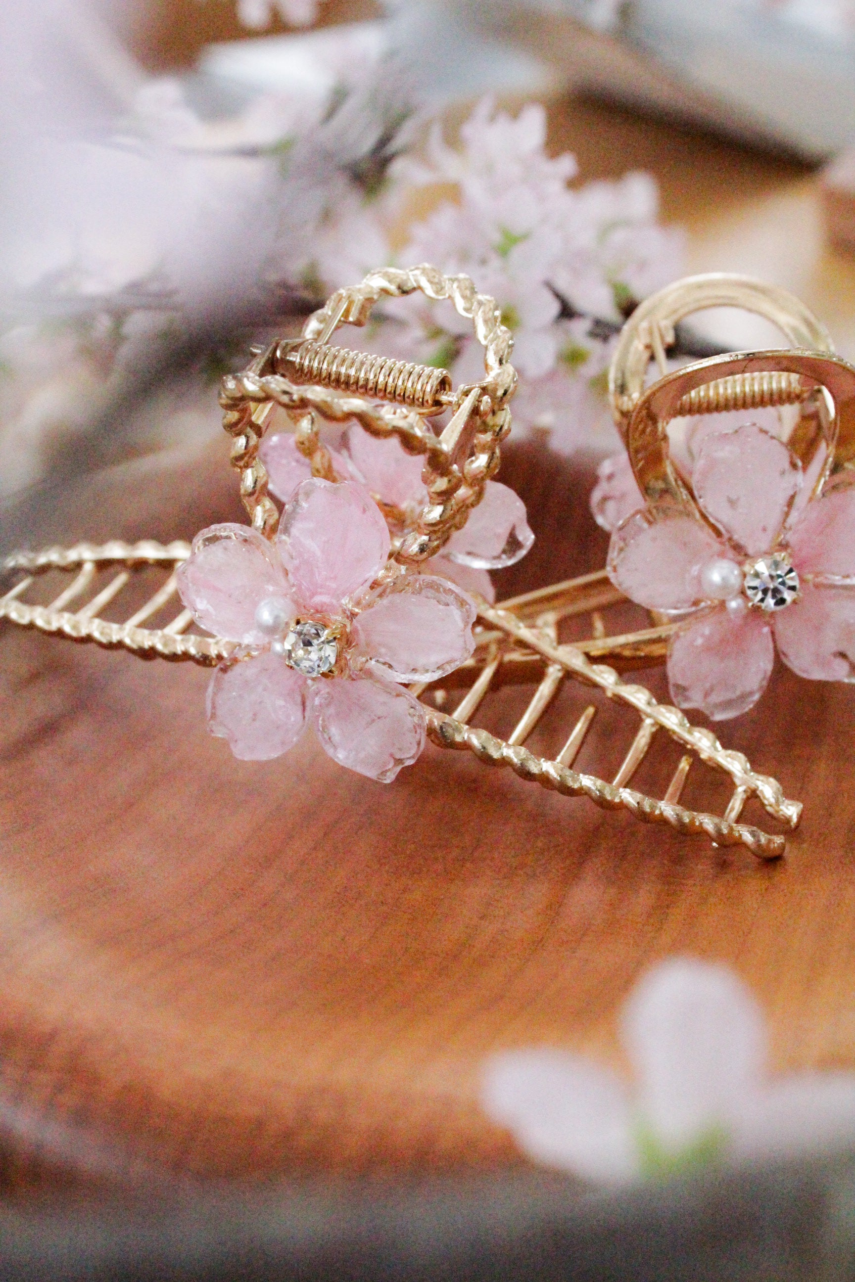 Large someiyoshino sakura petals arranged around gems create a beautiful flower that sits atop a golden hair clip.