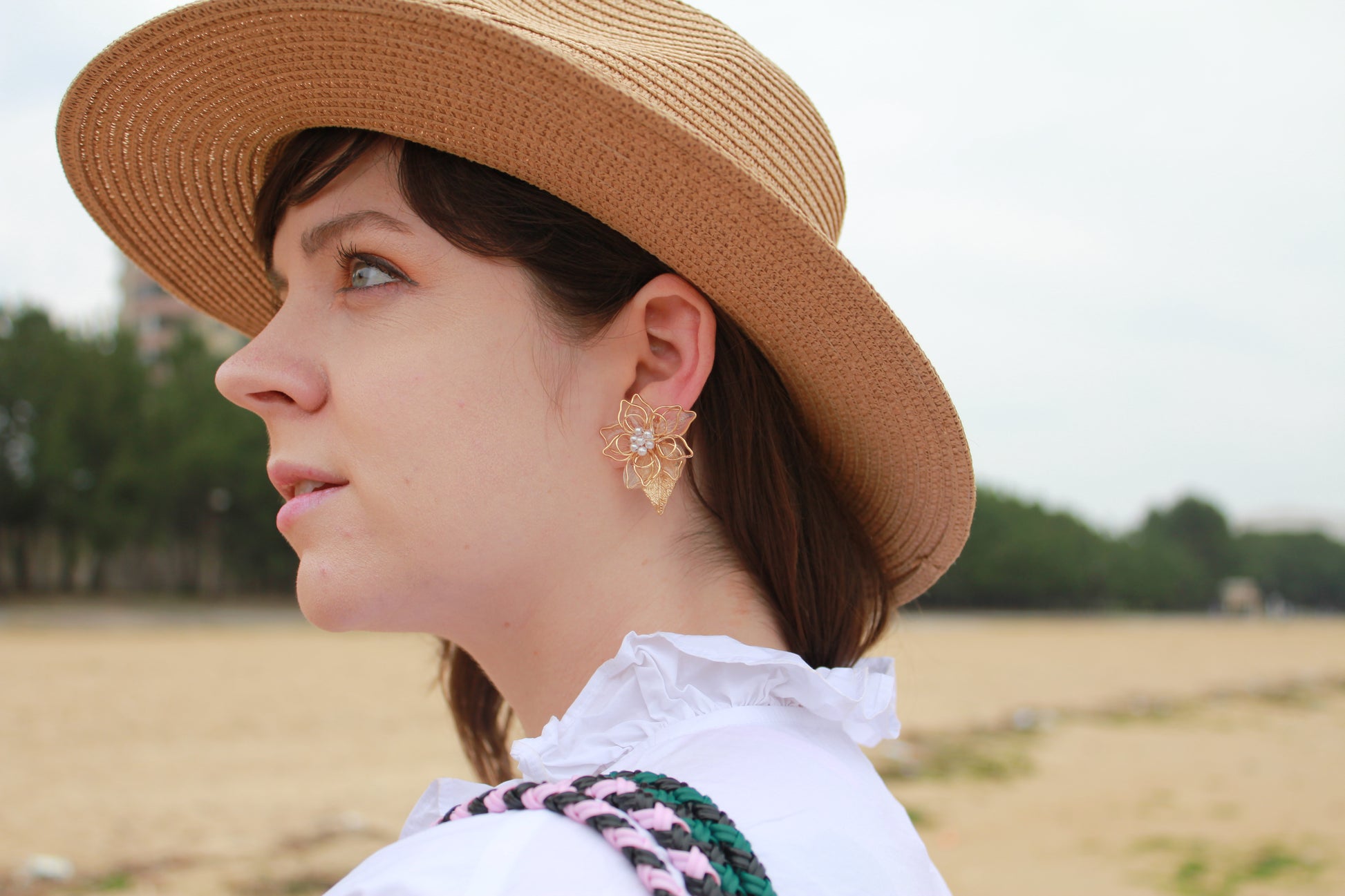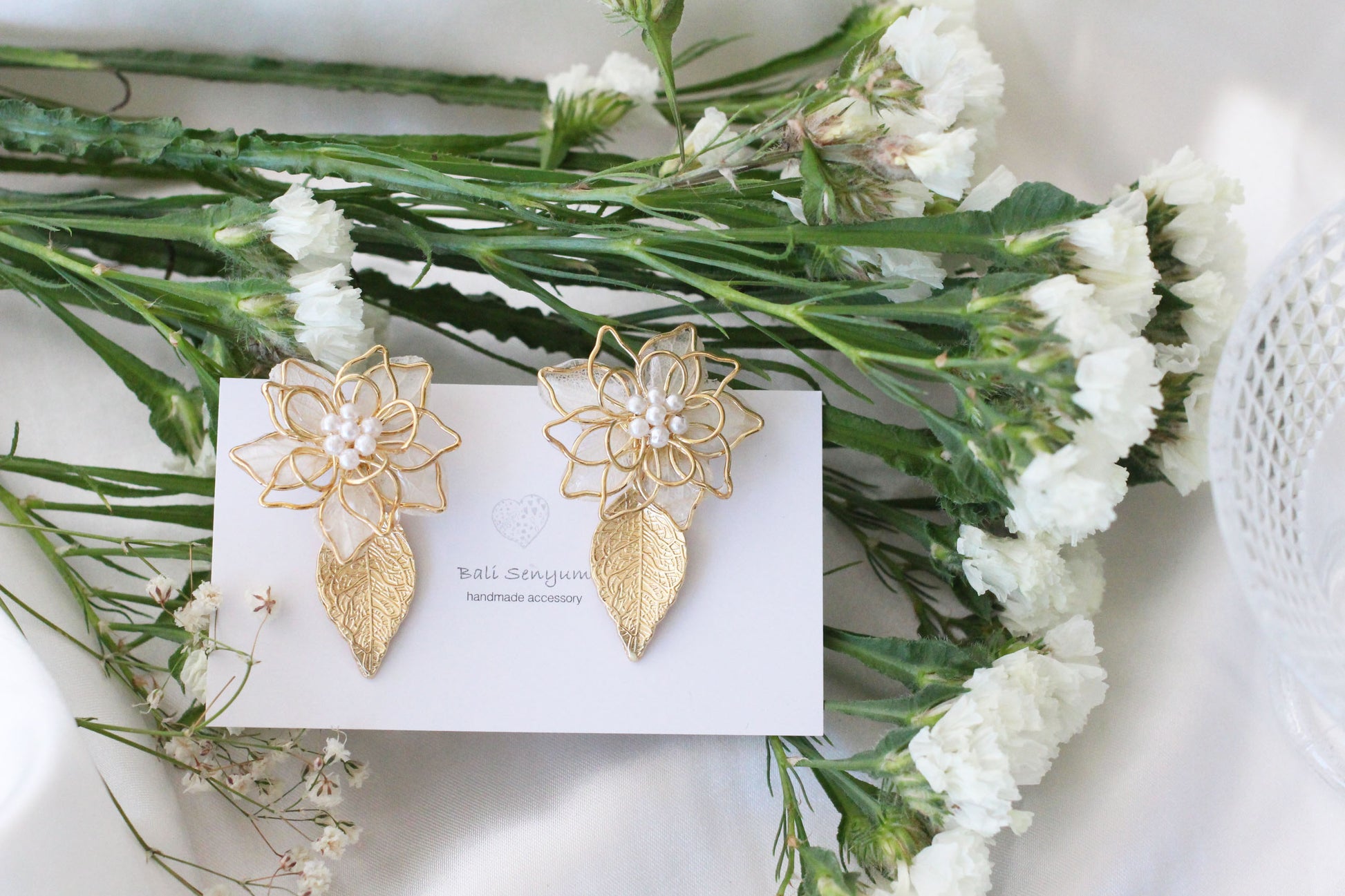 This golden earring will add some sparkle to any outfit. Hydrangea flower petals coated in resin with thin gold plated metal trimming. Two more layers of thin gold metal in the shape of flower petals with small grouping of gems in the center. Hanging below is a gold plated leaf.