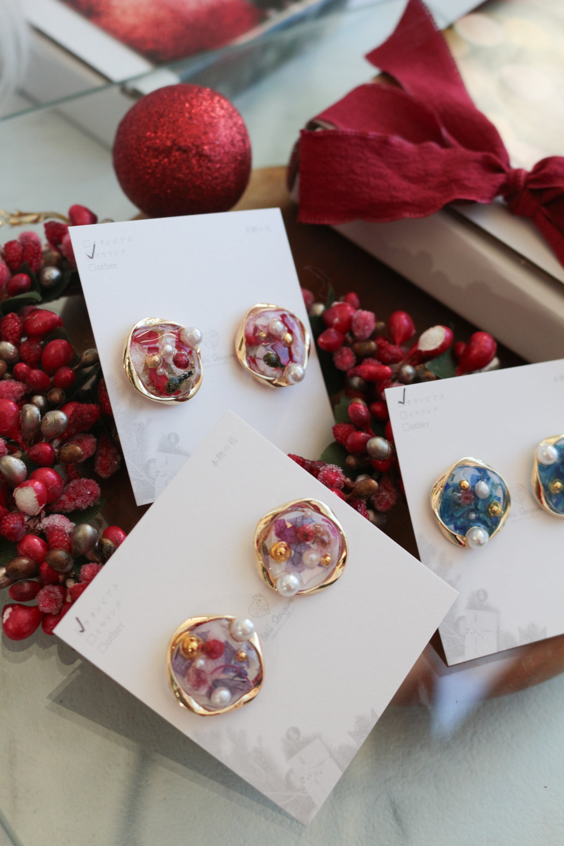 Bring the Christmas spirit around with you everywhere you go with these cute holiday themed earrings. The new 2025 Christmas edition of the flower medallions include more colors to give you the ability to match with any outfit. A clear resin medallion filled with flowers and beads that are stylish enough to pair with any outfit.
