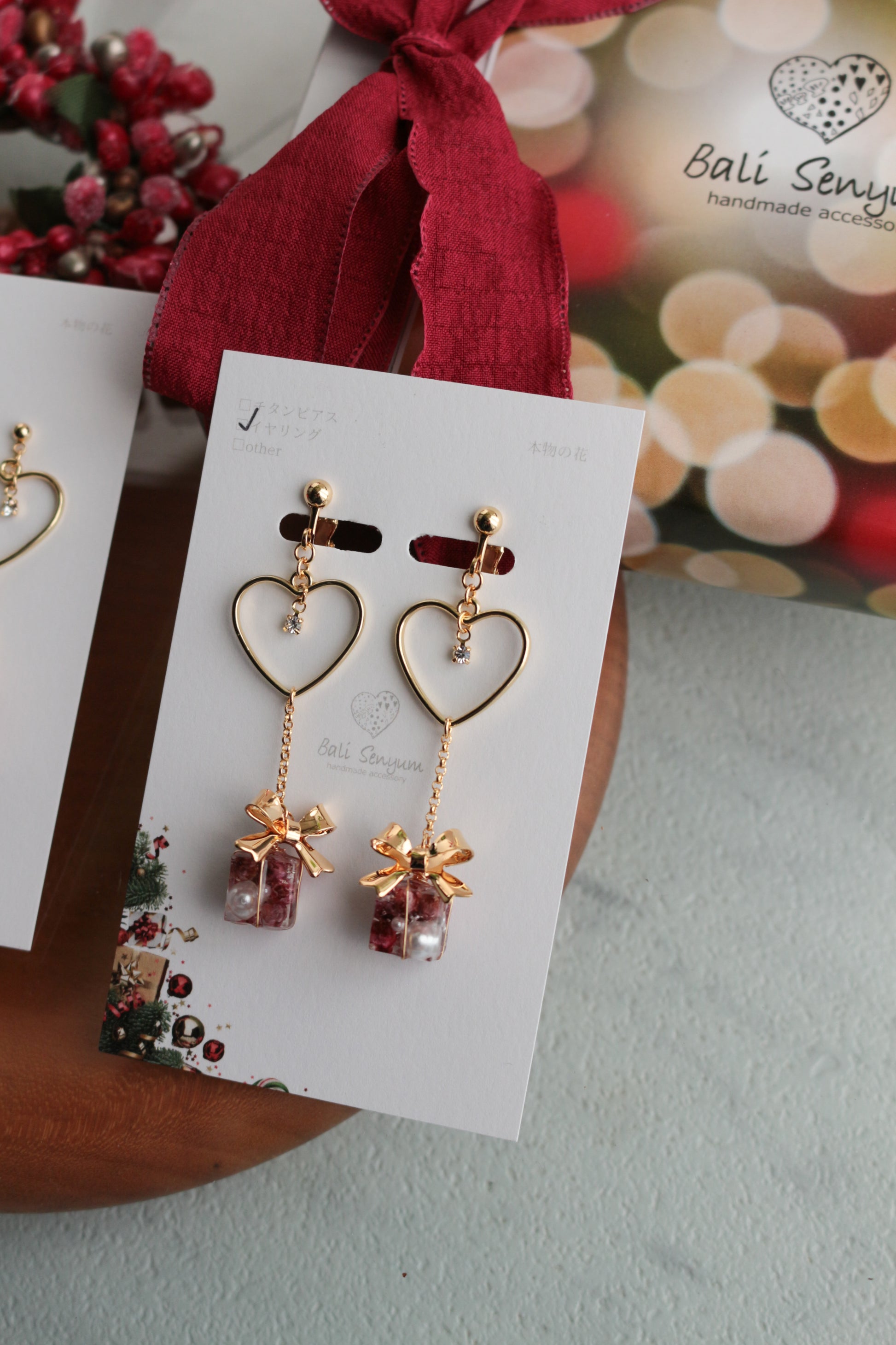 A clear resin present filled with flowers and jewels topped with a golden bow hanging below a golden heart. This cute holiday earring will add the Christmas spirit to any outfit.