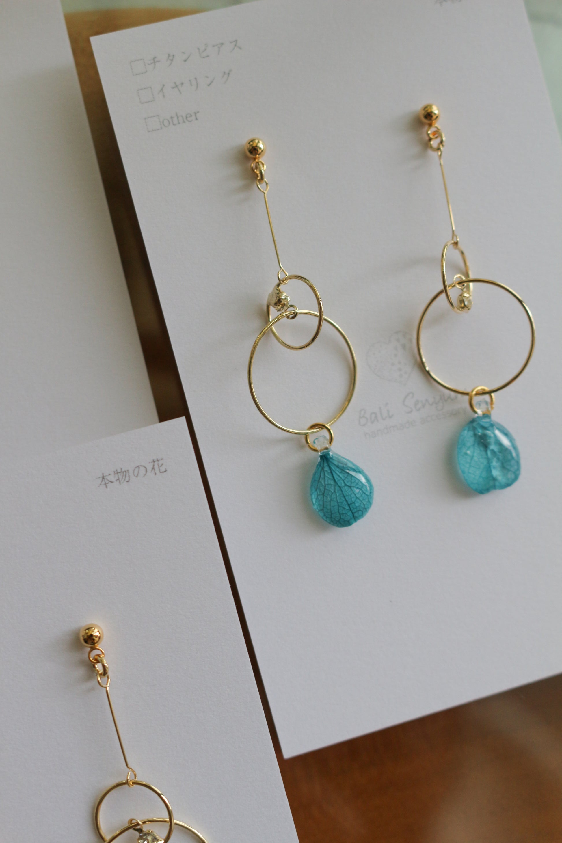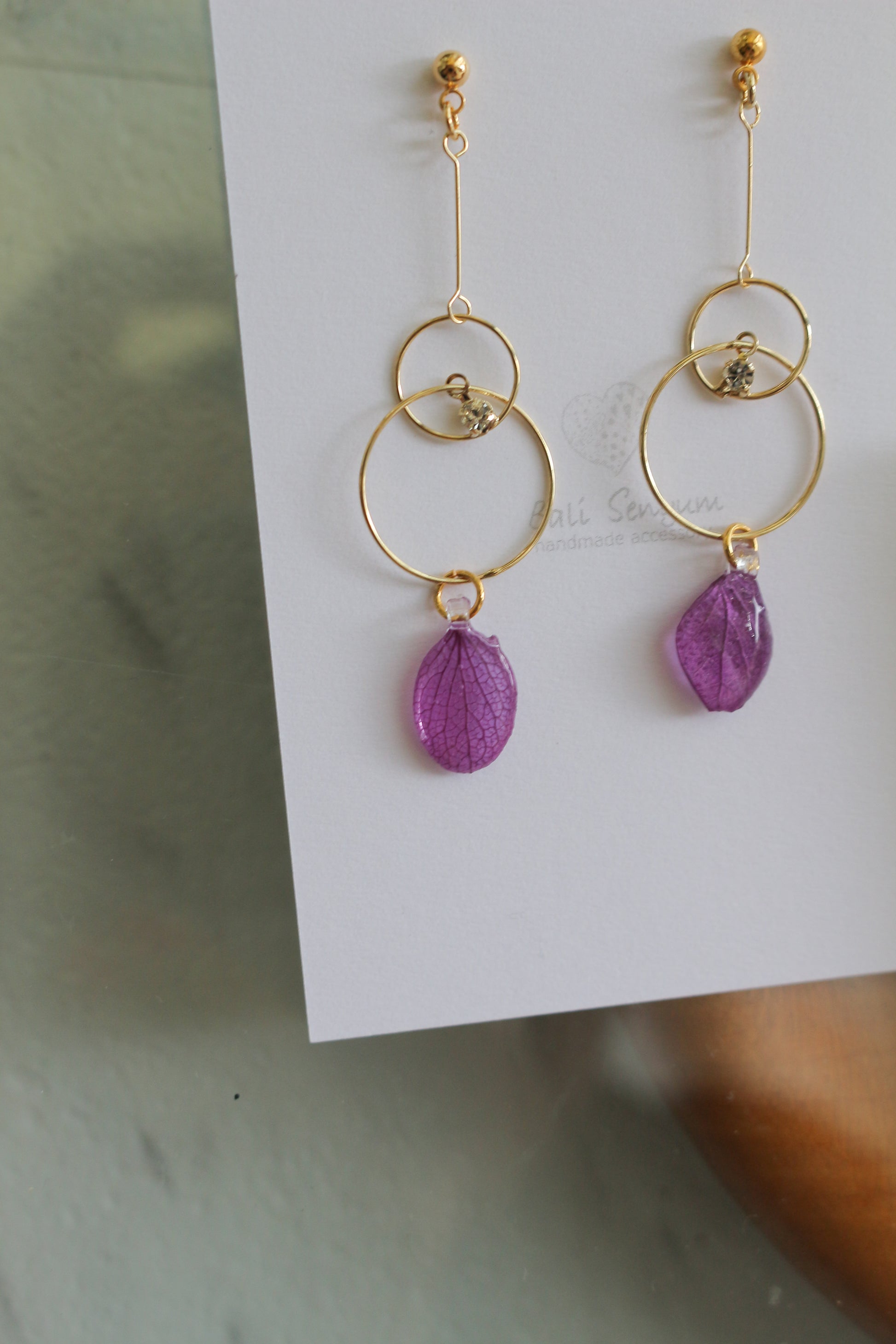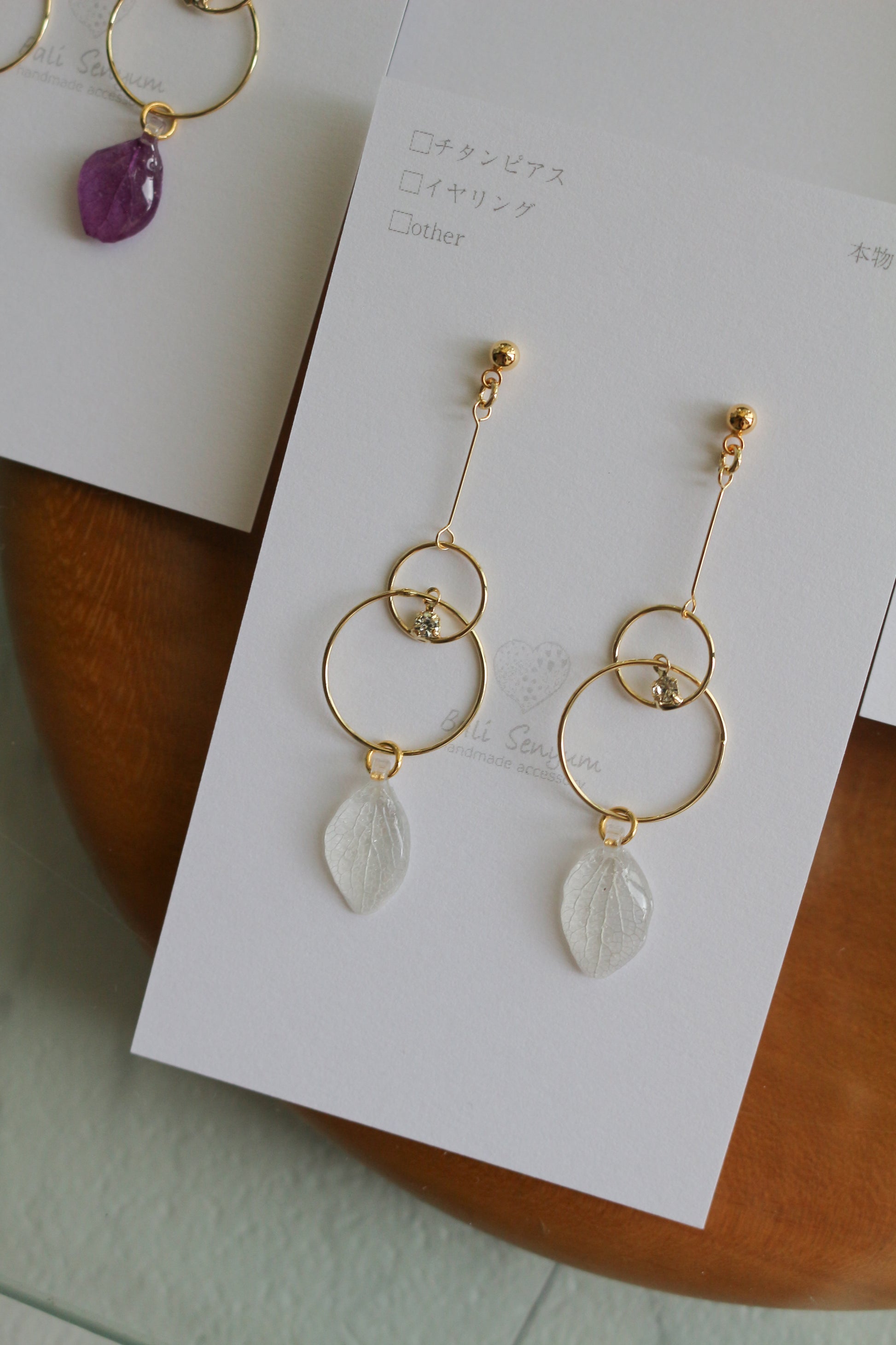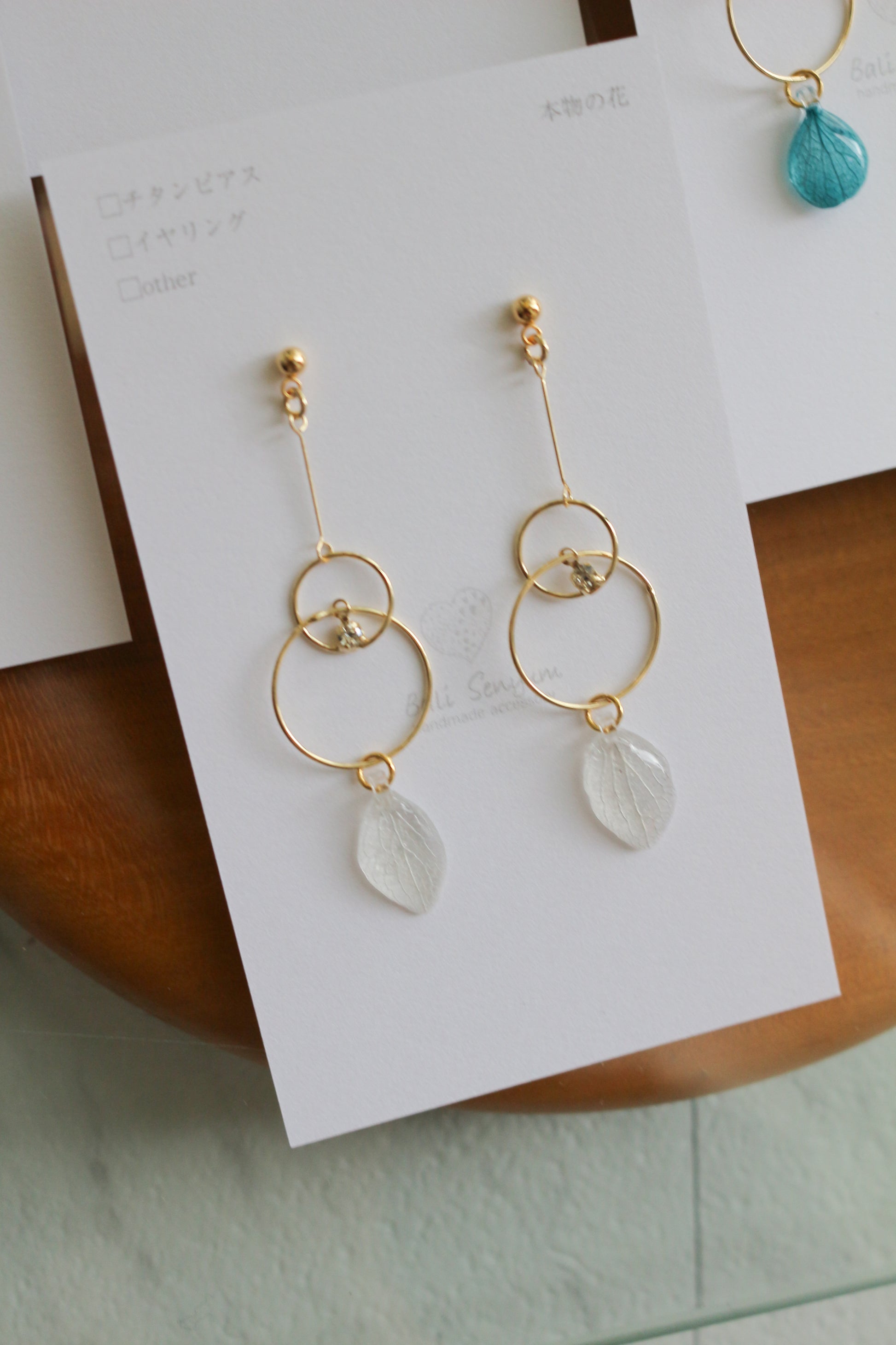 Hydrangea petals dangle from golden hoops.