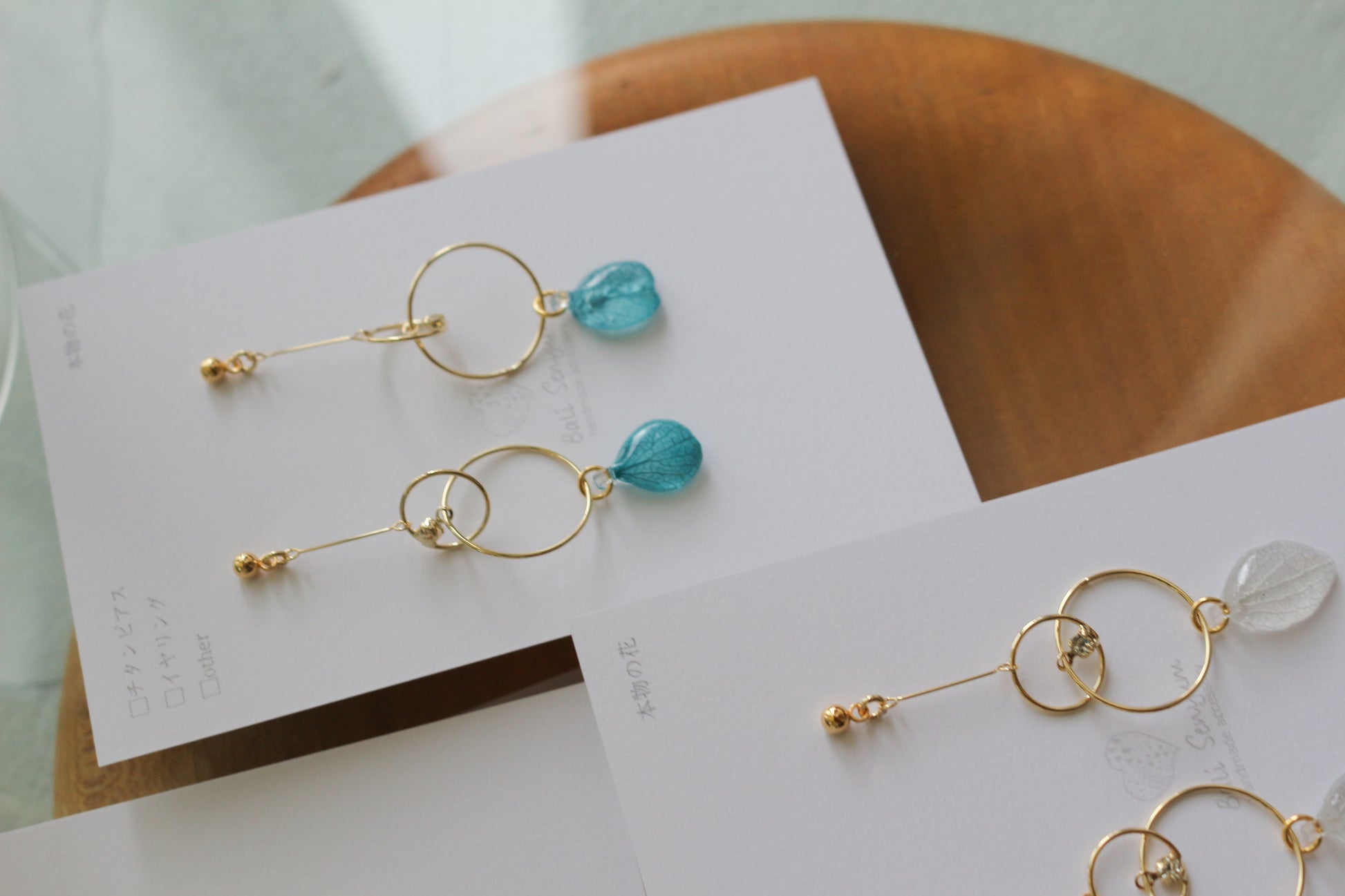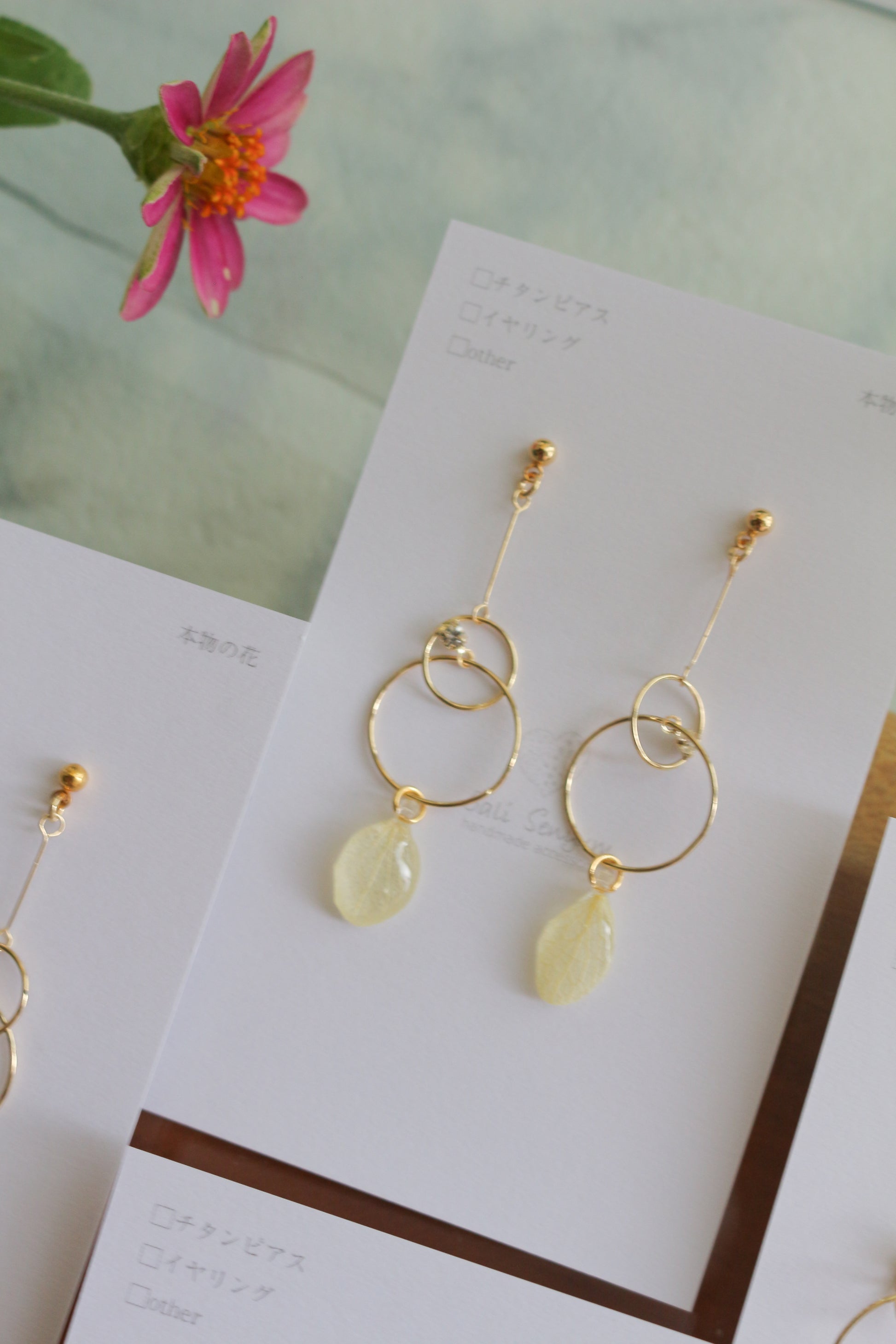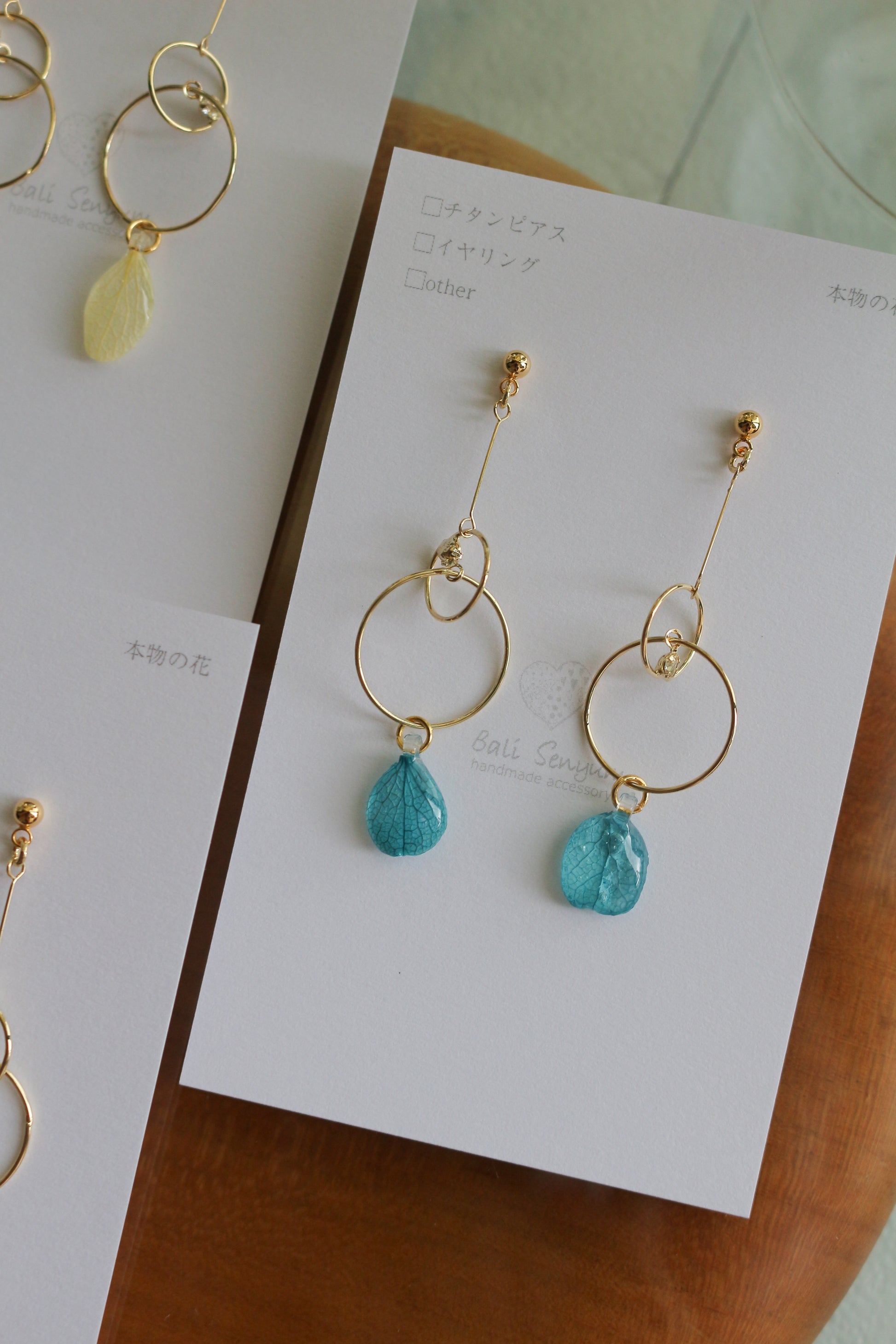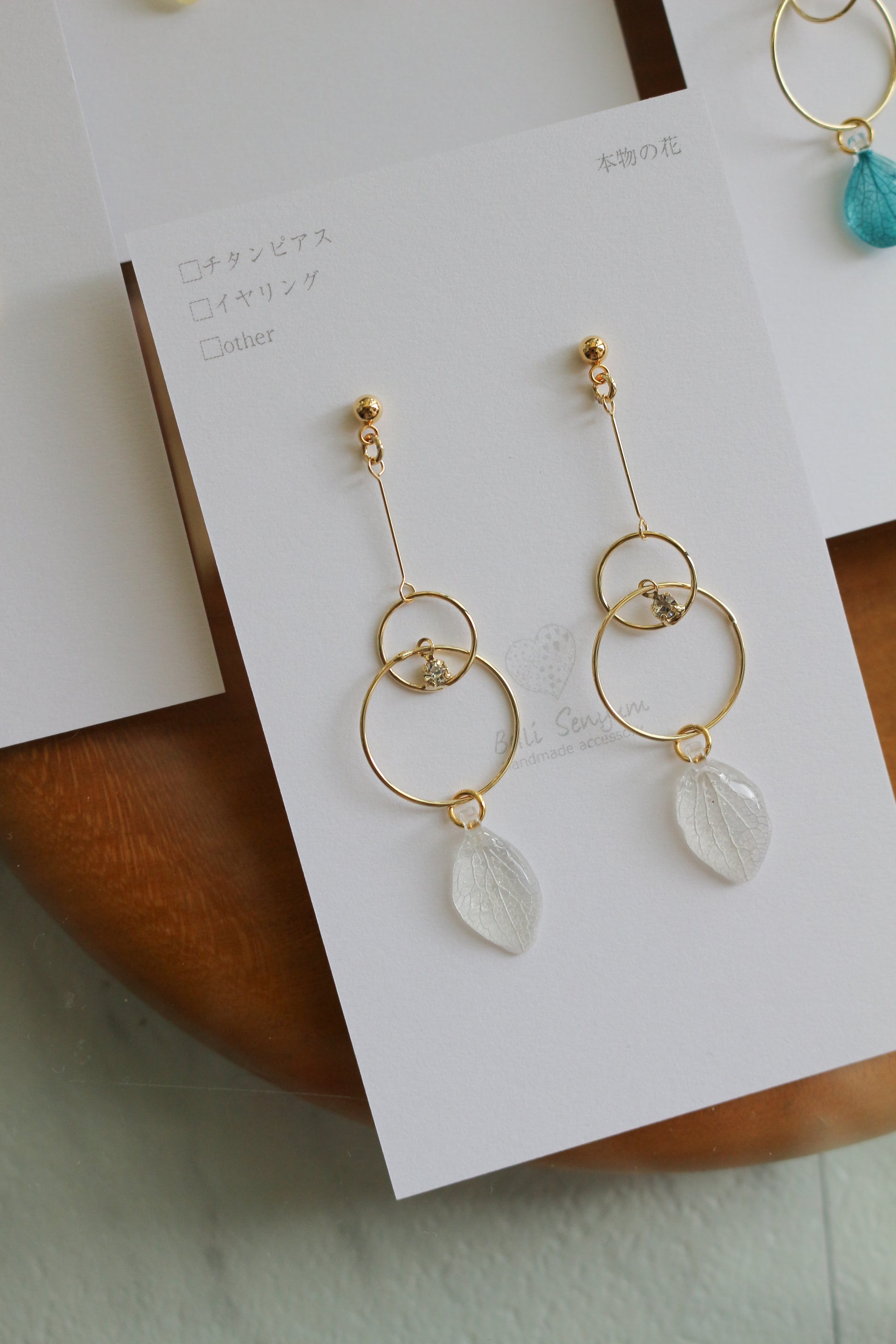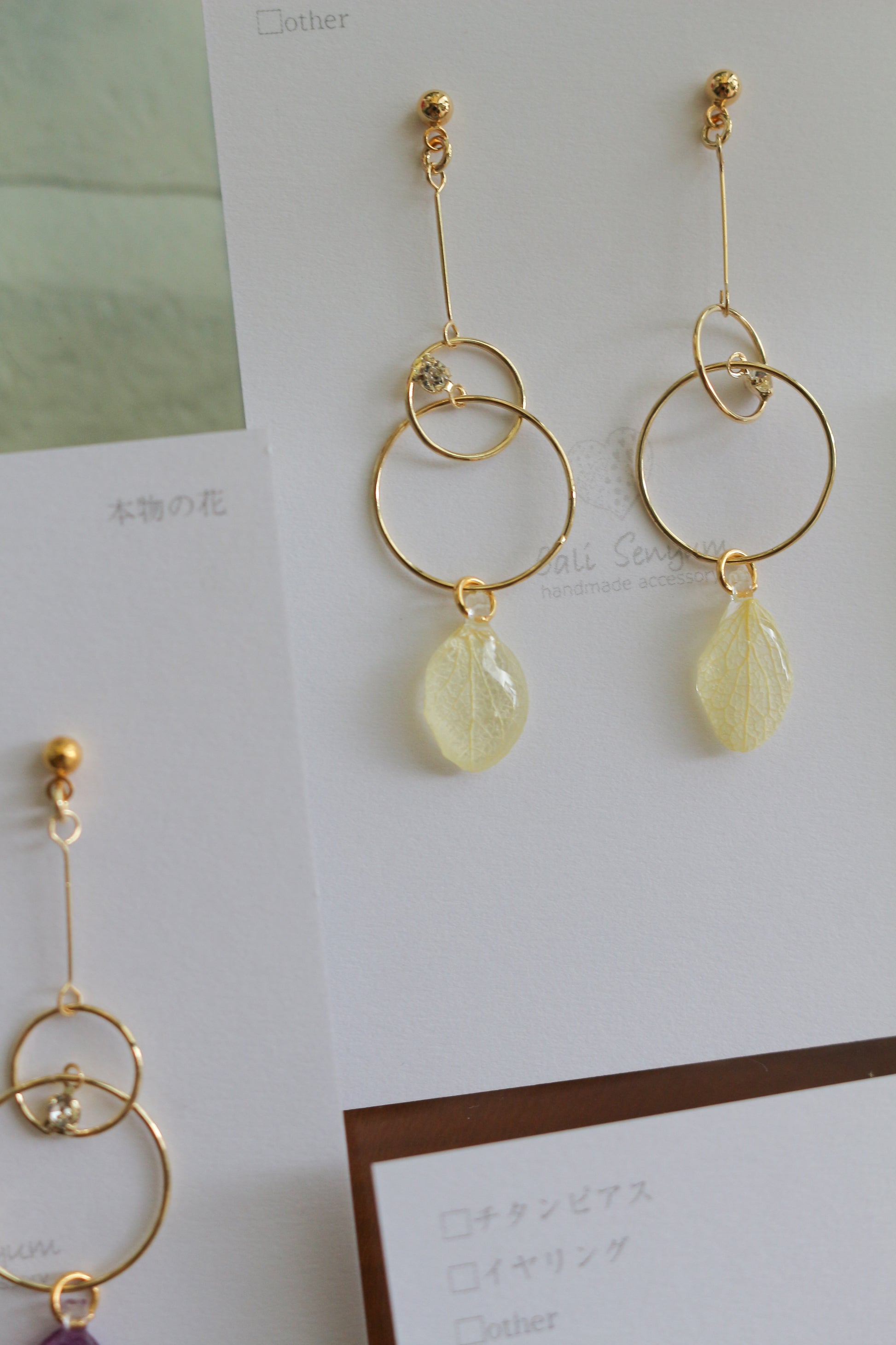 Hydrangea petals dangle from golden hoops.