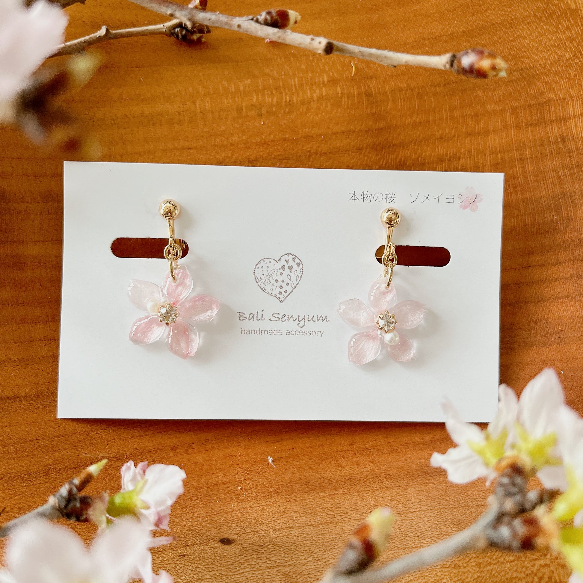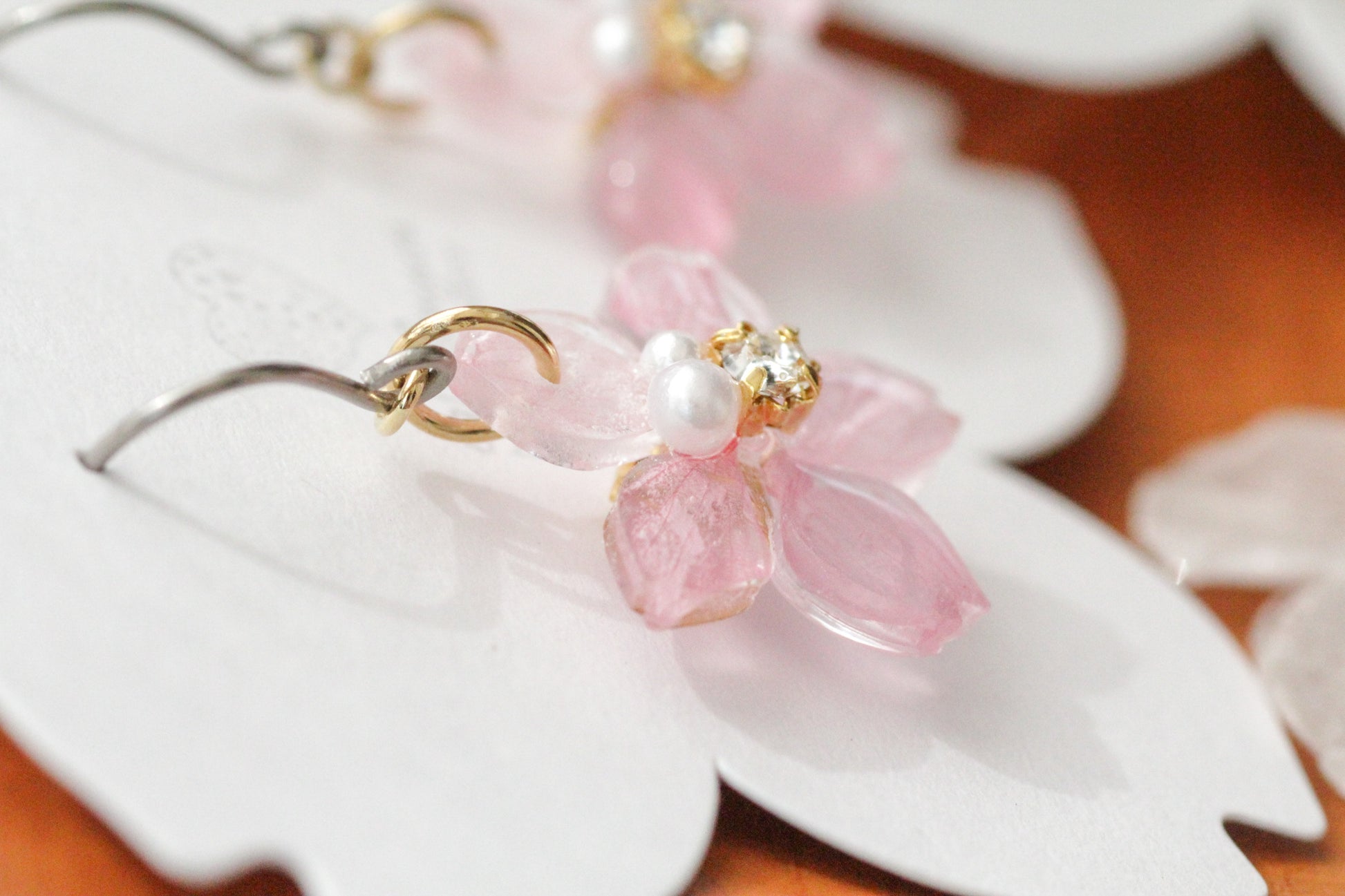 Someyoshino sakura petals were used to create these classic sakura earrings. With a small gem and pearl in the center they dangle from a drop peirce or a screw-back clip-on. Whether you wear your hair up or down, these elegant little flowers will be a gorgeous accent to a sunny spring day.