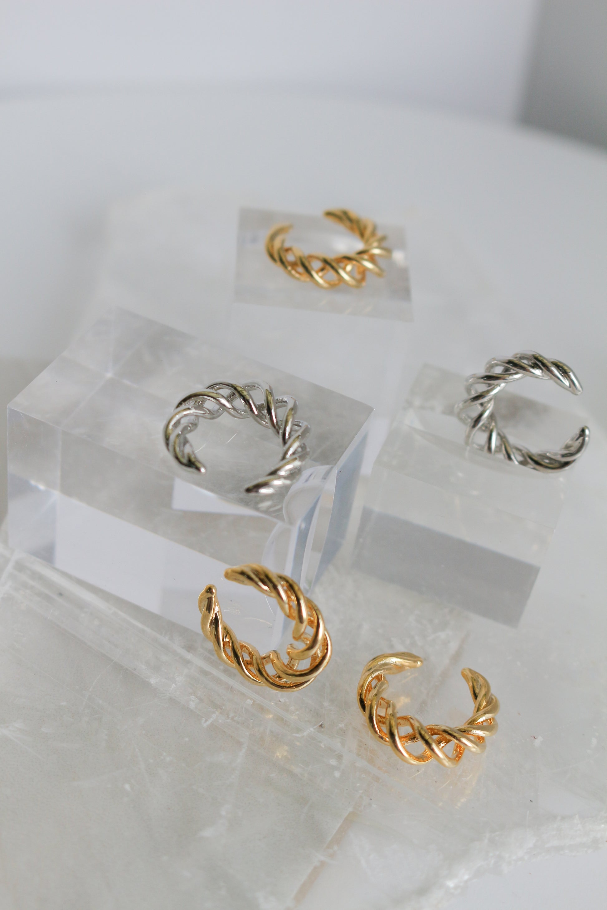 Braided metal crescent shaped ear cuff. A simple but elegant design that works as a perfect accent piece alone or with other earrings.