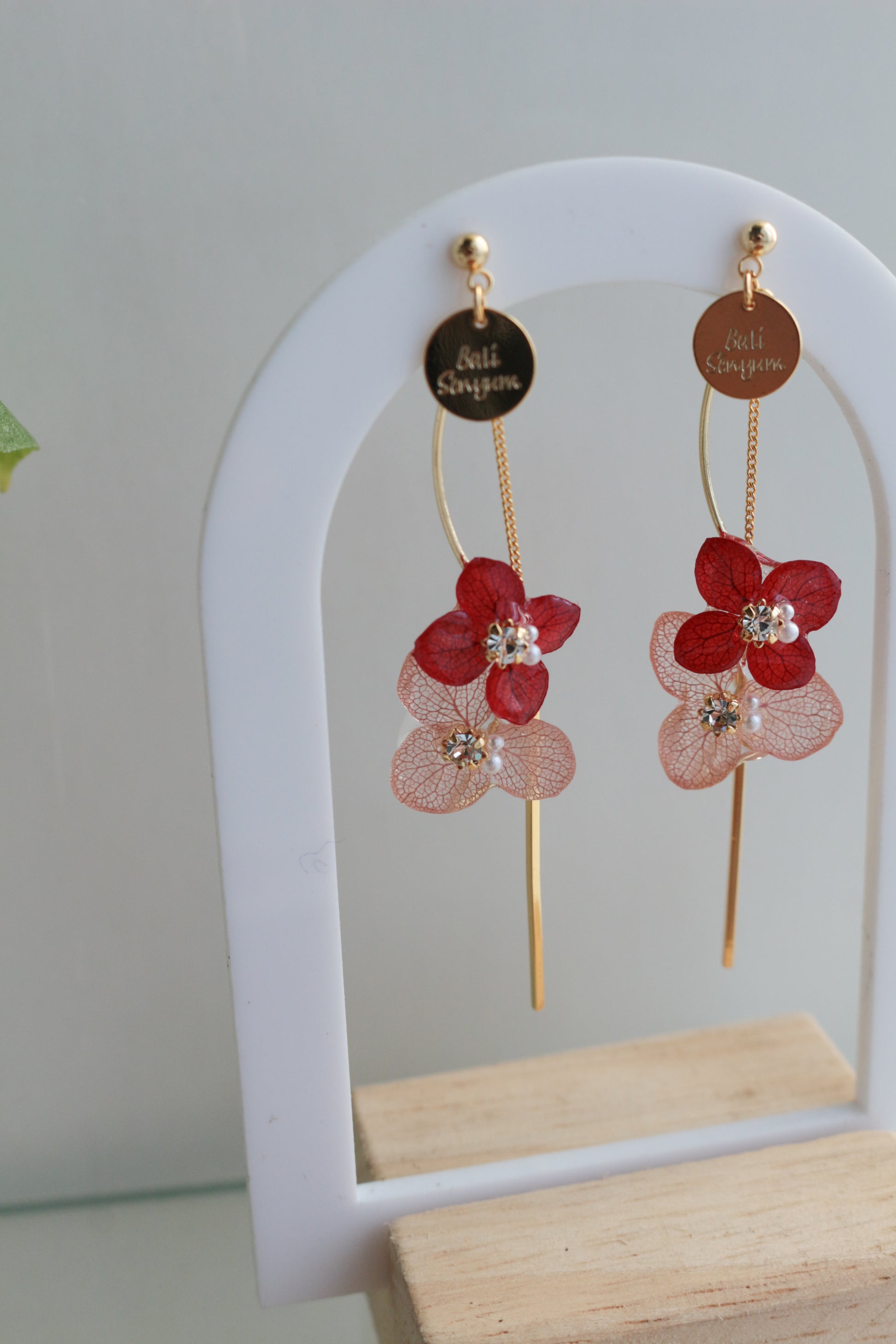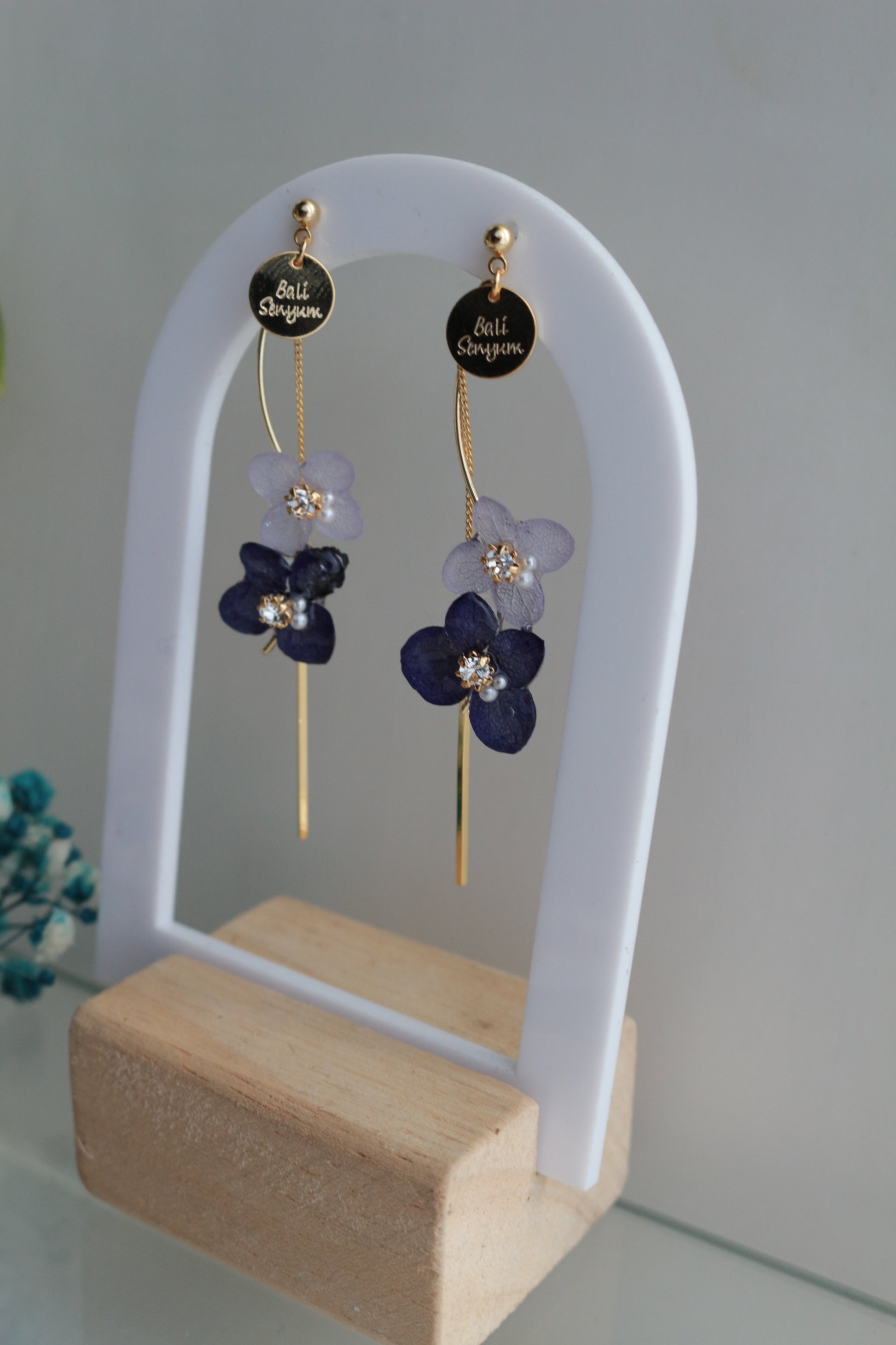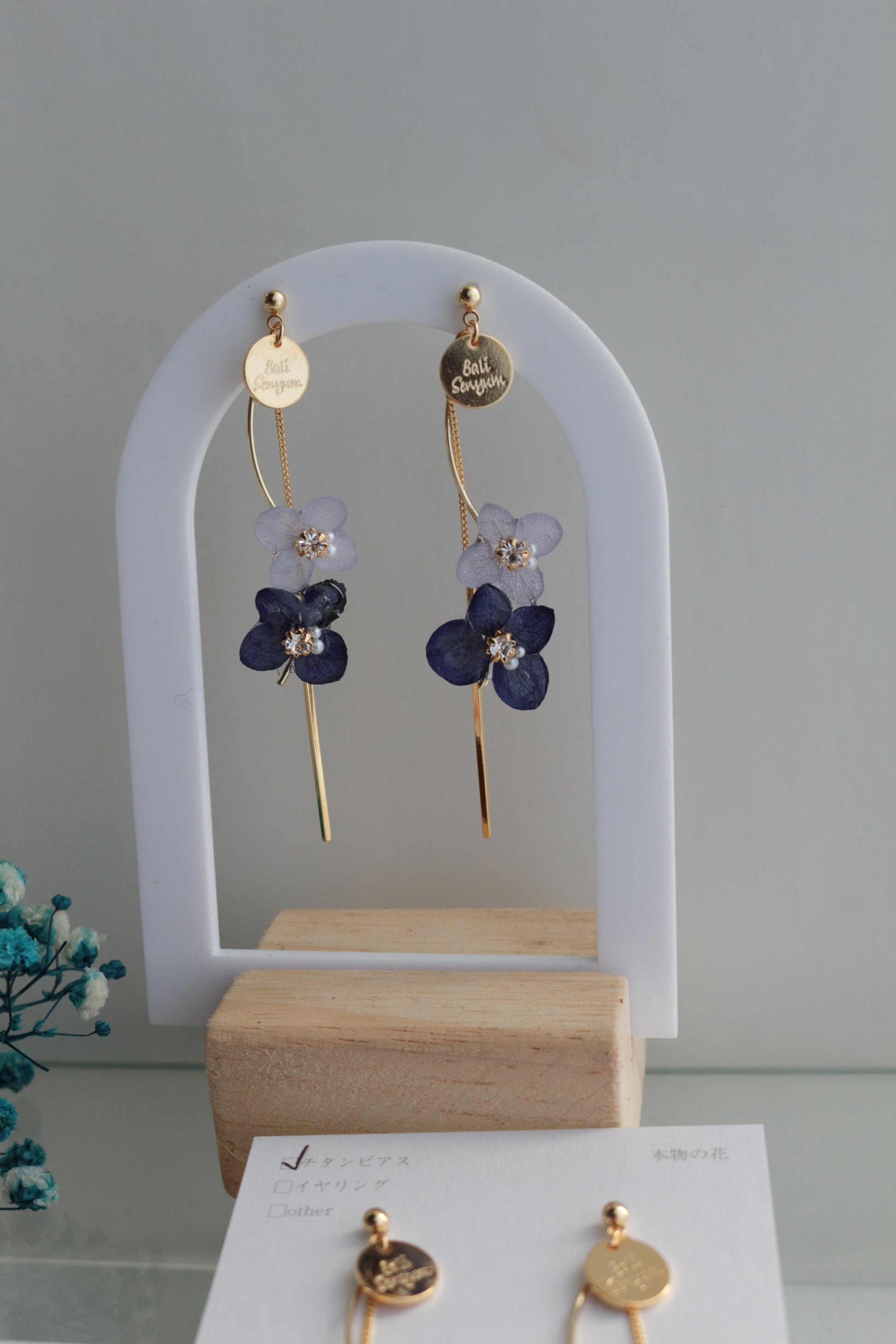 Two hydrangea petal flowers adorn this beautiful earring along with a flowing golden chain and charm.