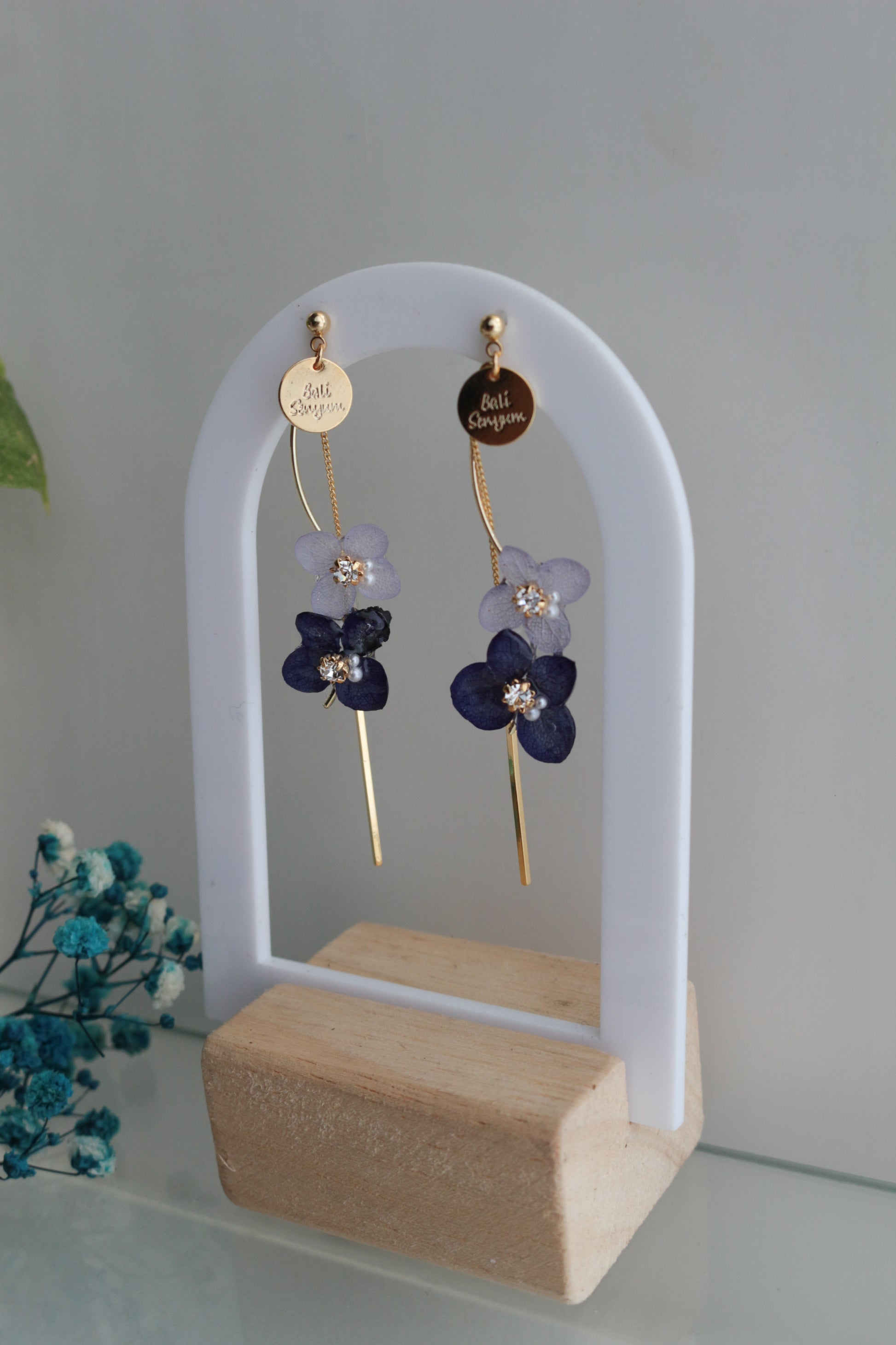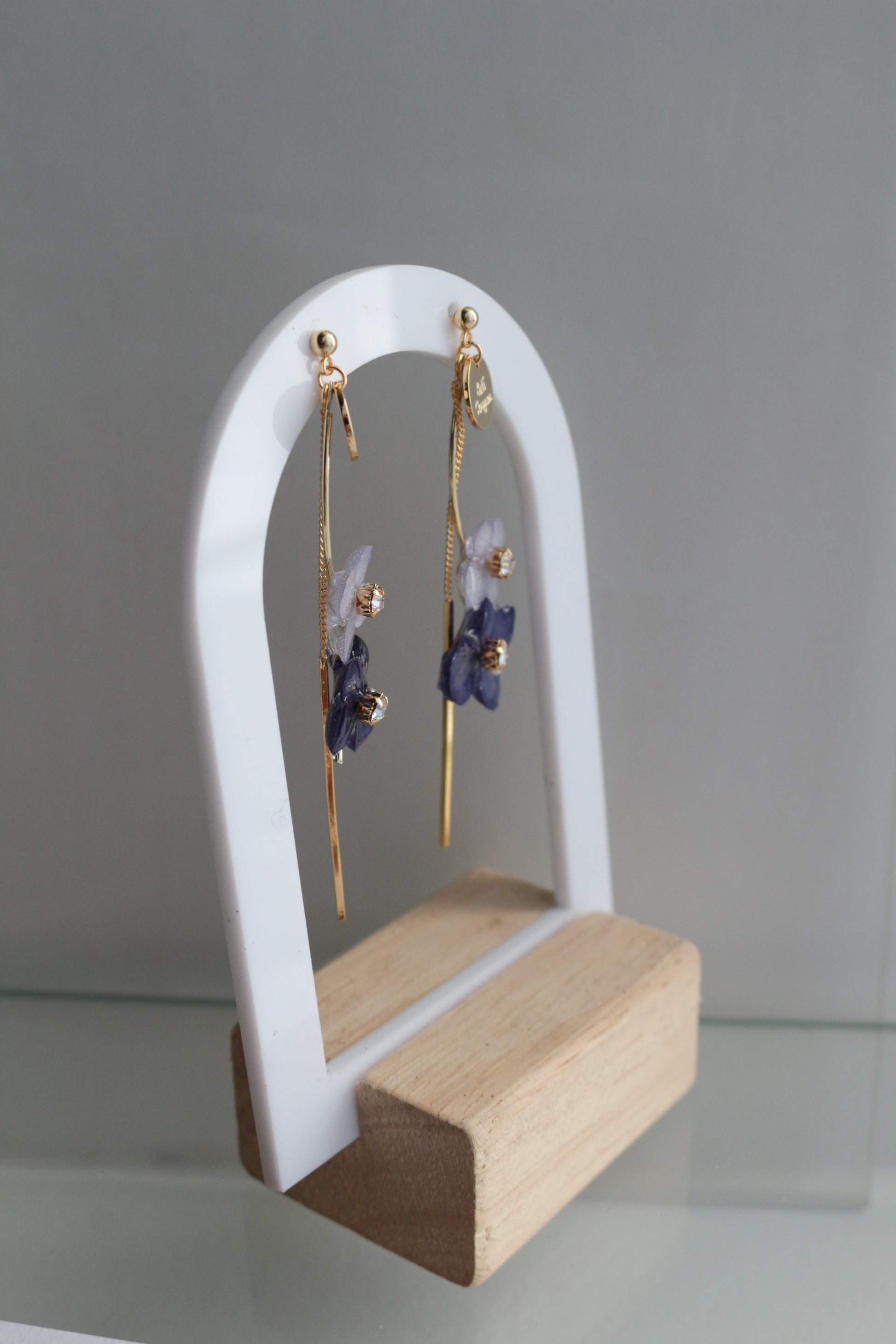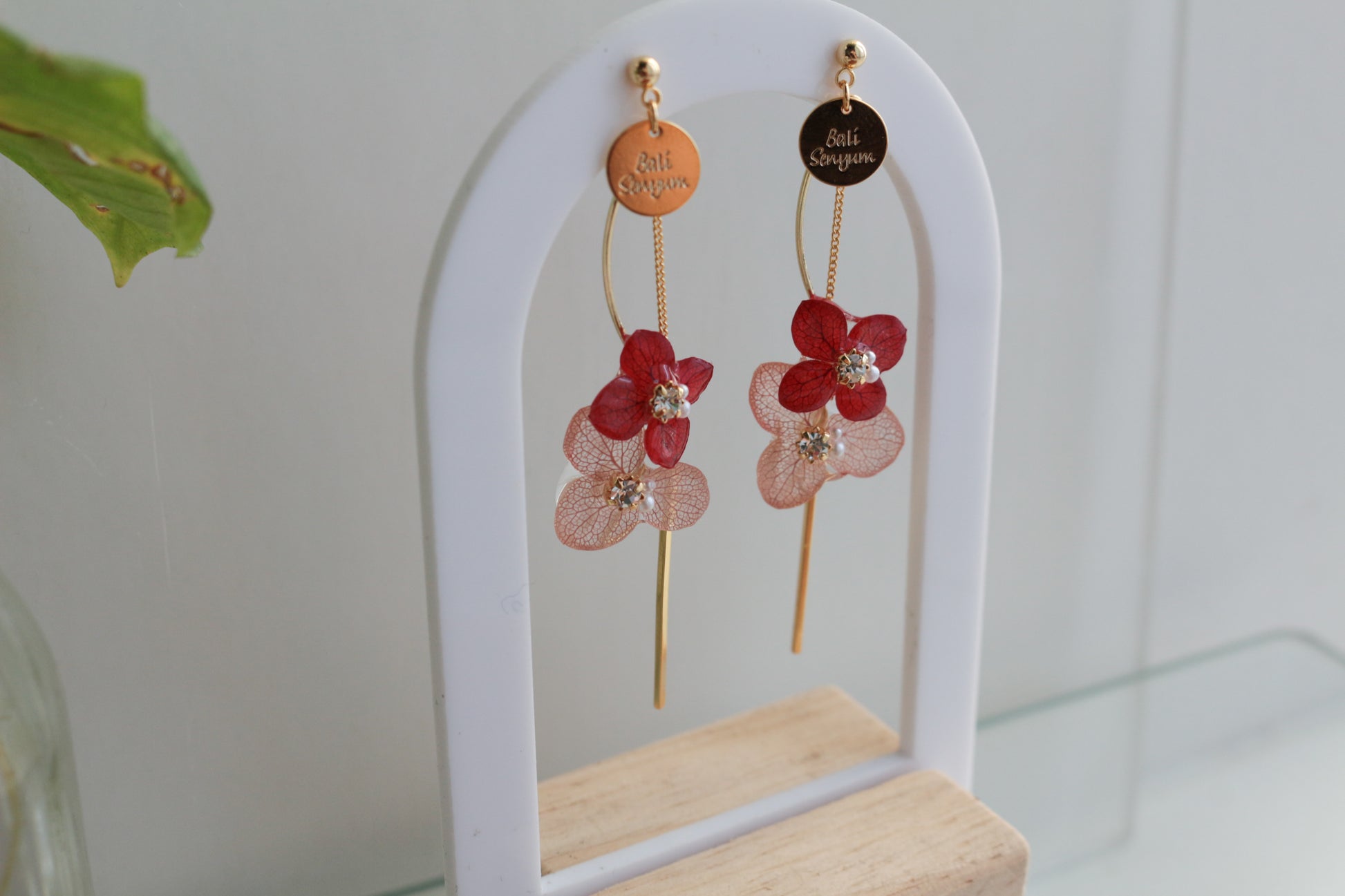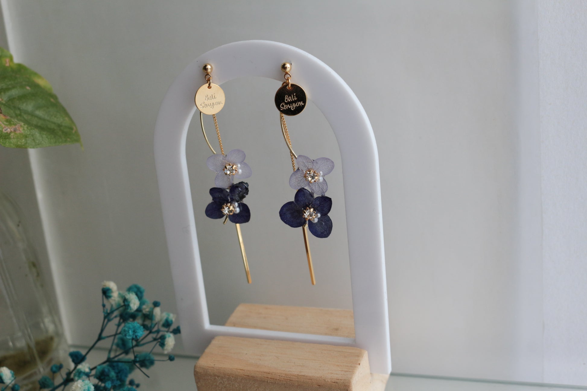 Two hydrangea petal flowers adorn this beautiful earring along with a flowing golden chain and charm.