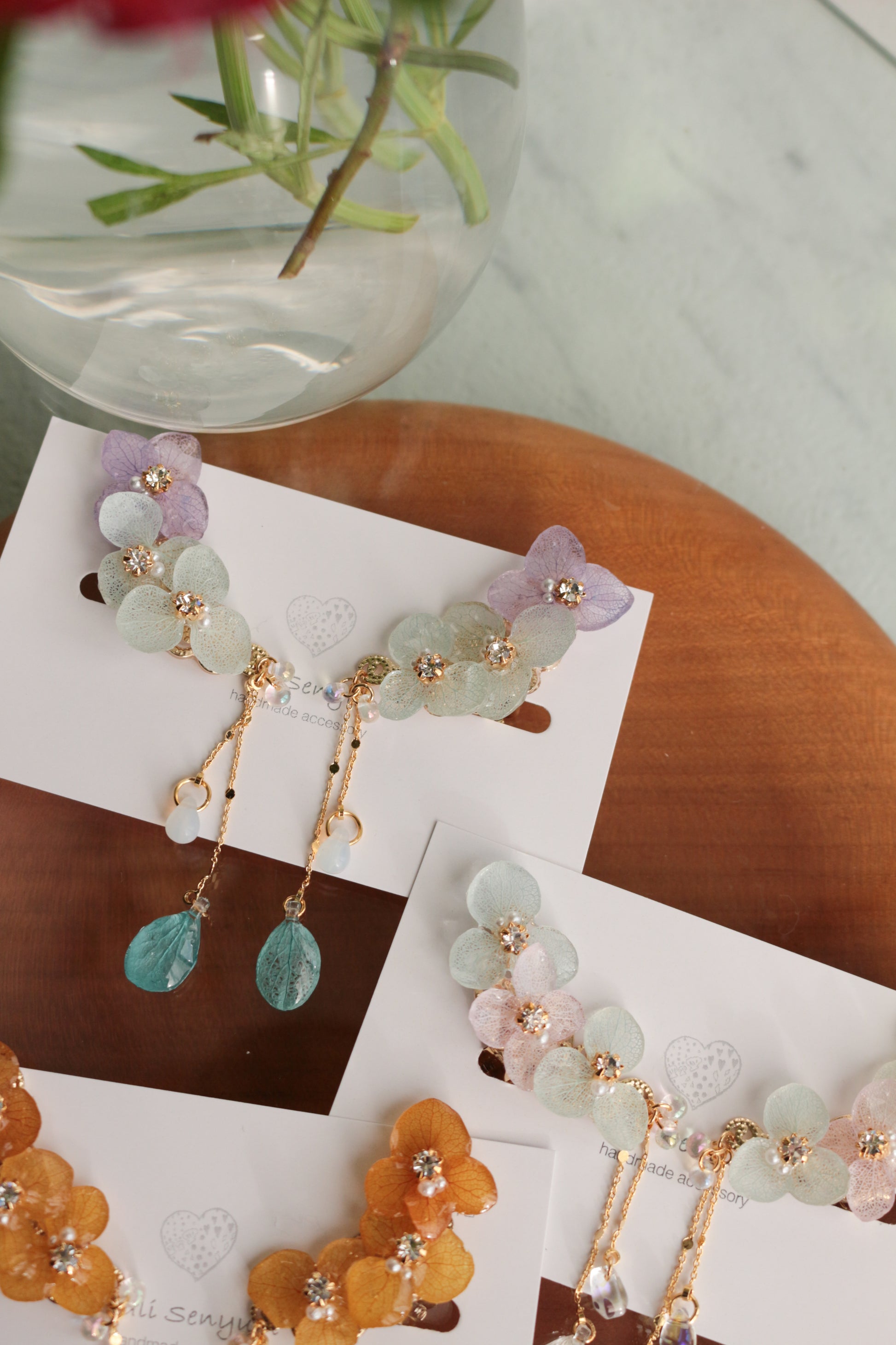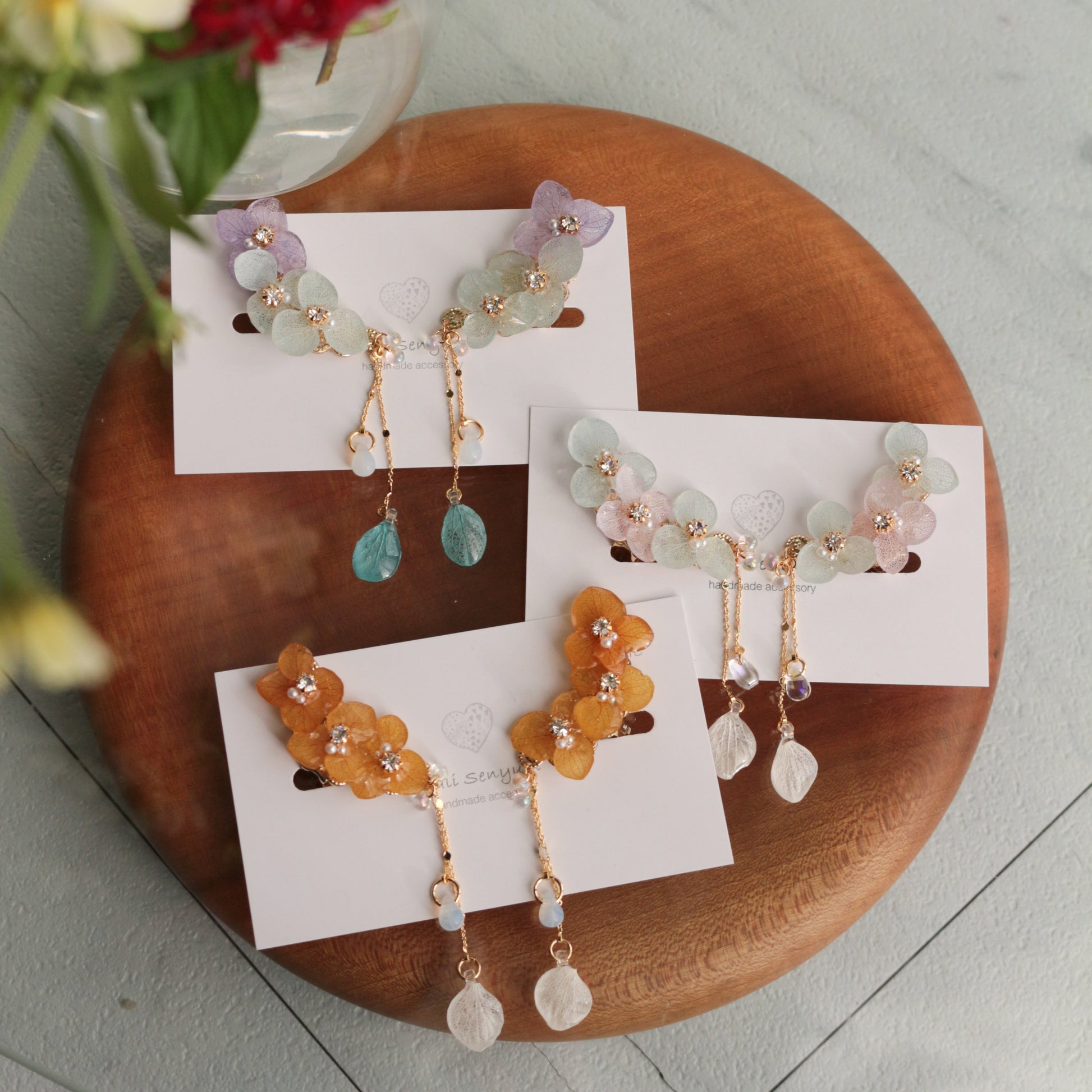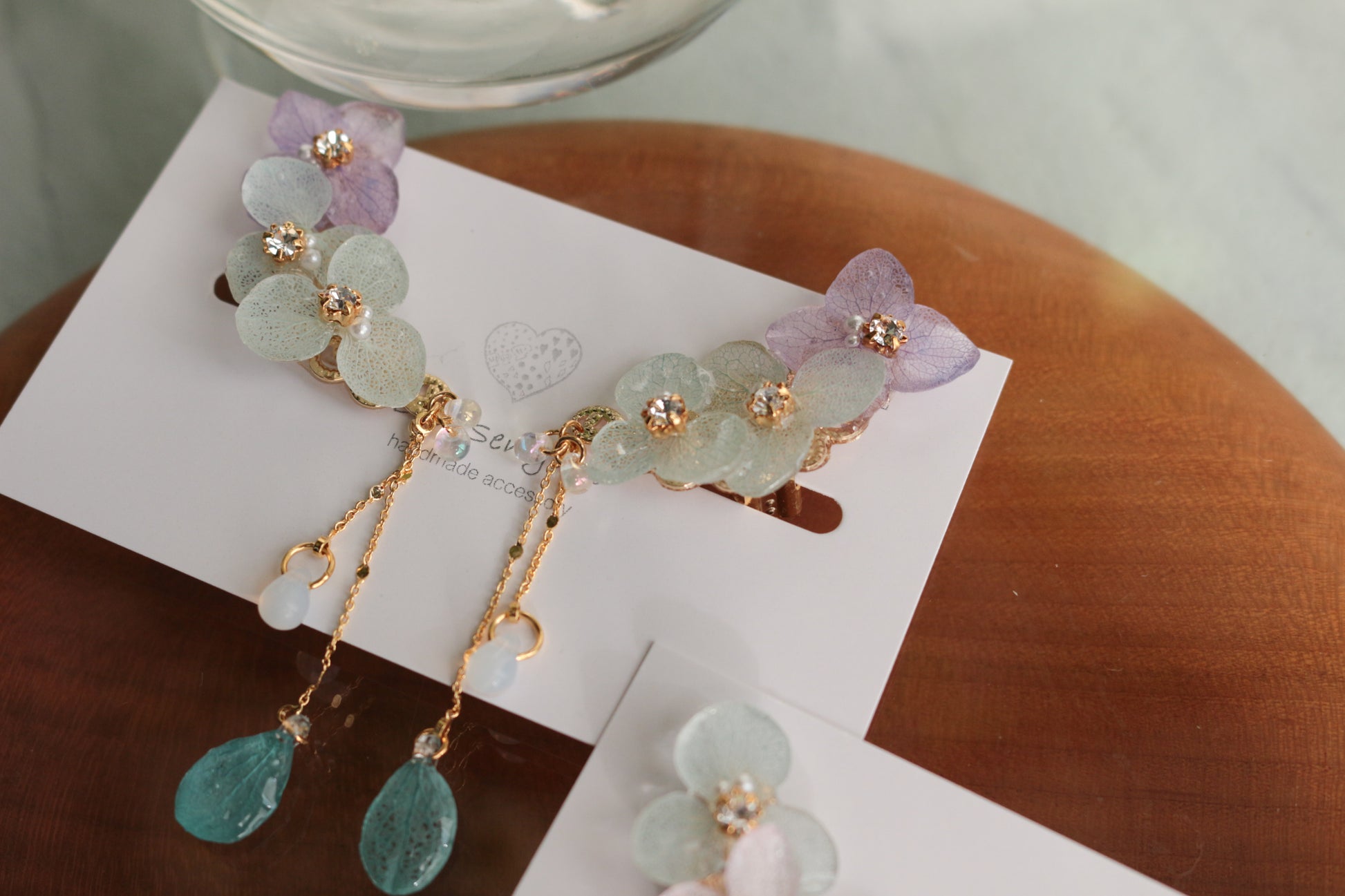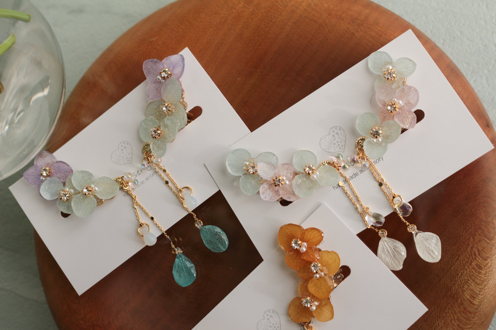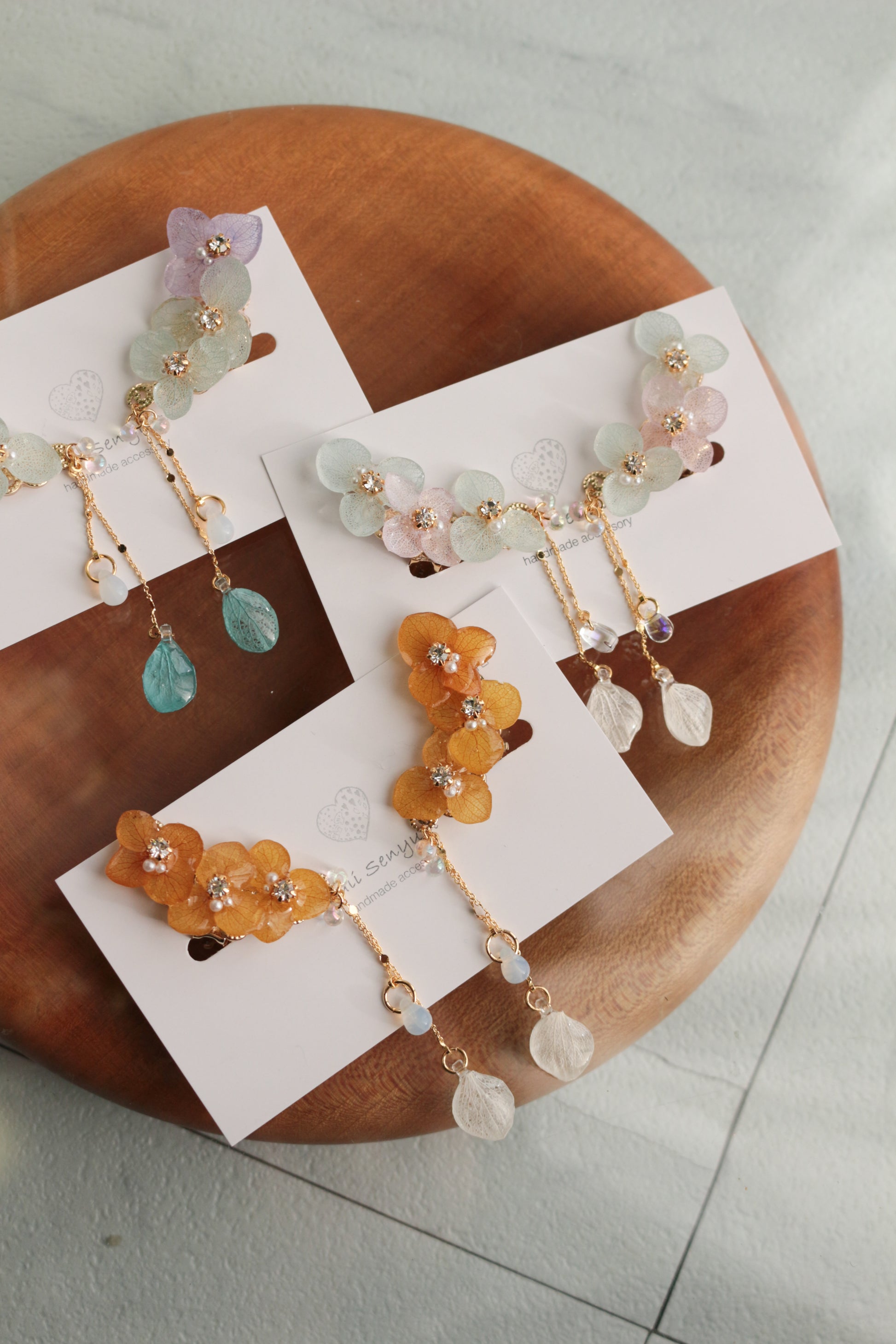 Made with real hydrangea petals to create three flowers with a flowing flower petal swinging from a golden chain.