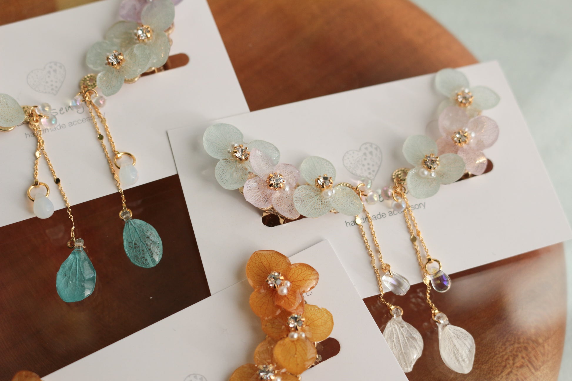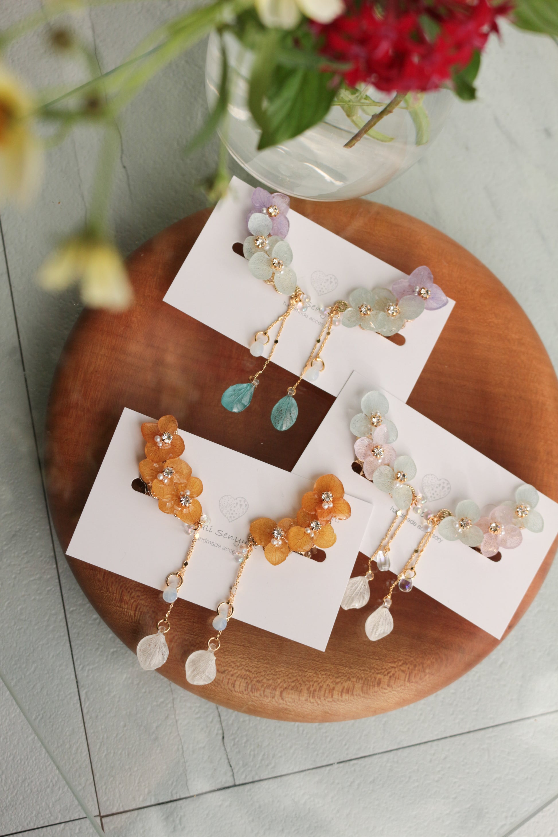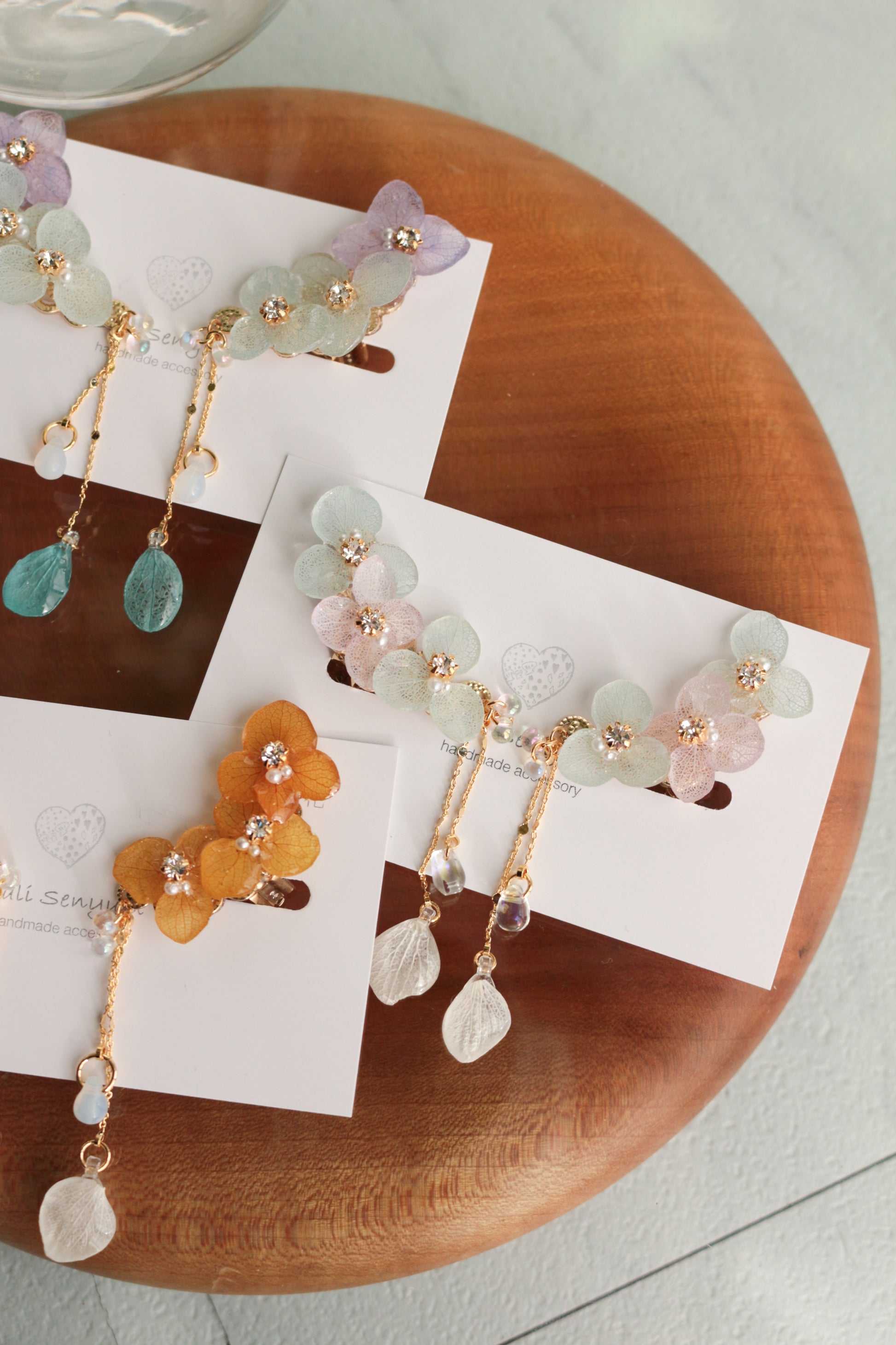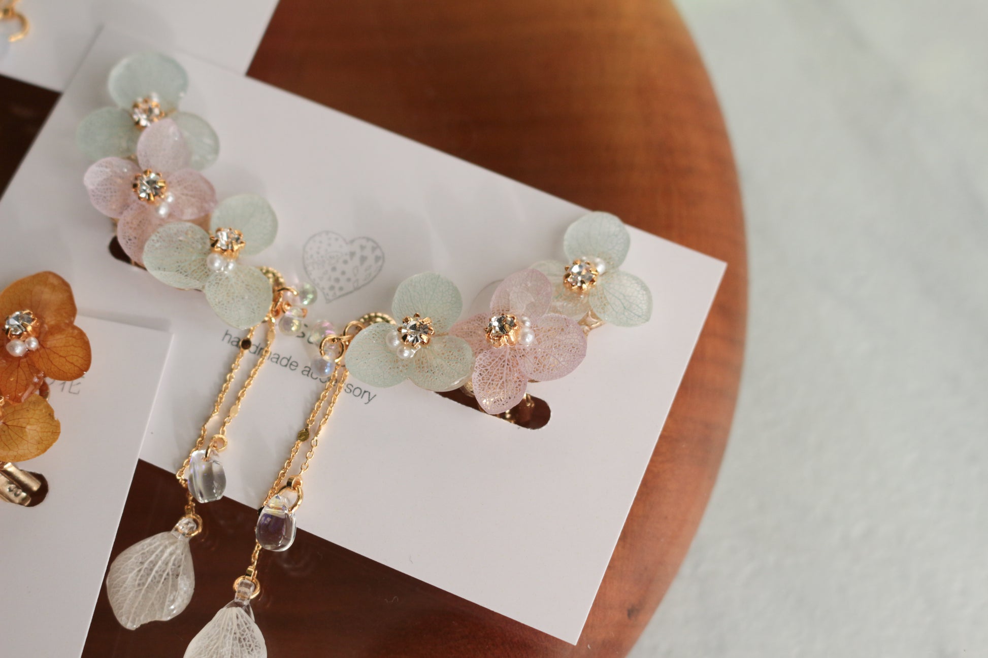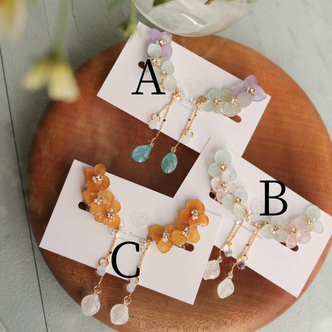 Made with real hydrangea petals to create three flowers with a flowing flower petal swinging from a golden chain.