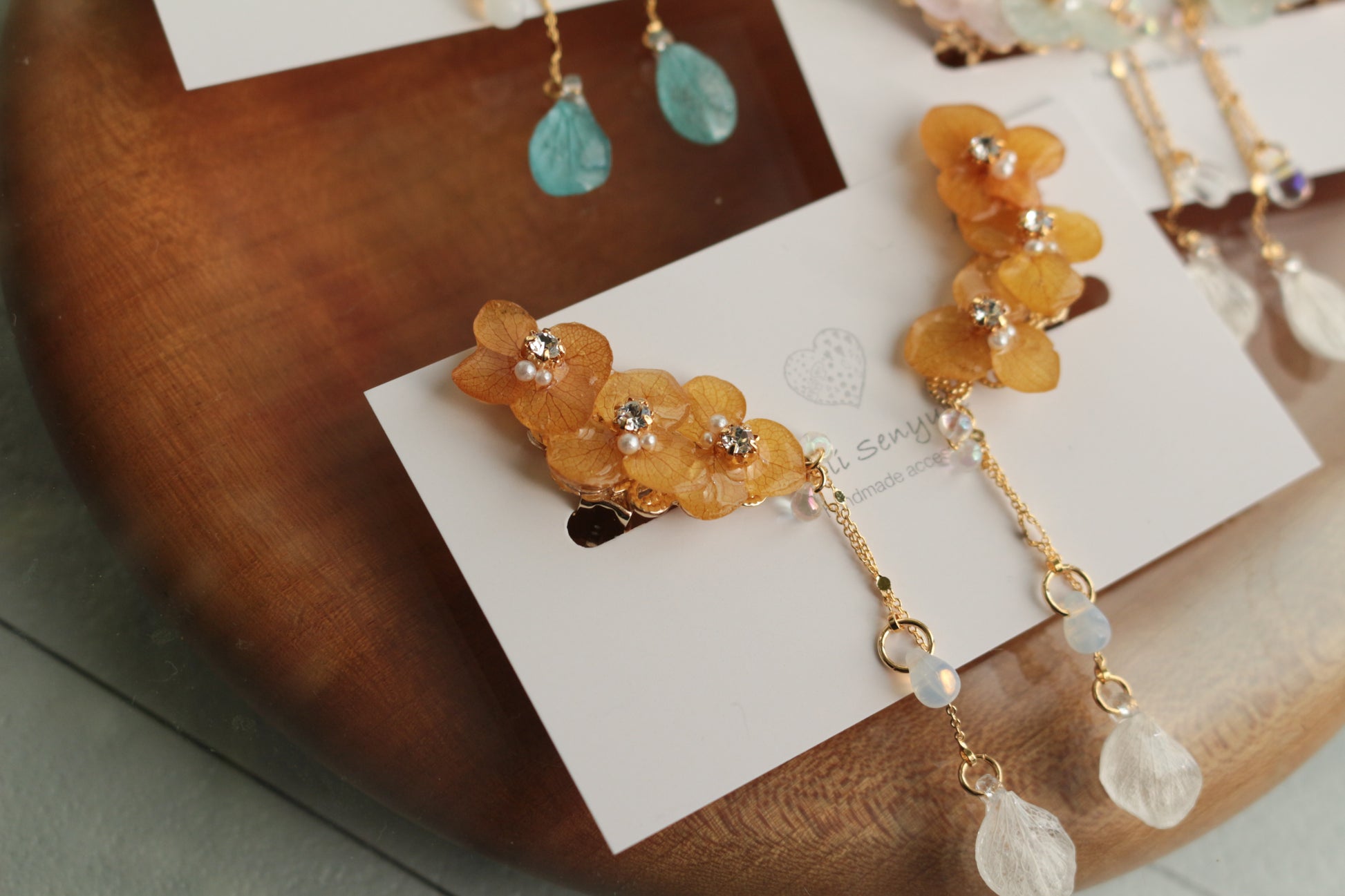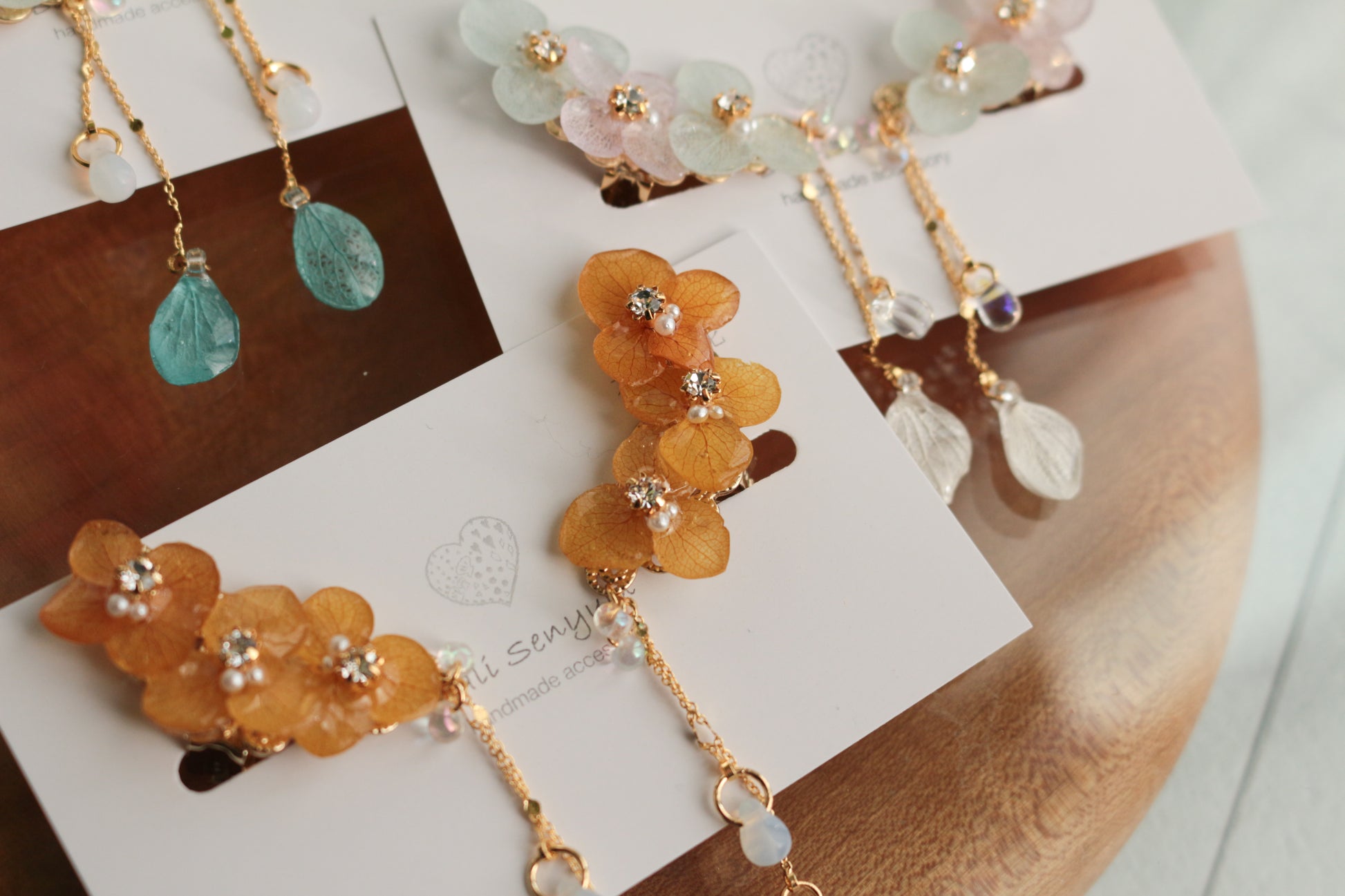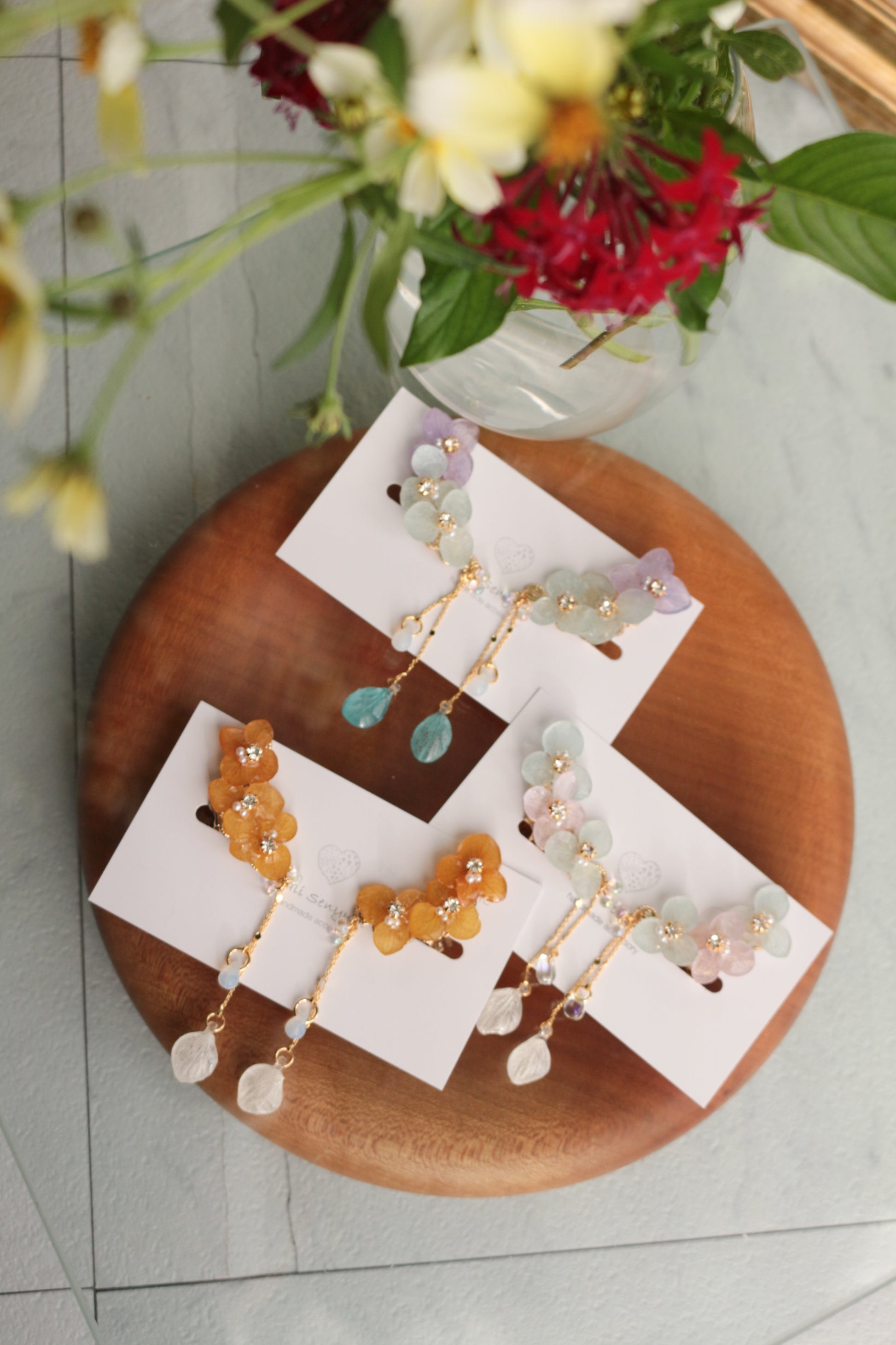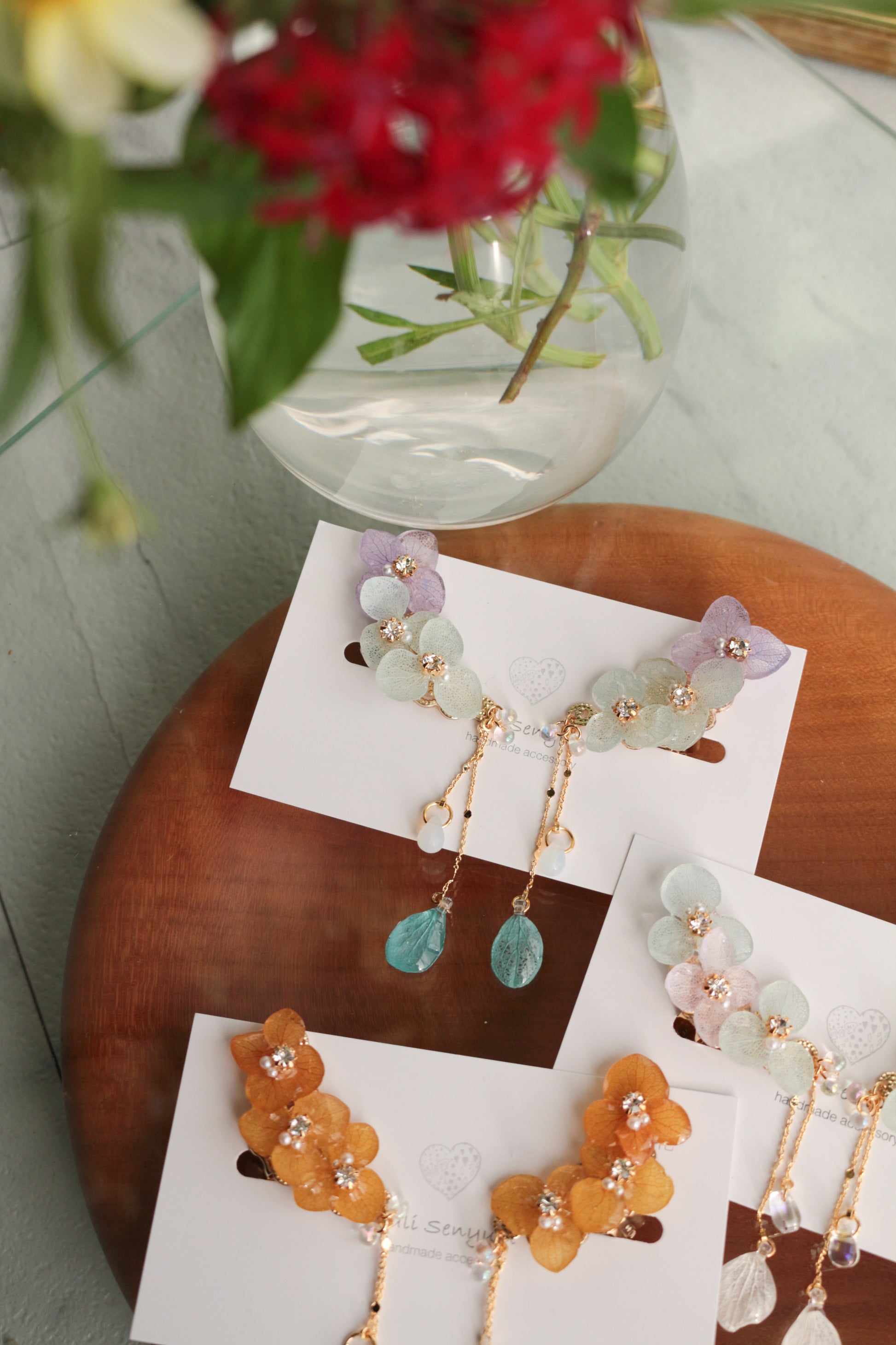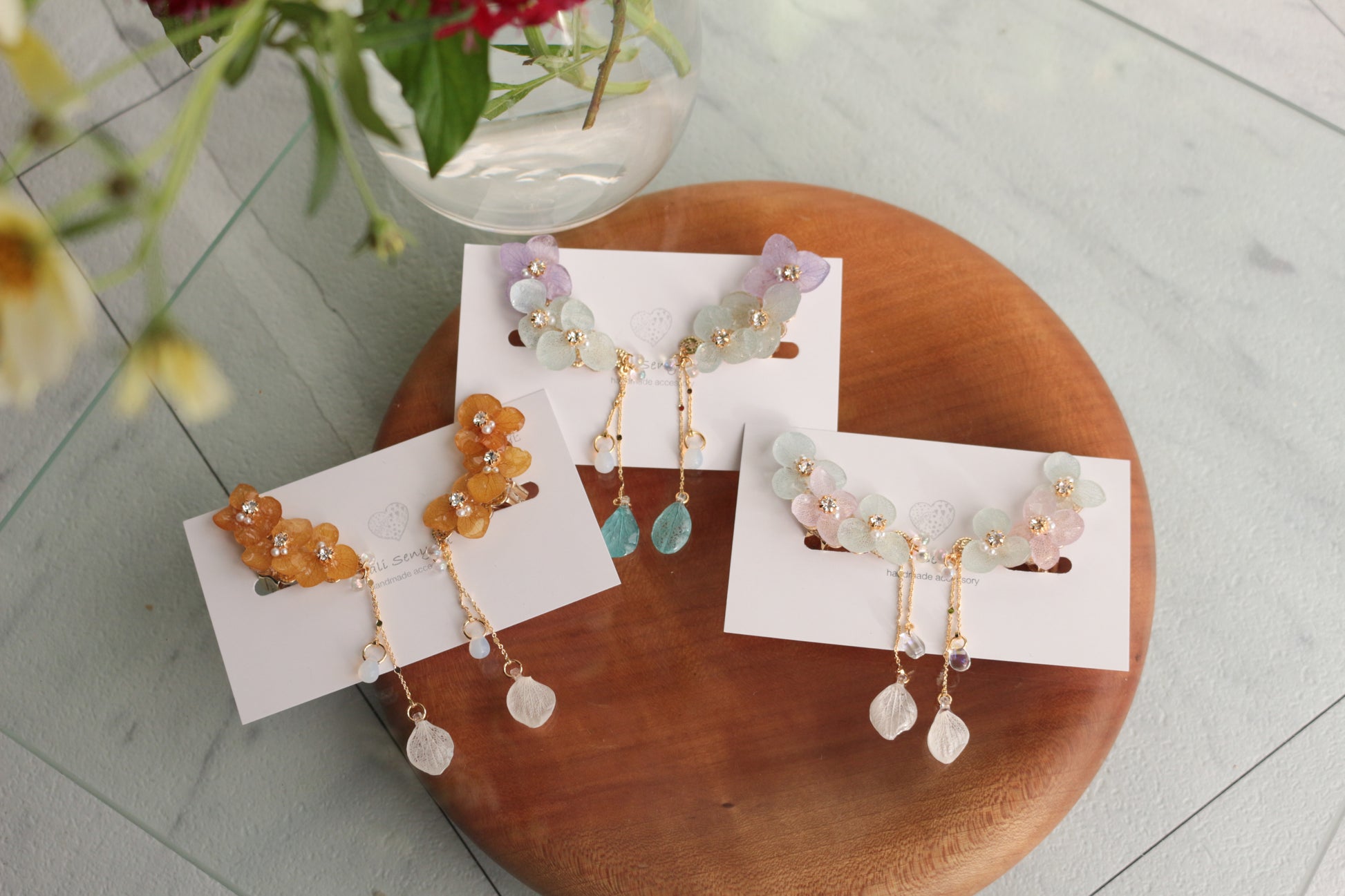 Made with real hydrangea petals to create three flowers with a flowing flower petal swinging from a golden chain.