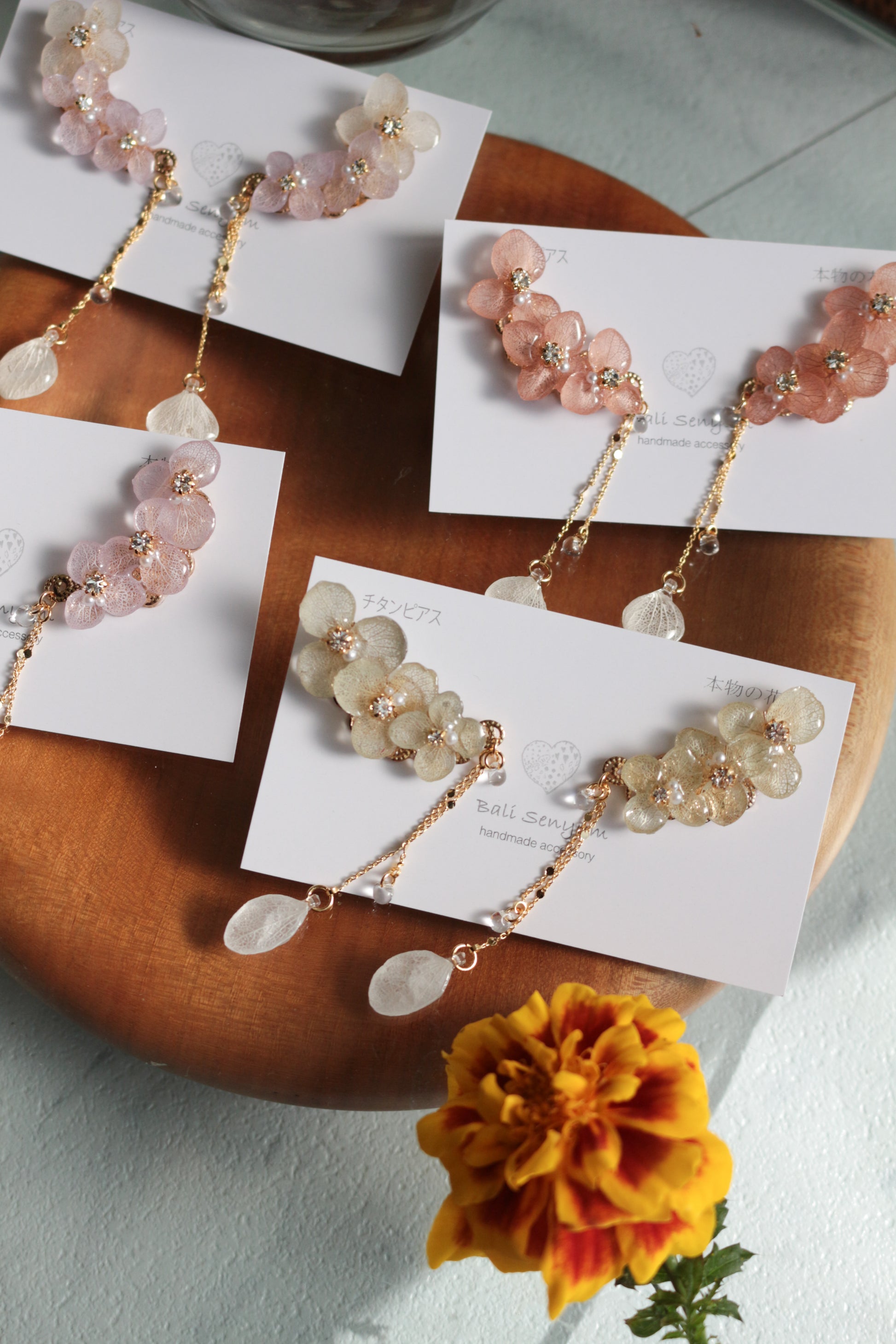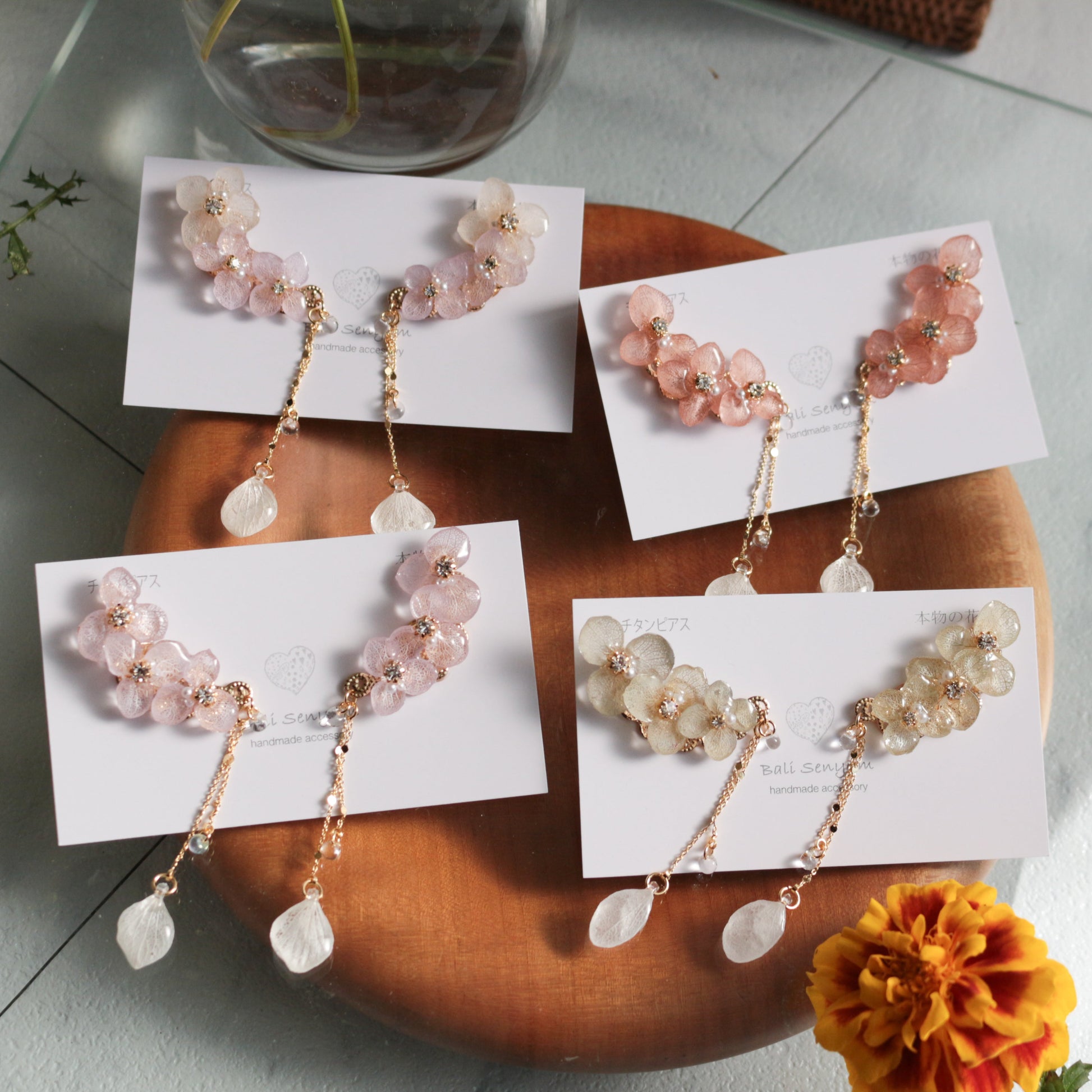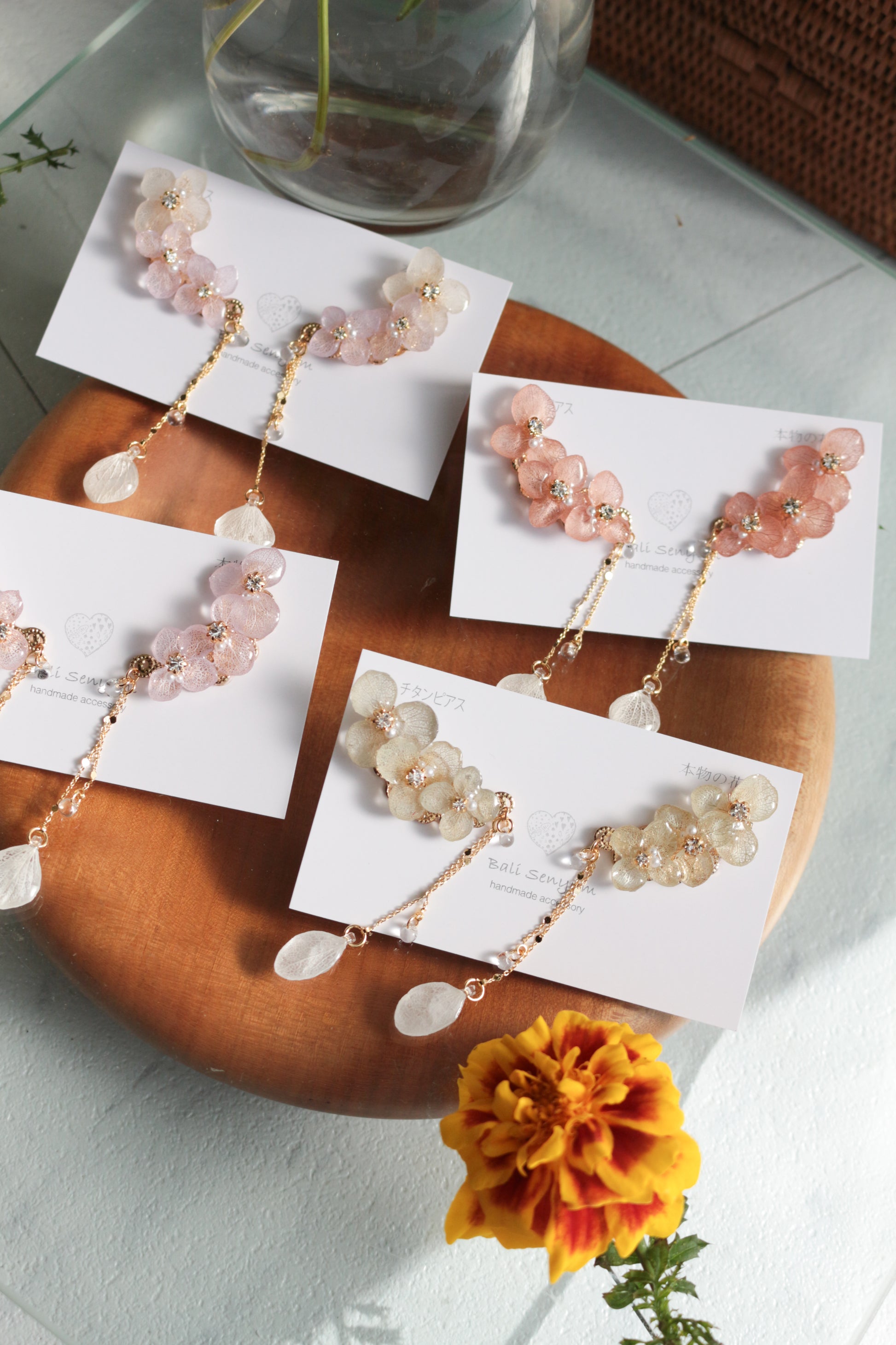 All the flower petals I use have been preserved, not dried, so that they maintain their color for a long time. I take extra care to make sure each and every one looks like it is still living on the tree.