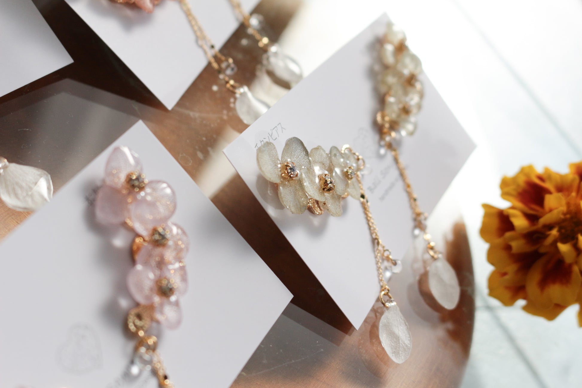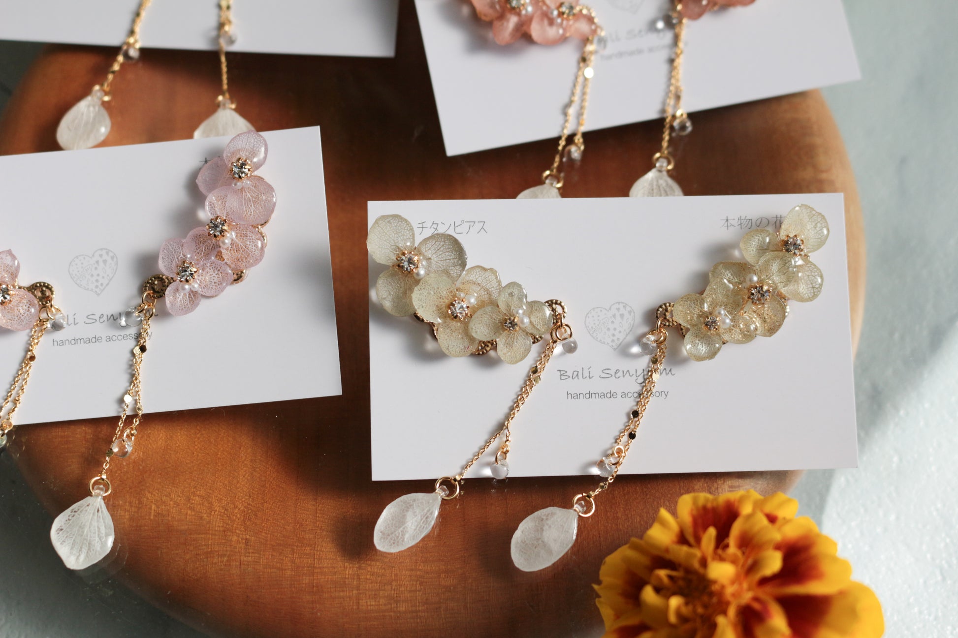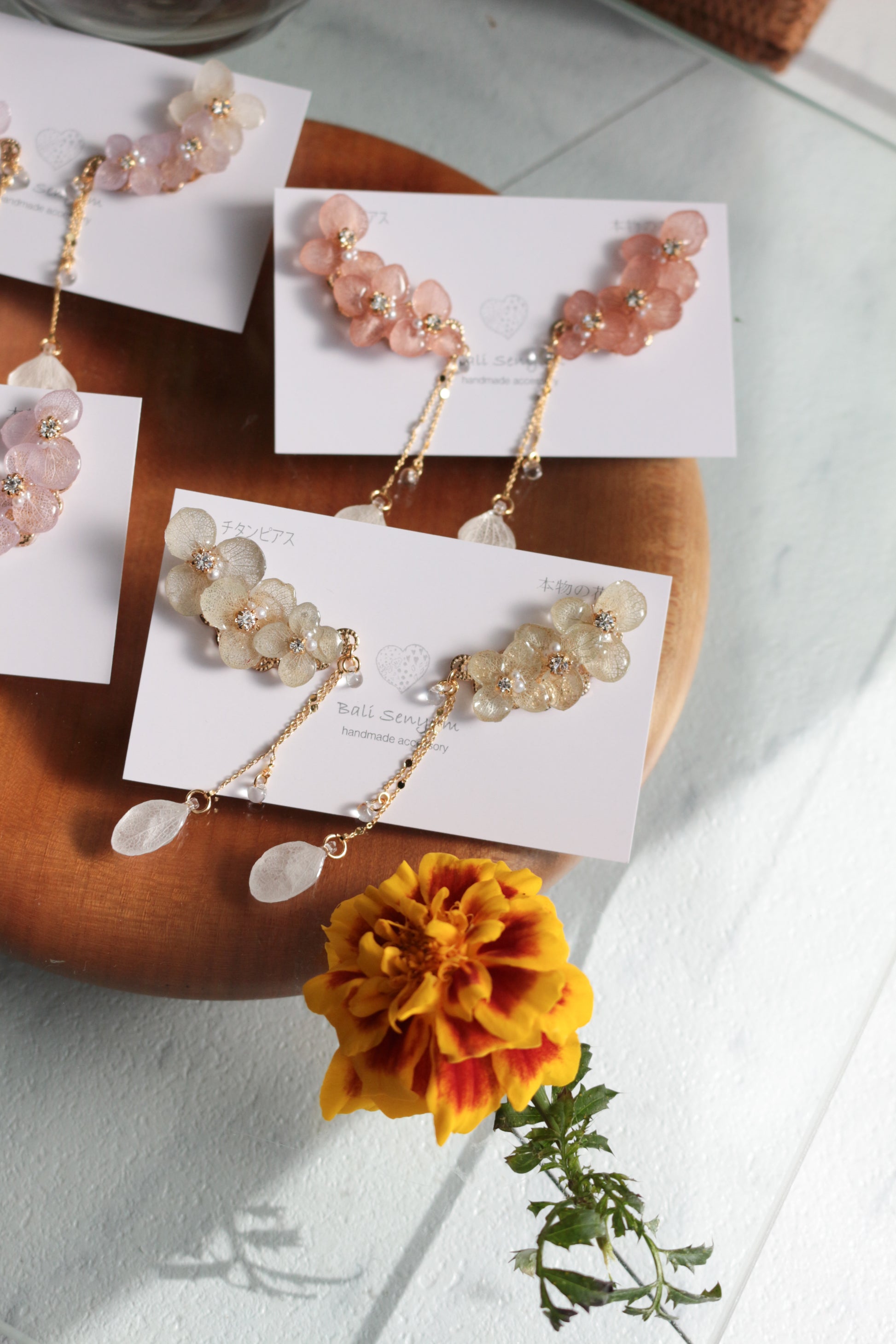 All the flower petals I use have been preserved, not dried, so that they maintain their color for a long time. I take extra care to make sure each and every one looks like it is still living on the tree.