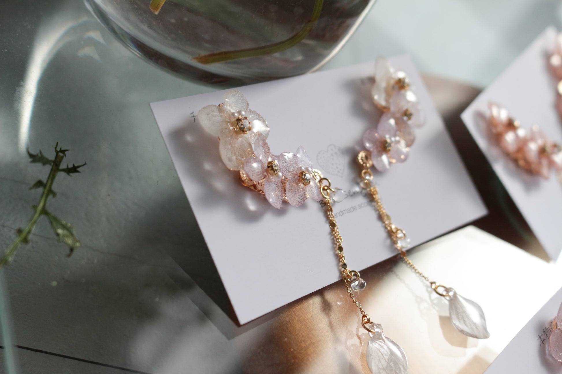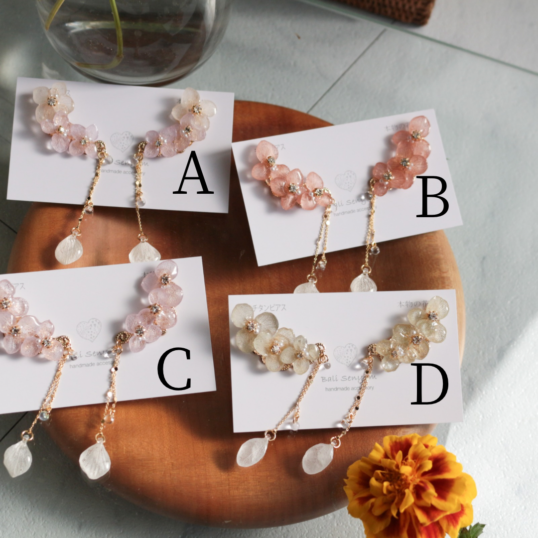 Made with real hydrangea petals to create three flowers with a flowing flower petal swinging from a golden chain.