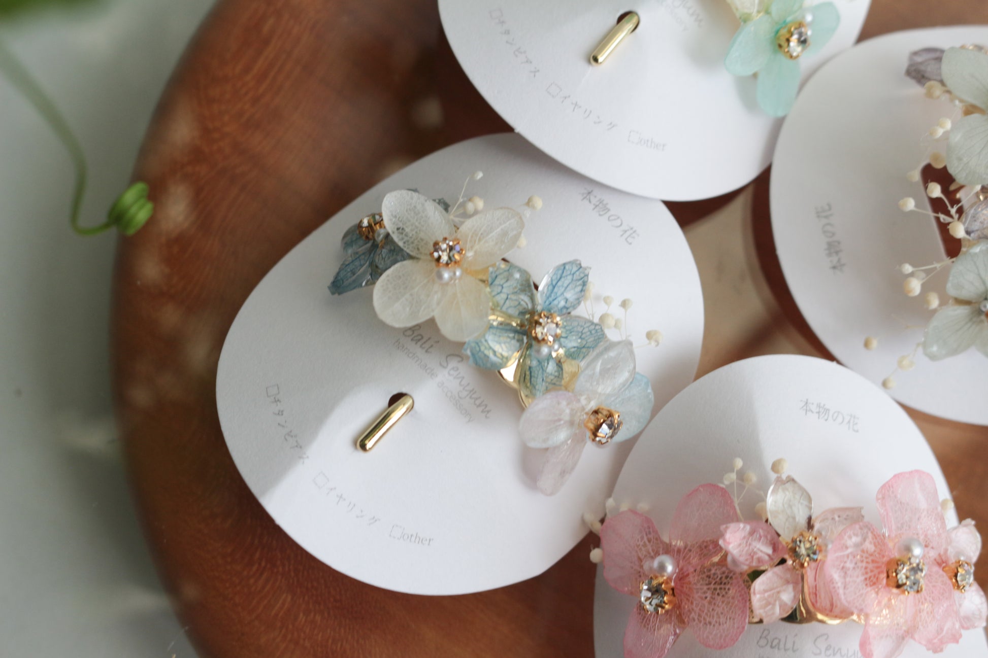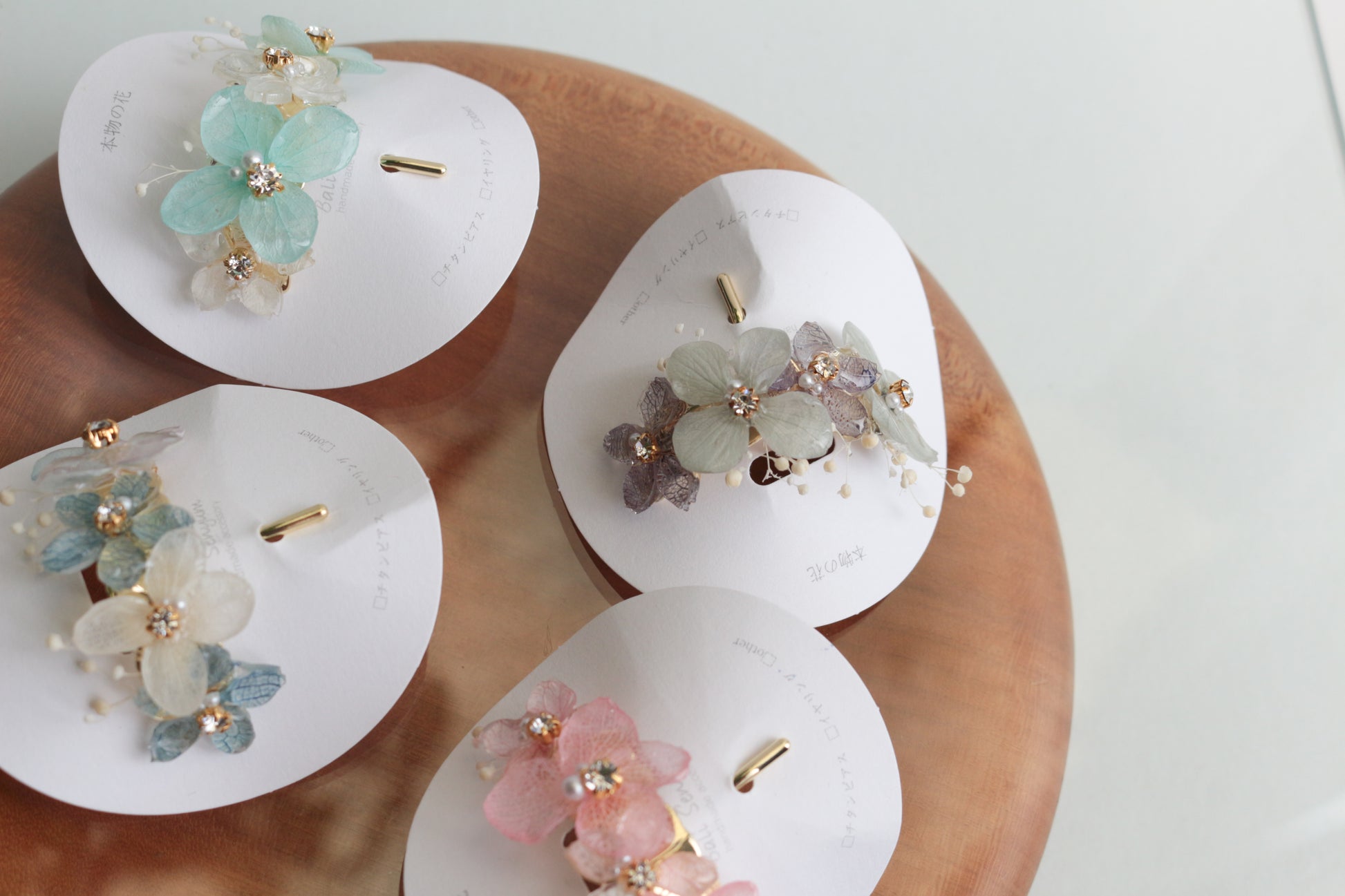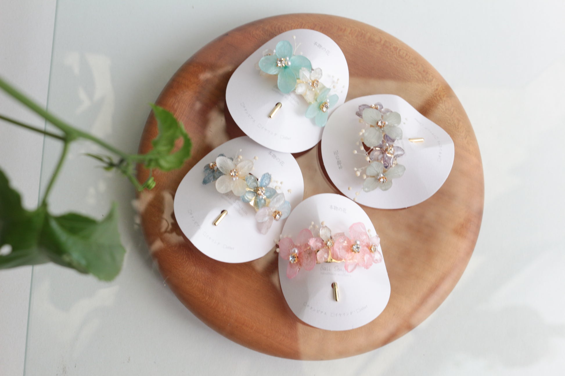 Multiple styles of hydrangea petals and gems with a metal hook on the back that lets you slide the flower into a ponytail or other section of tied hair.
