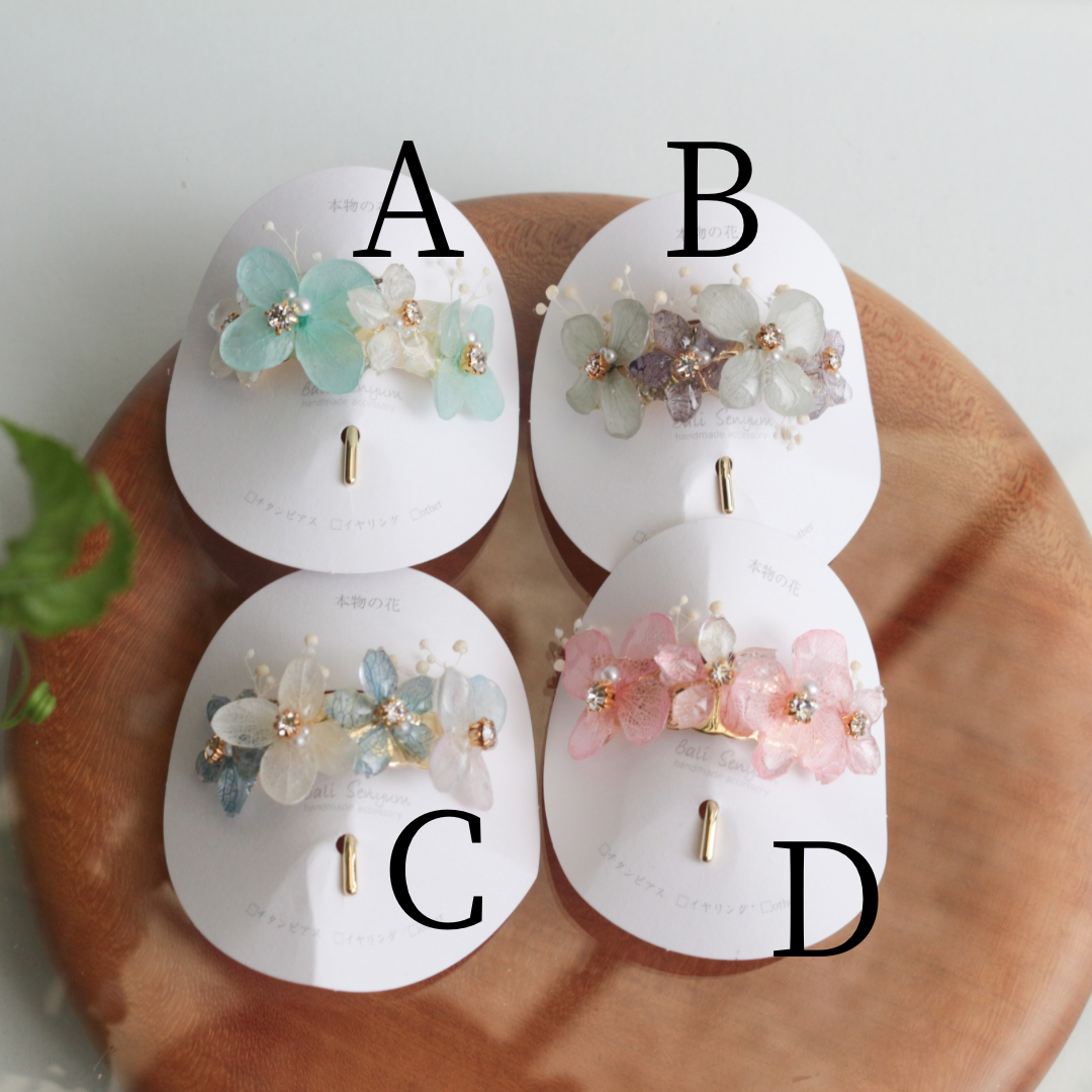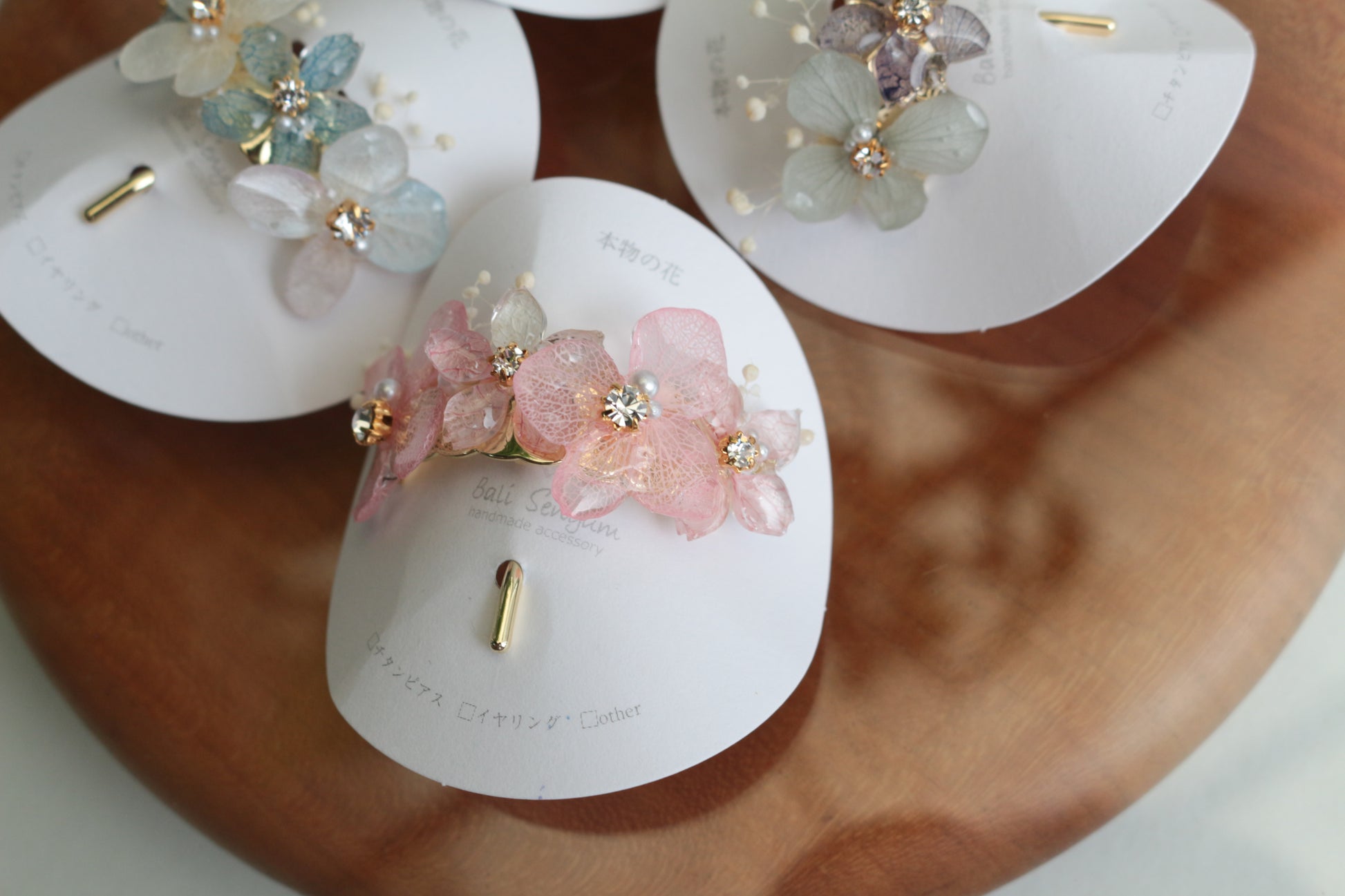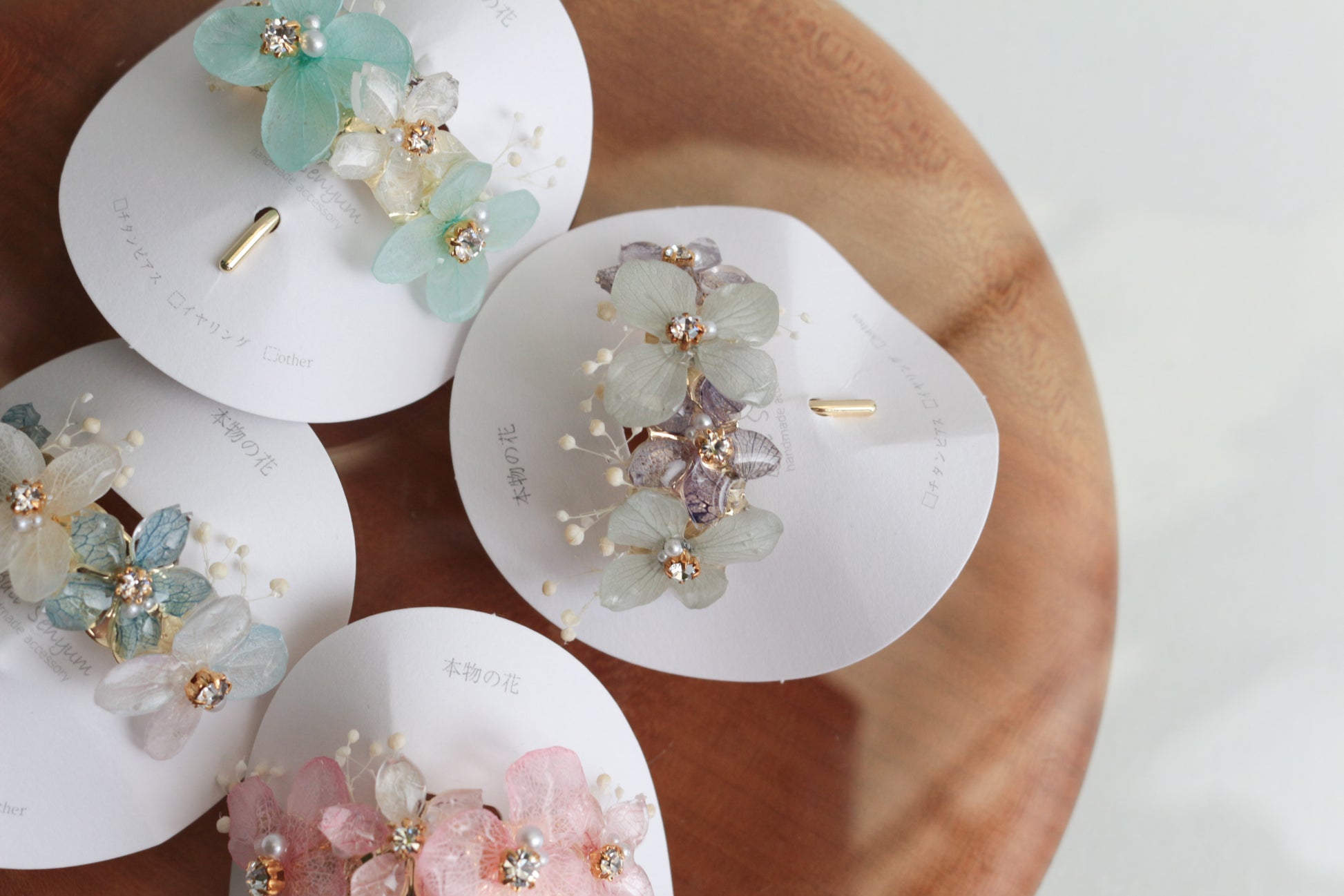 Multiple styles of hydrangea petals and gems with a metal hook on the back that lets you slide the flower into a ponytail or other section of tied hair.