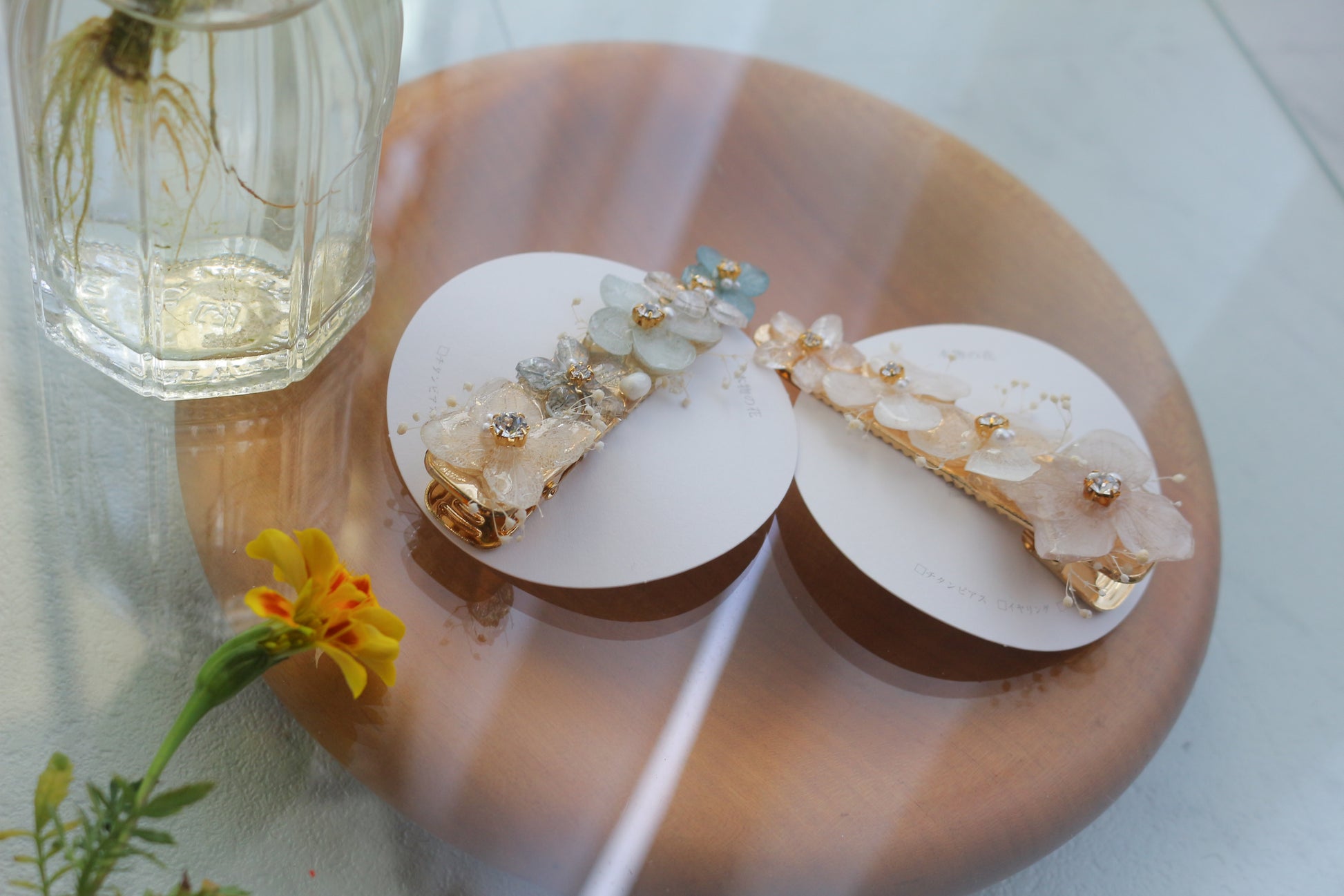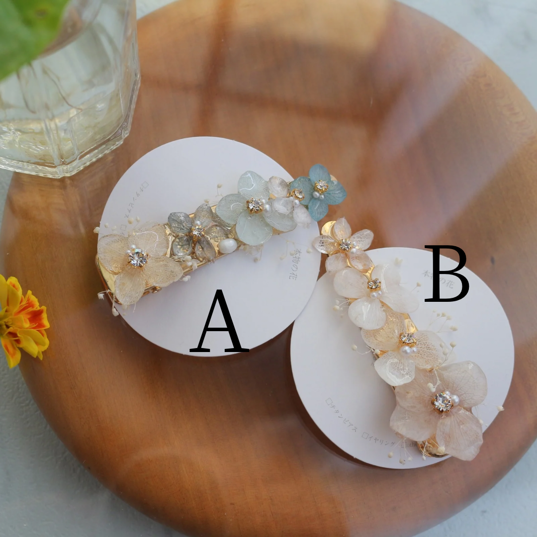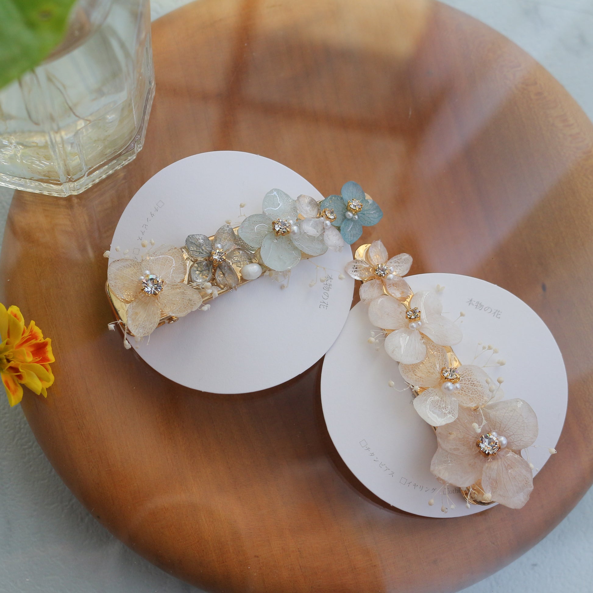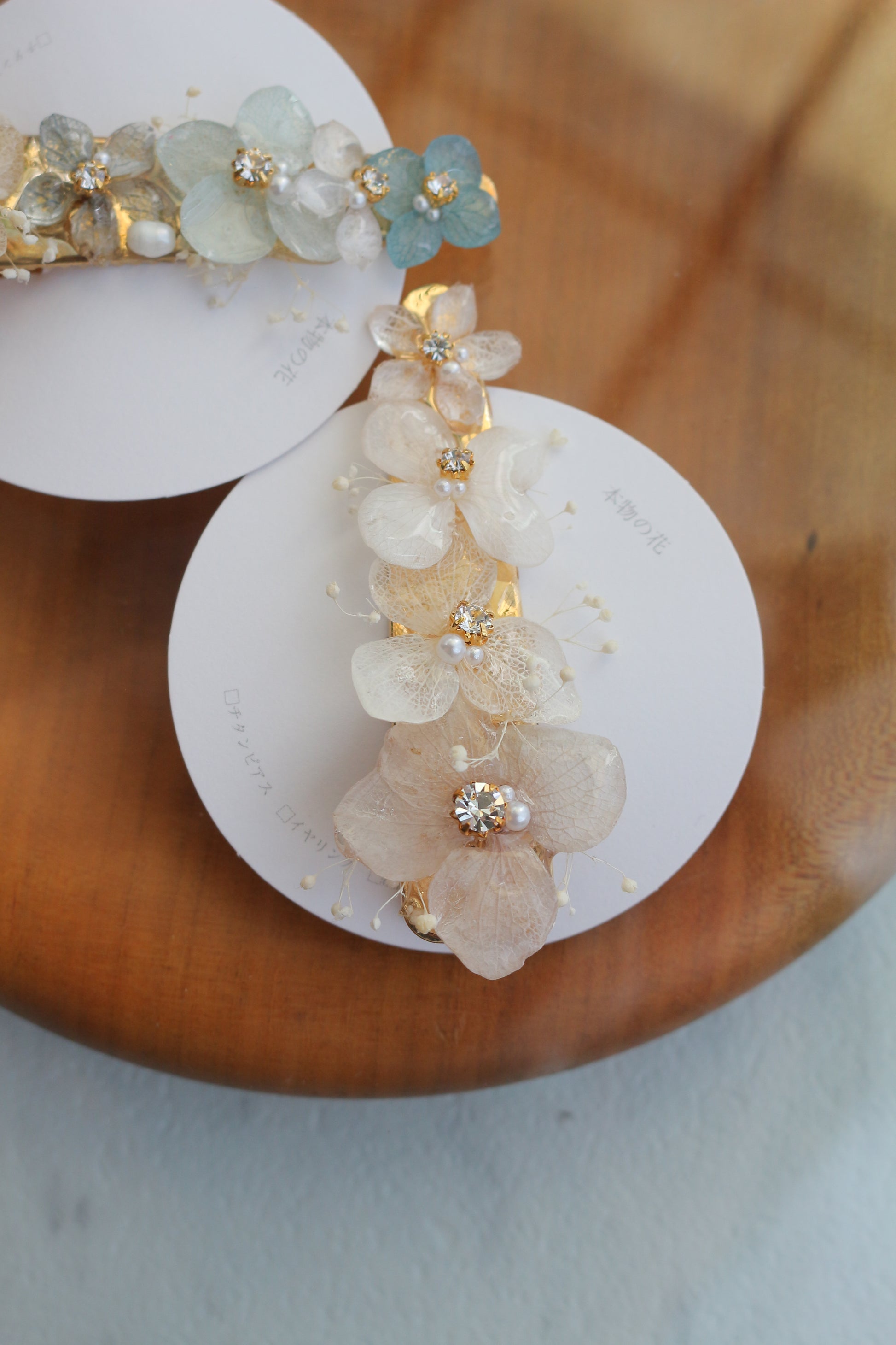 Hydrangea petals were used to create the flowers that adorn this hair clip. Accented with delicate baby's breath and a gold colored clip.