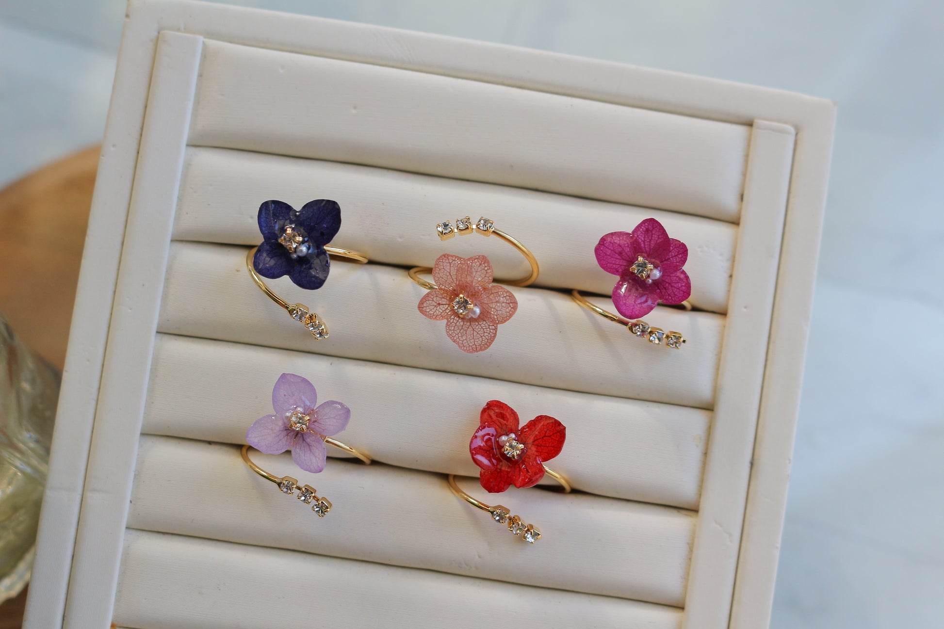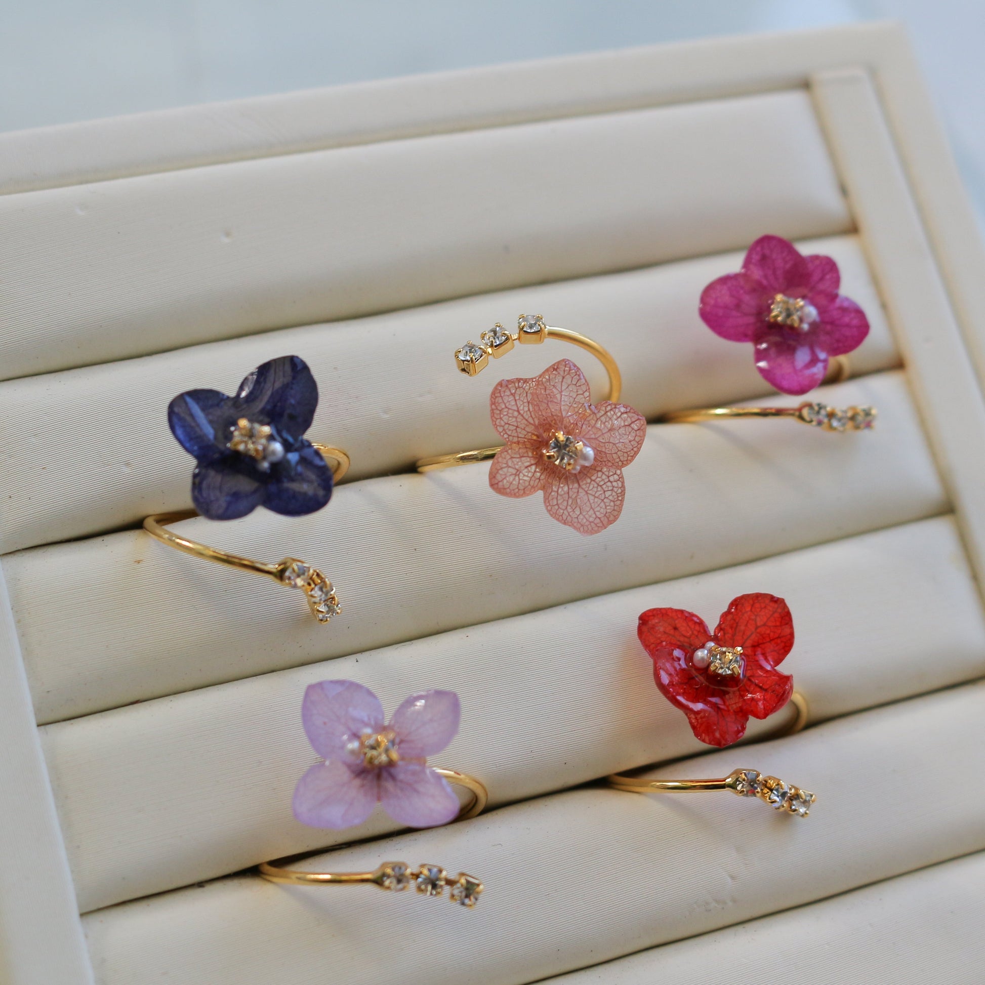 Made with real flower petals coated with a thin layer of resin with three jewels adorning the center of the flower. The base size of the ring is 9 but can be adjusted up and down slightly due to one end being open.