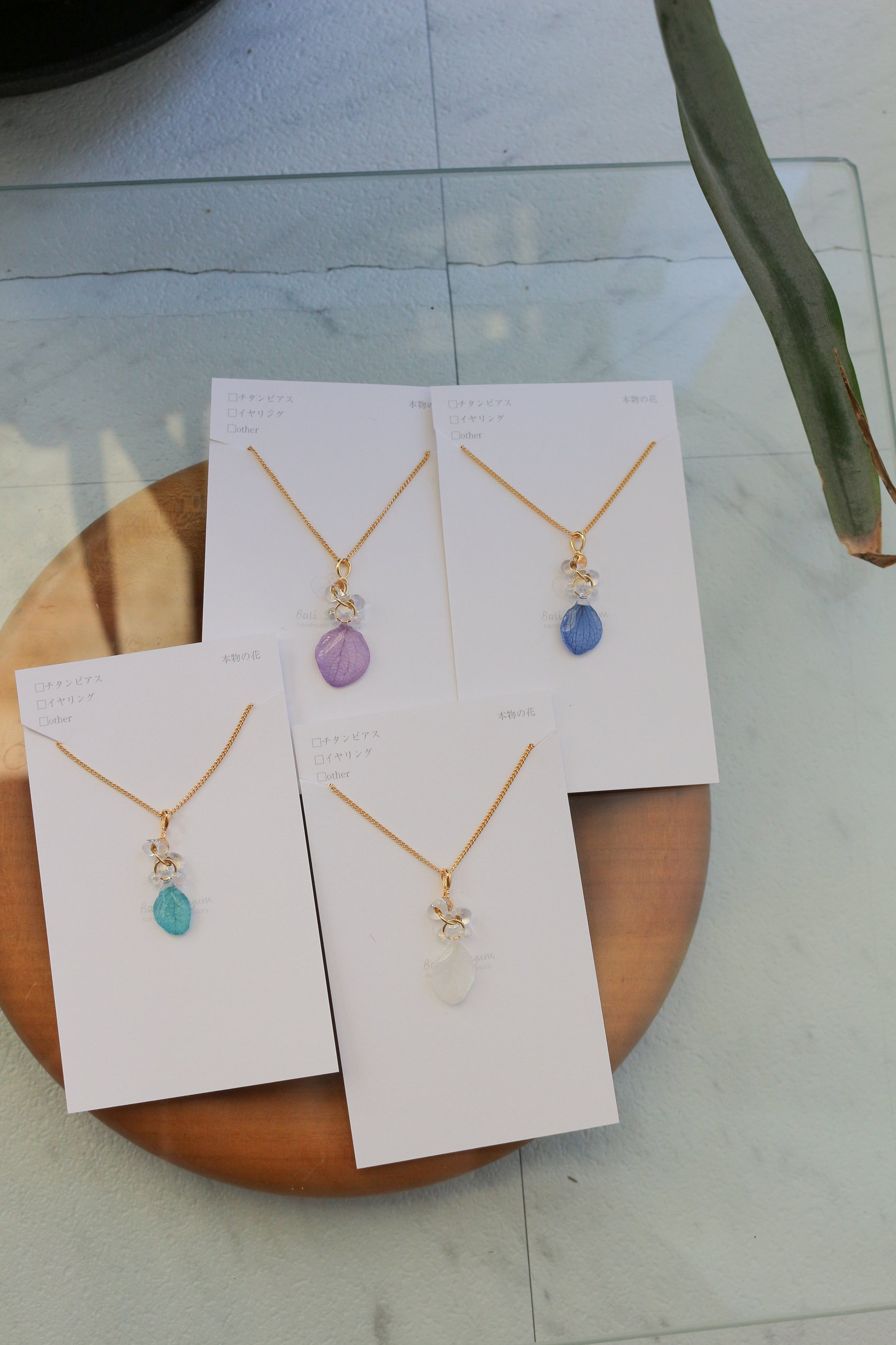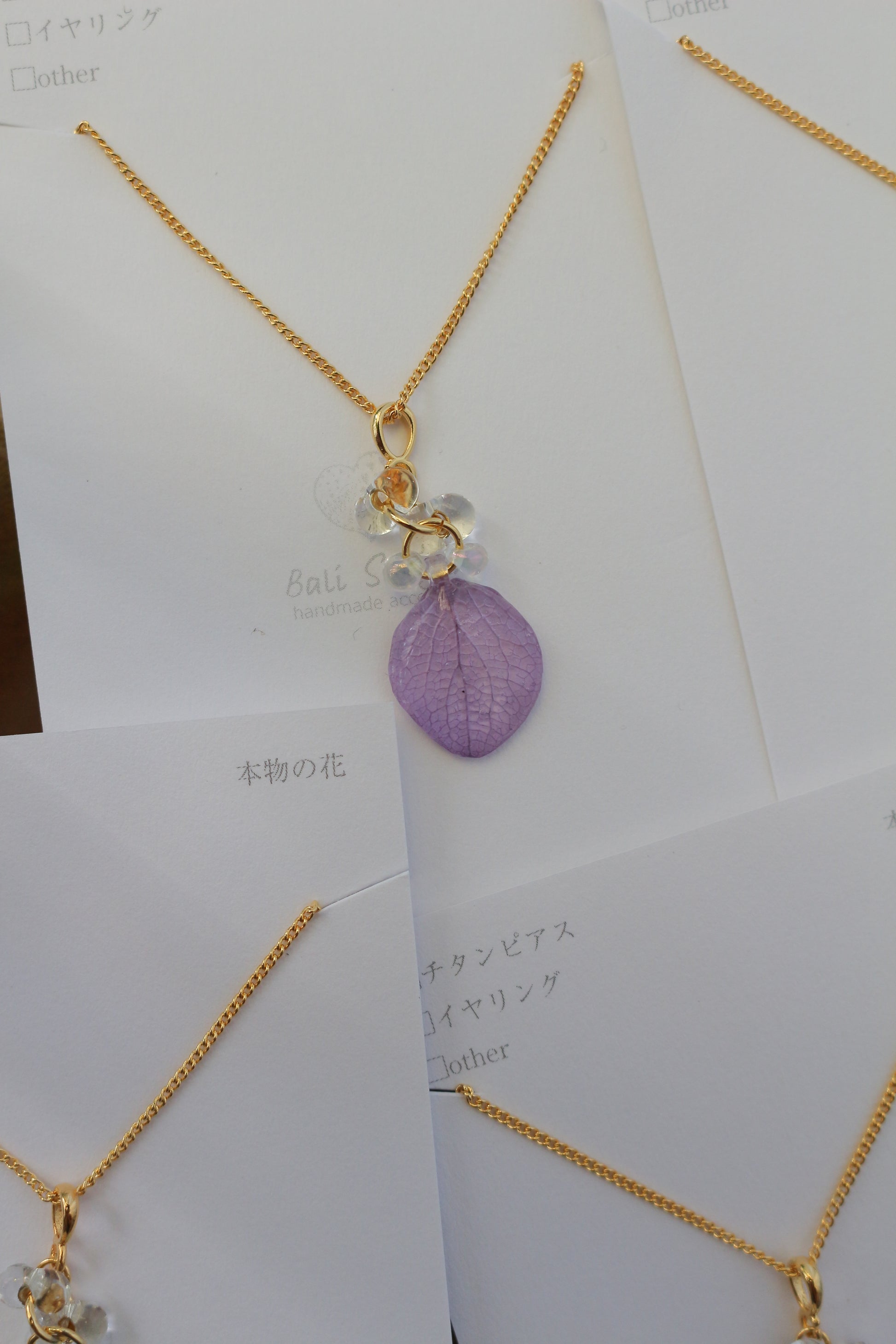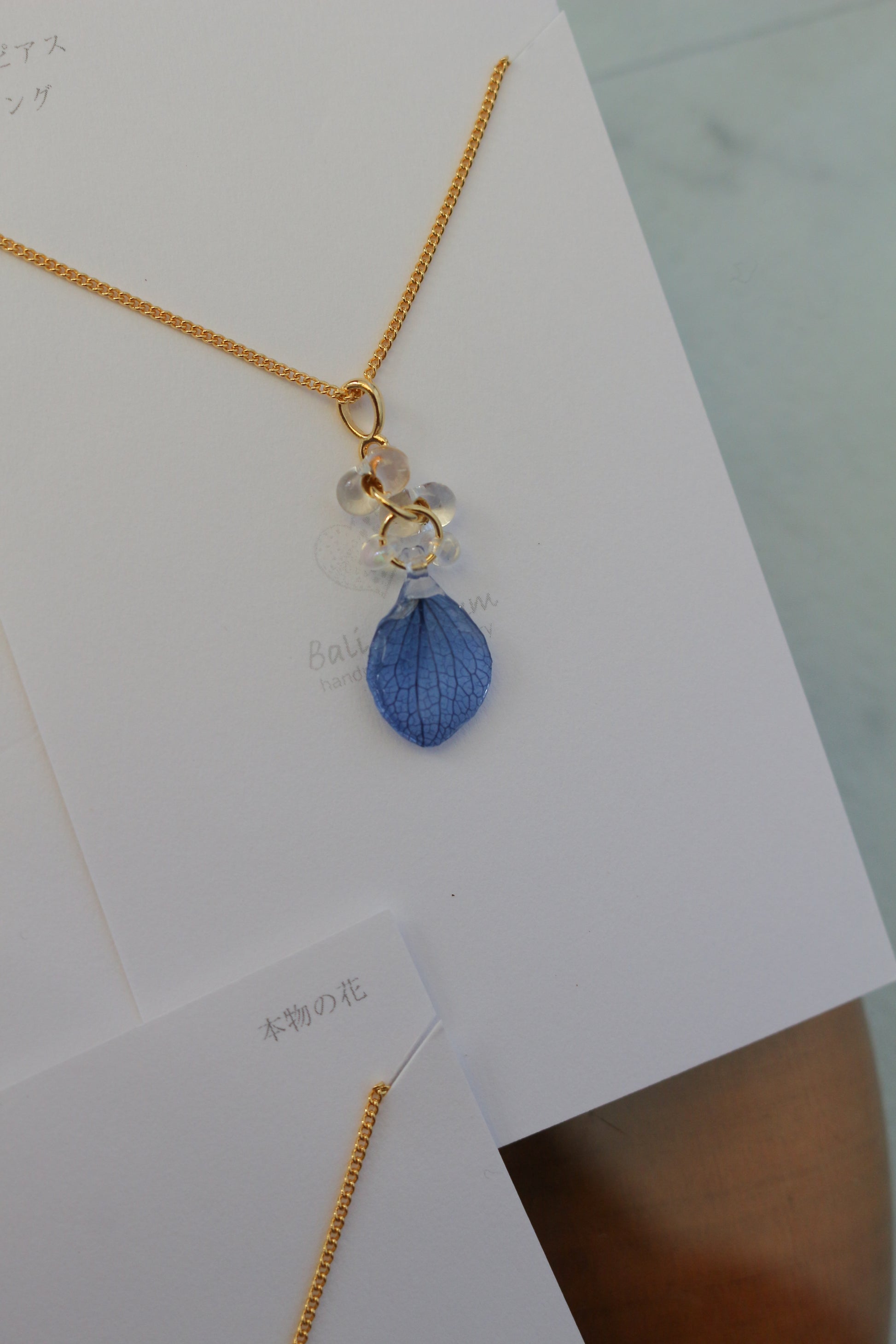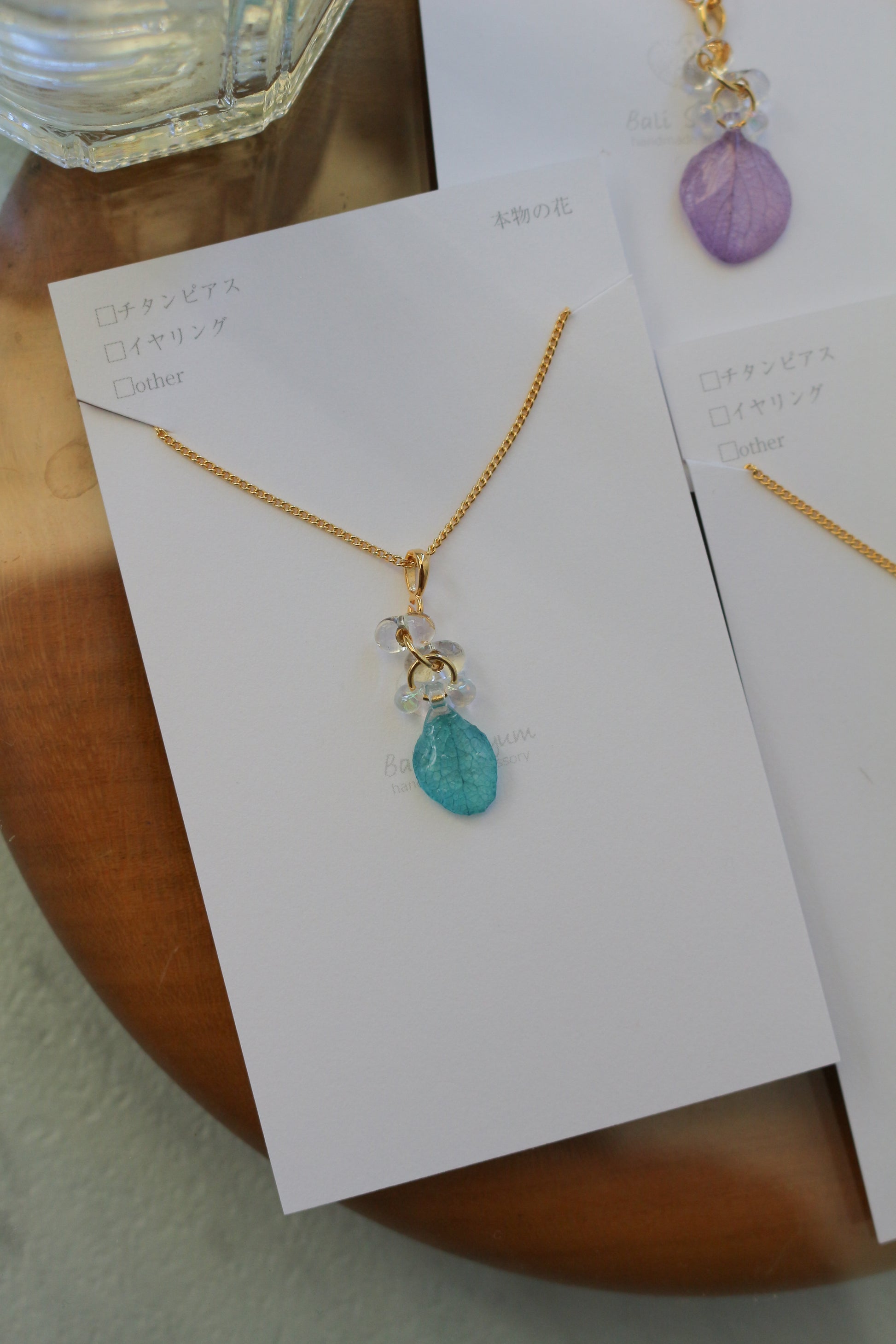 Hydrangea petals hang below clear beads on this elegant necklace. The petal hangs from the necklace chain by a golden loop.