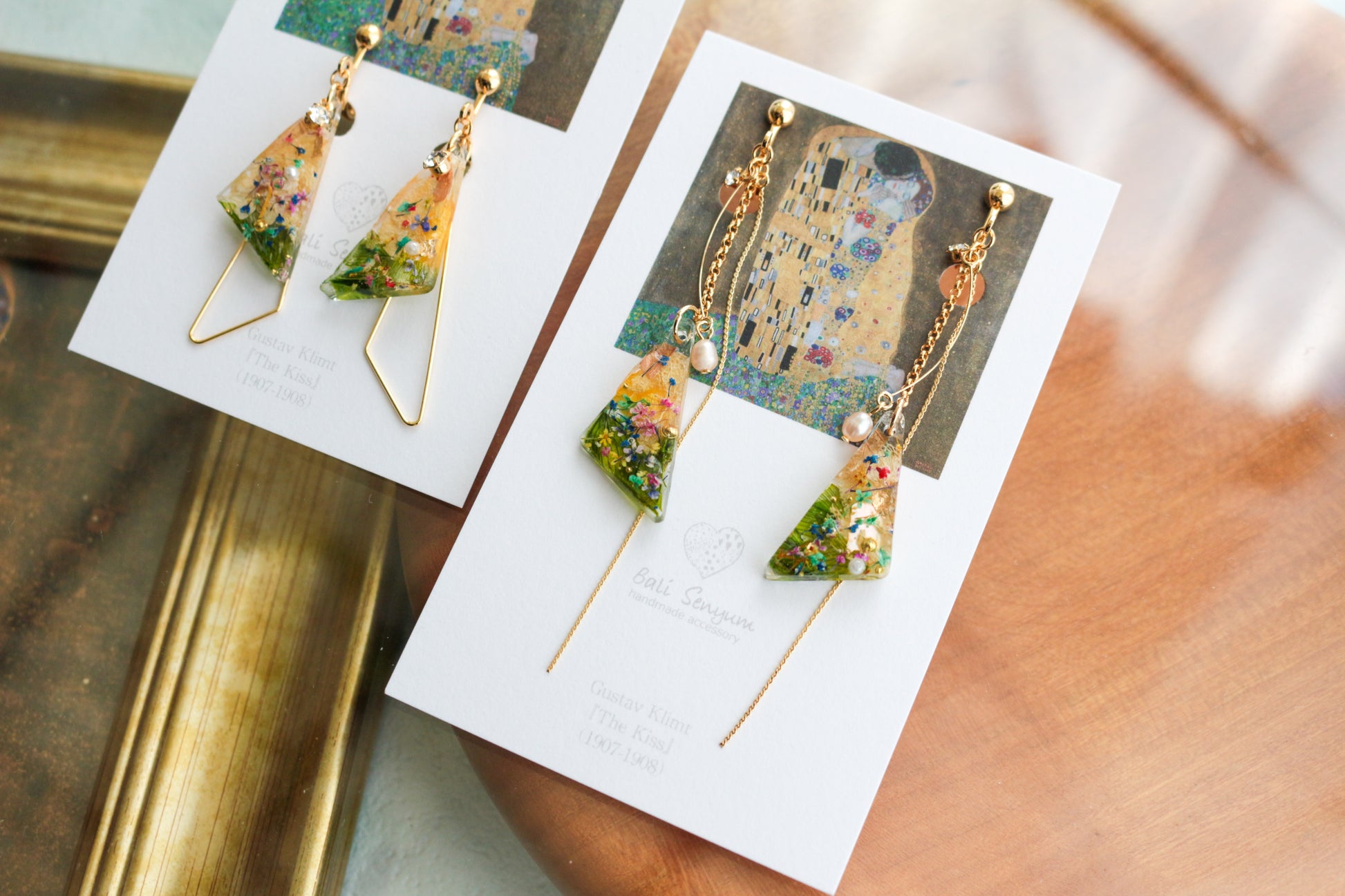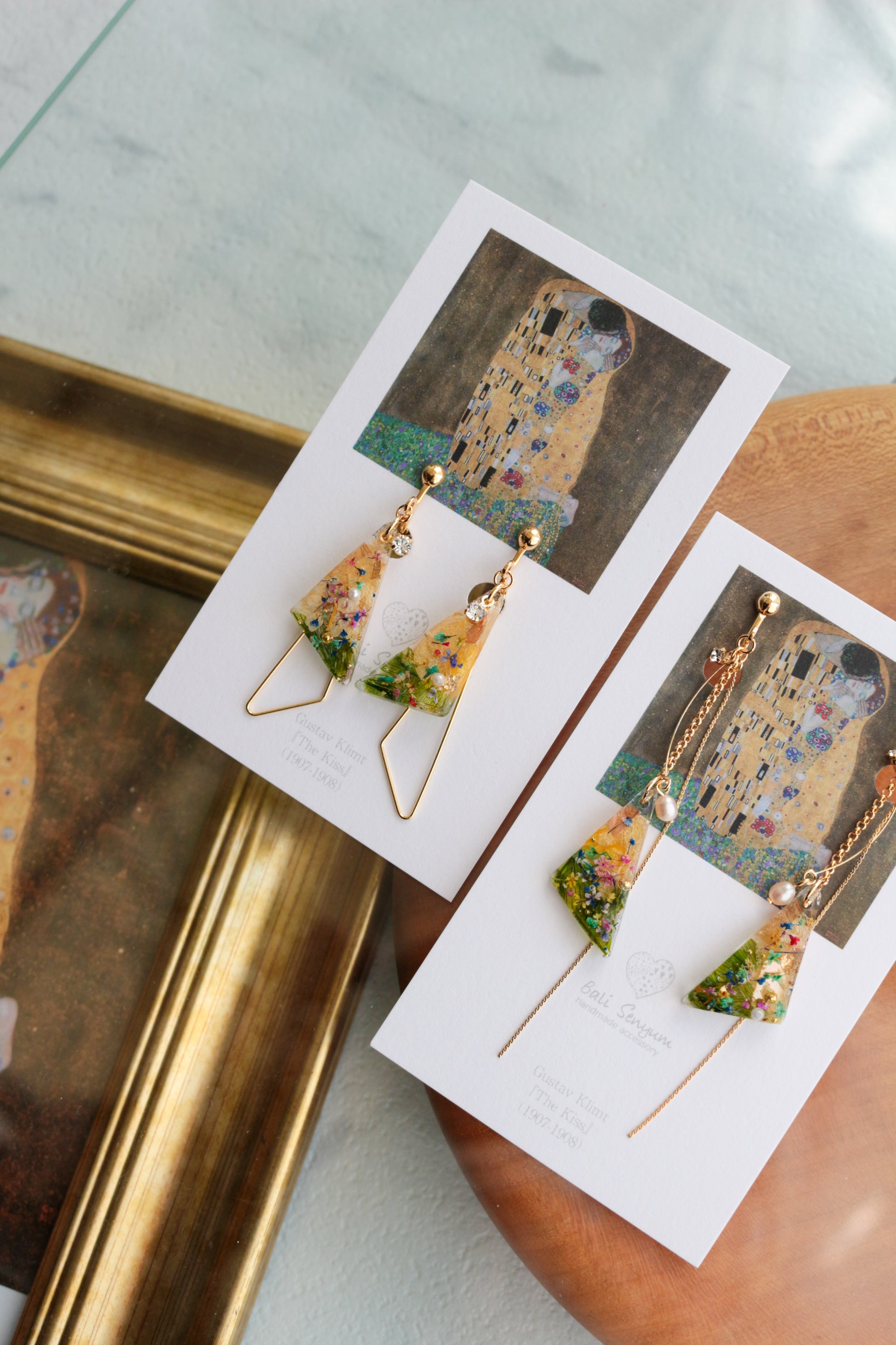 My best selling triangle earrings with a new design inspired by Gustav Klimt's Kiss.