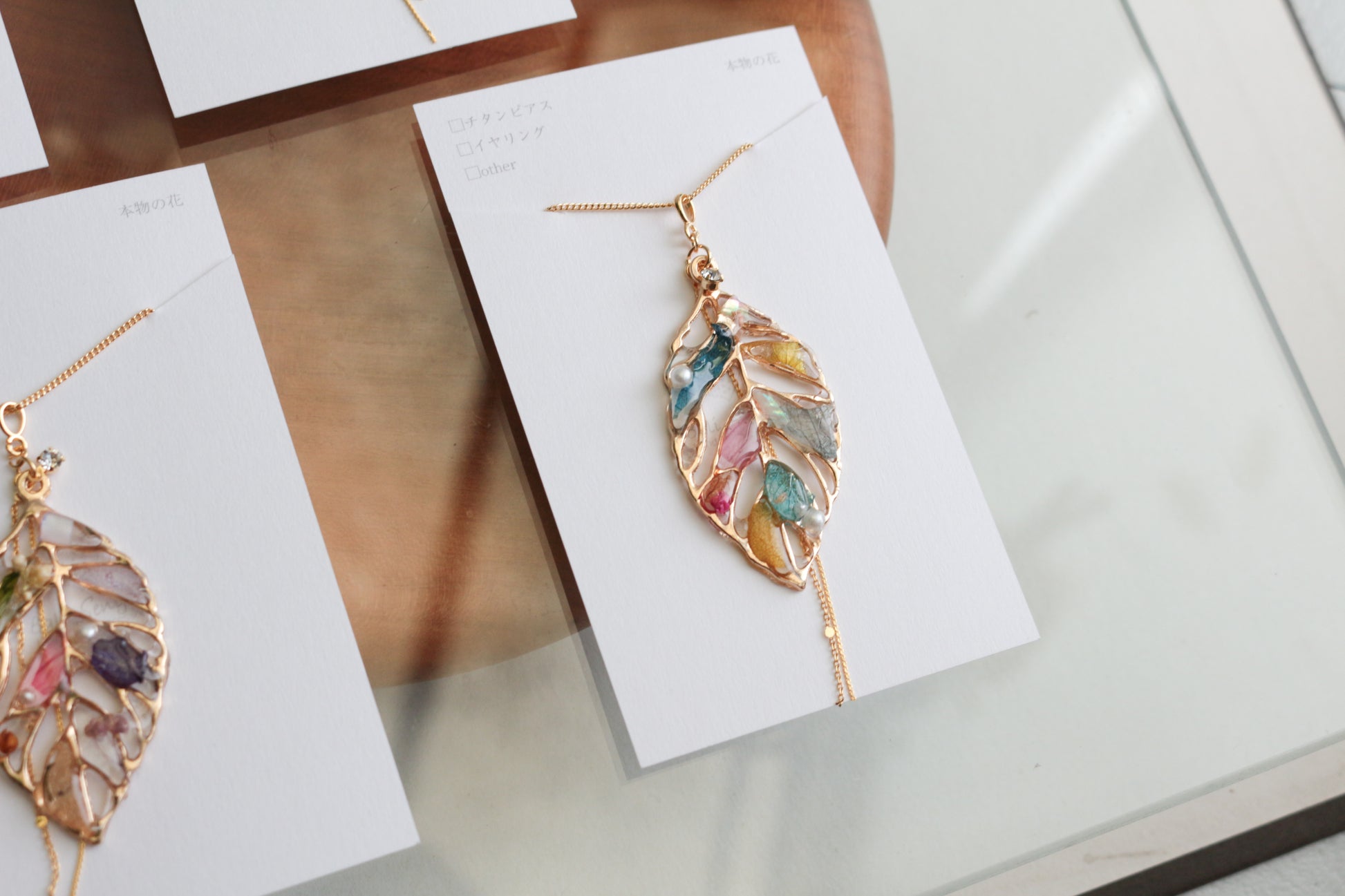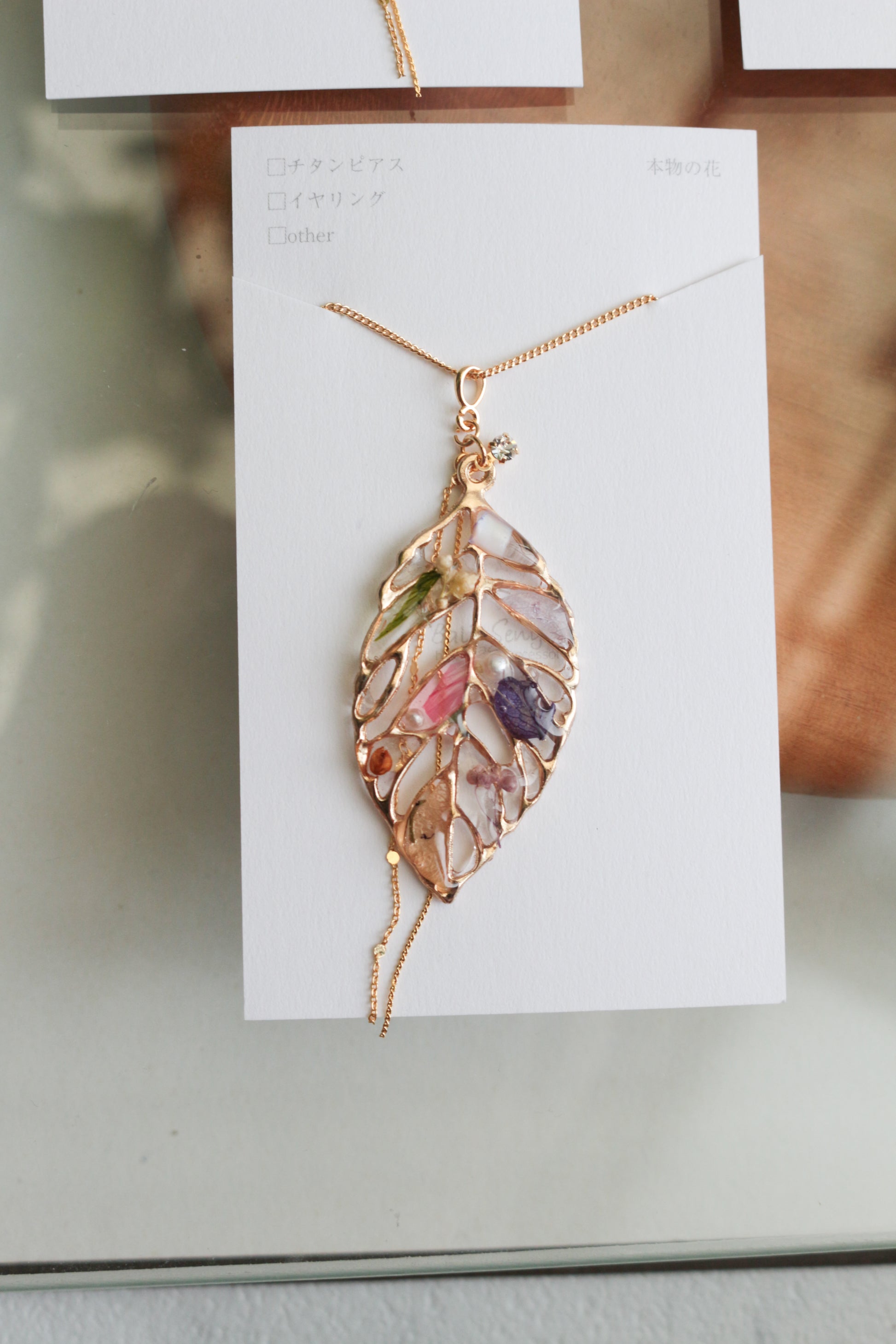 Hydrangea petals were used to make this unique golden leaf necklace. The leaf hangs from the necklace chain by a golden loop.