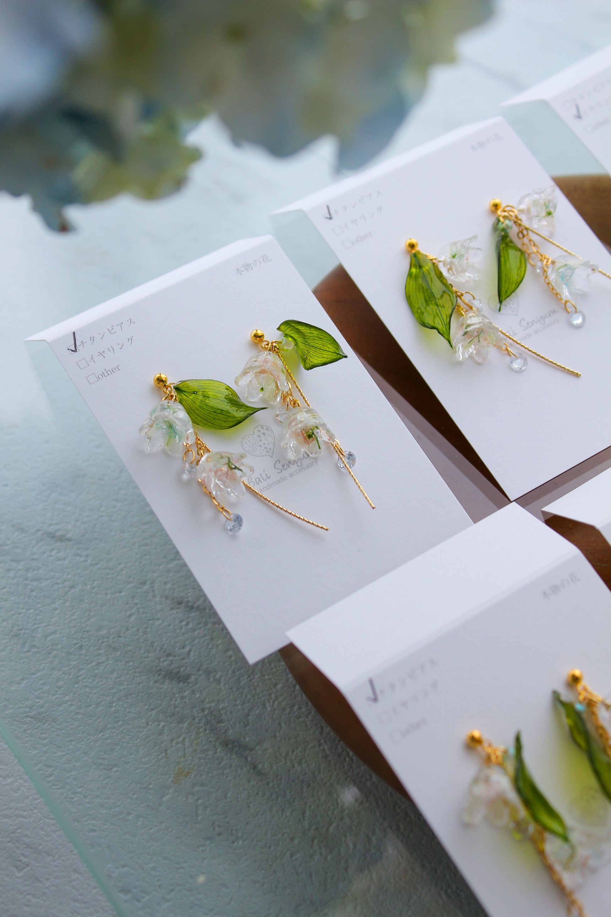 Beautiful lily of the valley inspired earrings made with real flower petals and leaves.