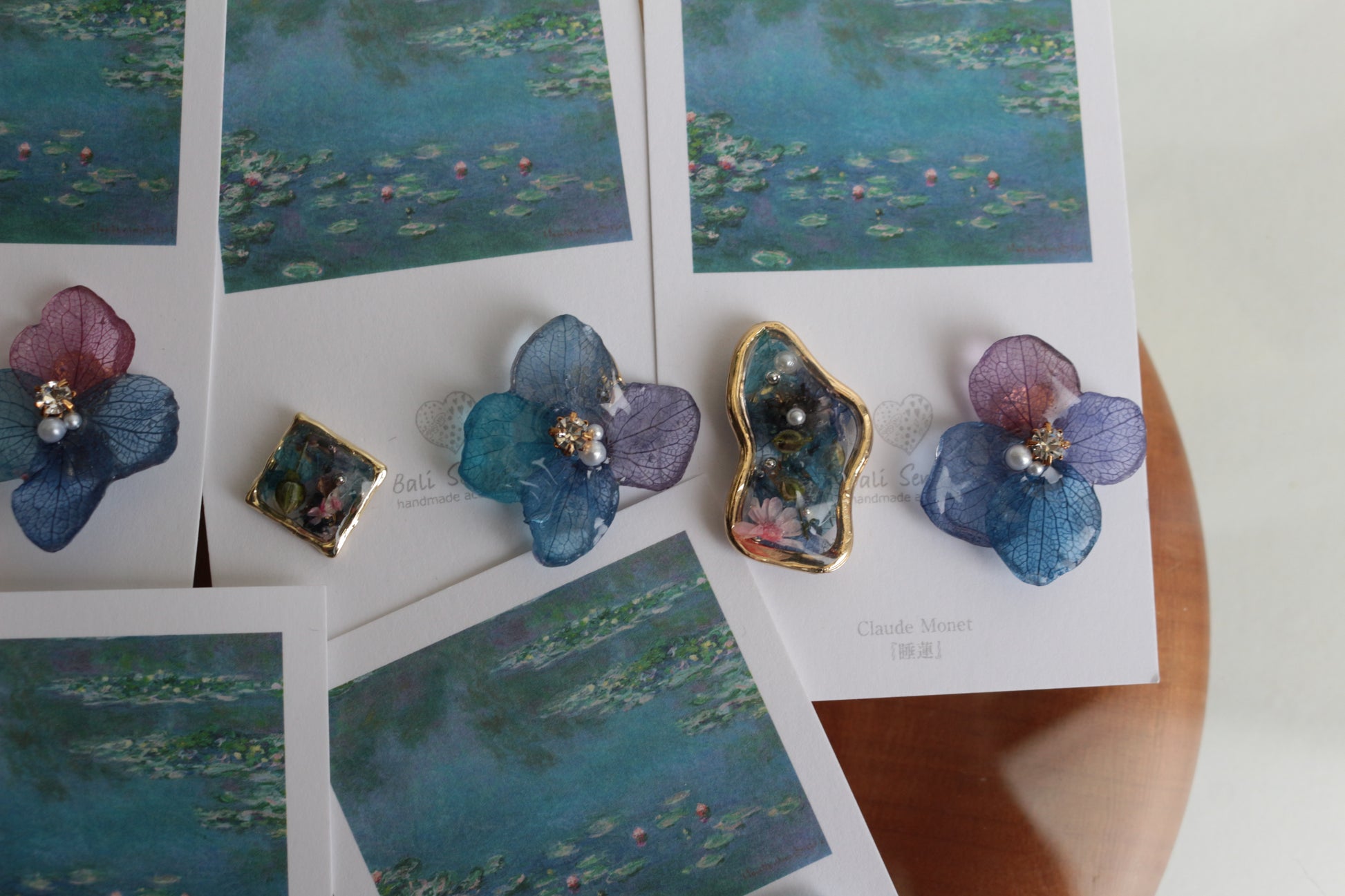 Hydrangea petal flower along with a flower petal filled medallion inspired by Monet's Water Lilies.