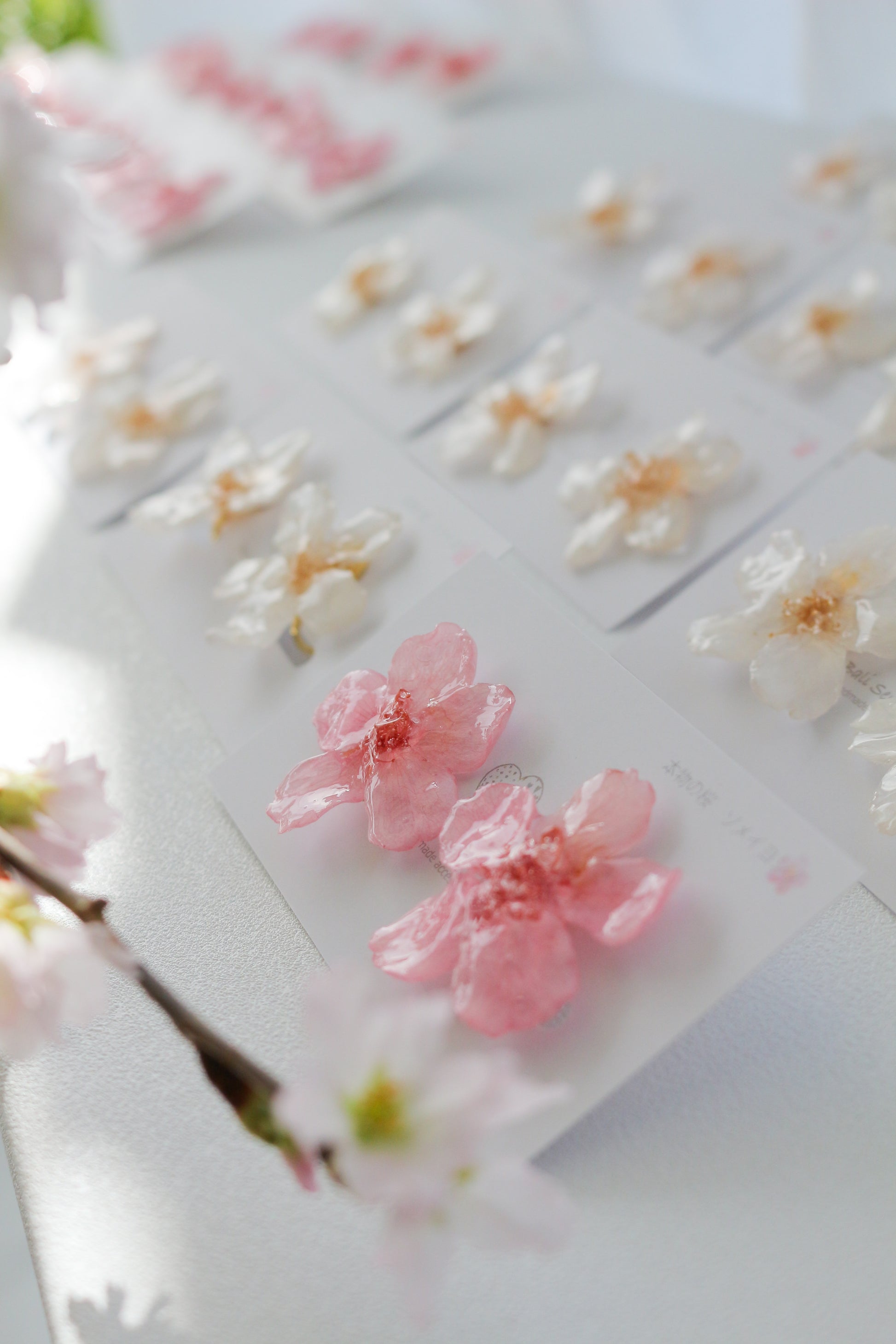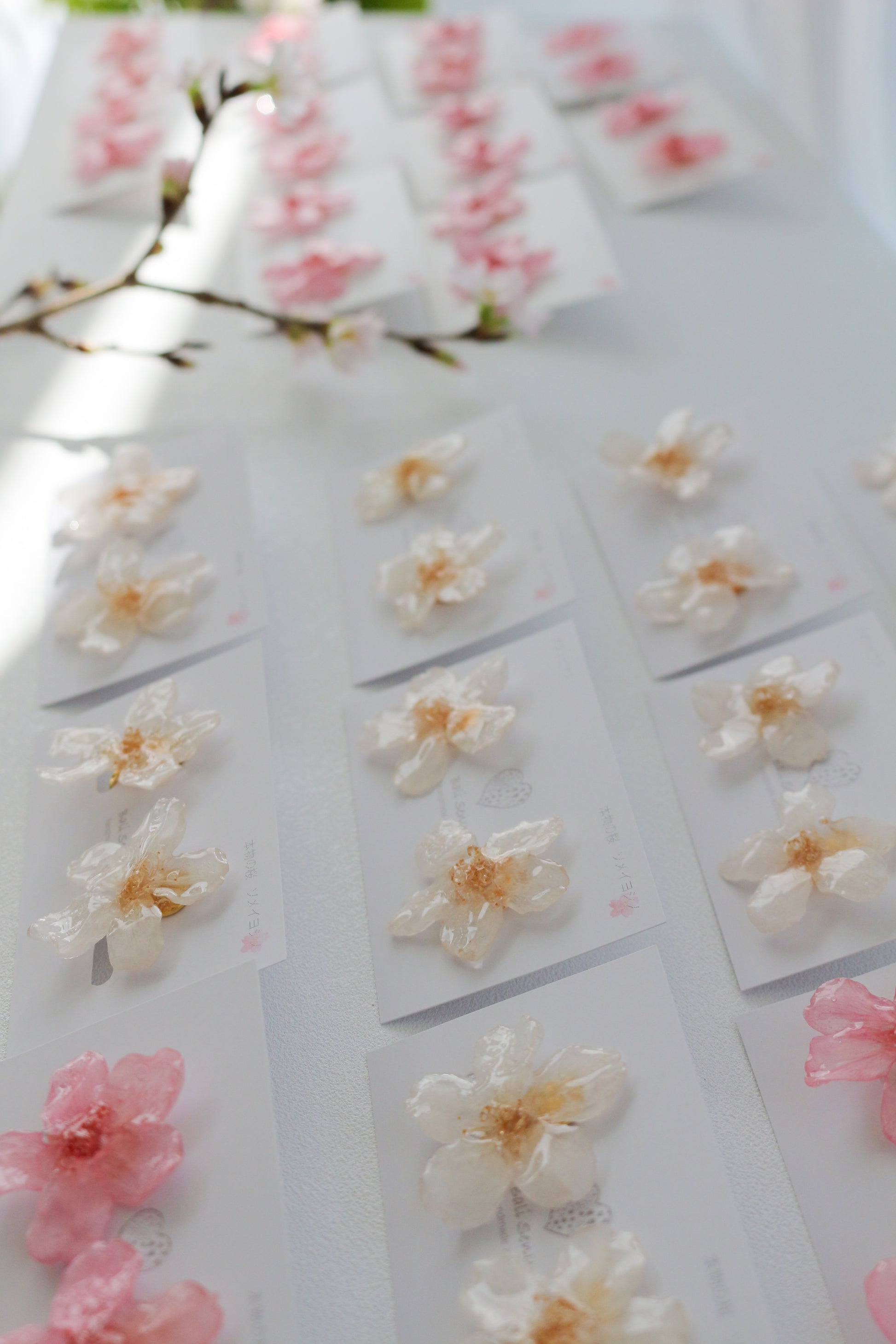 All the flower petals I use have been preserved, not dried, so that they maintain their color for a long time. In addition, sakura petals are very delicate so I take extra care to make sure each and every one looks like it is still living on the tree.