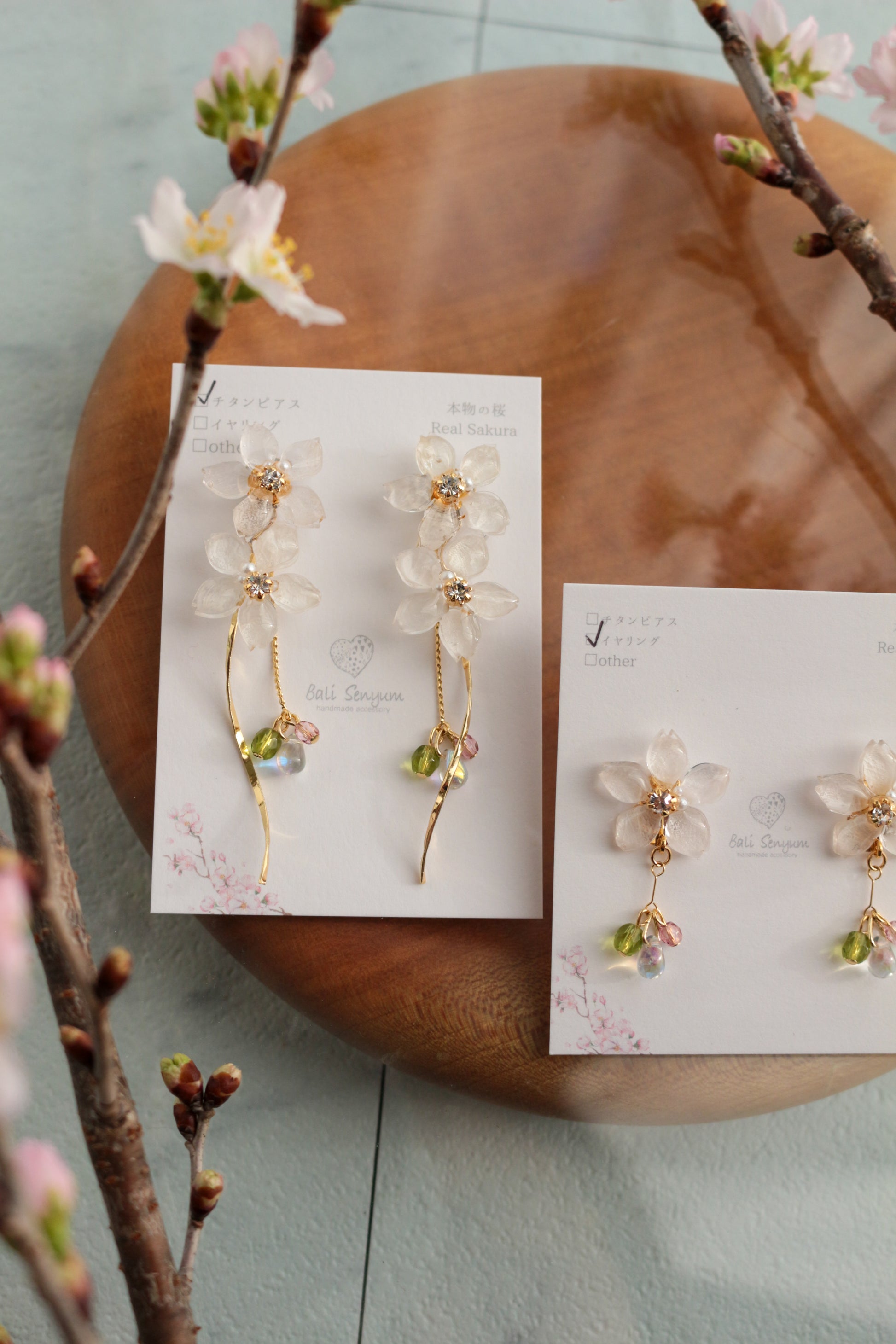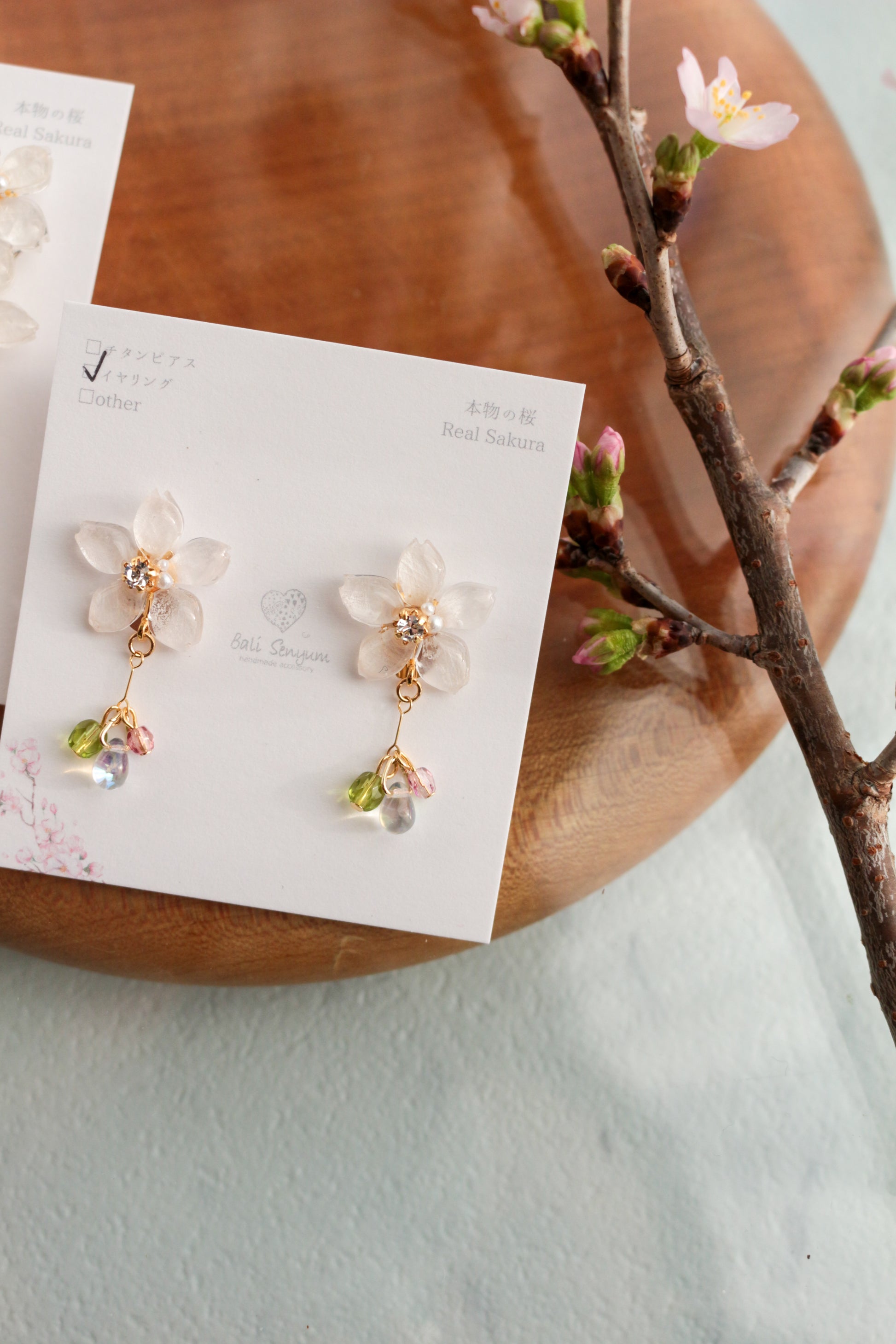In Kumamoto, south of where I live in Fukuoka, they have sakura that blooms this beautiful green color. So I wanted to make a version of my someiyoshino earrings that paid homage so I included a crisp green bead that dangles below the someiyoshino sakura flowers.