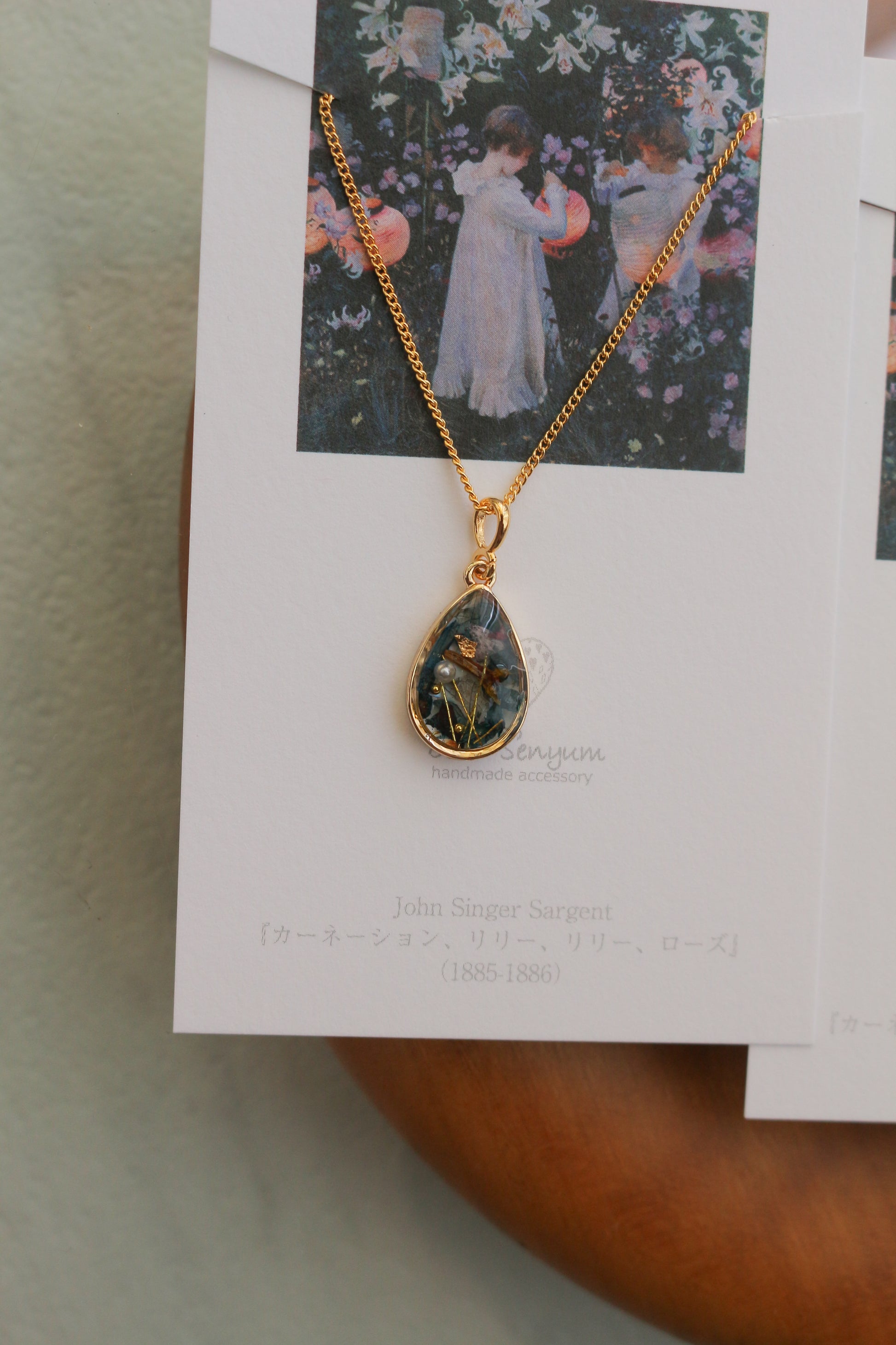 Real flower petals were used to make this necklace inspired bySargent's Carnation, Lily, Lily, Rose. The flower medallion hangs from the necklace chain by a golden loop.
