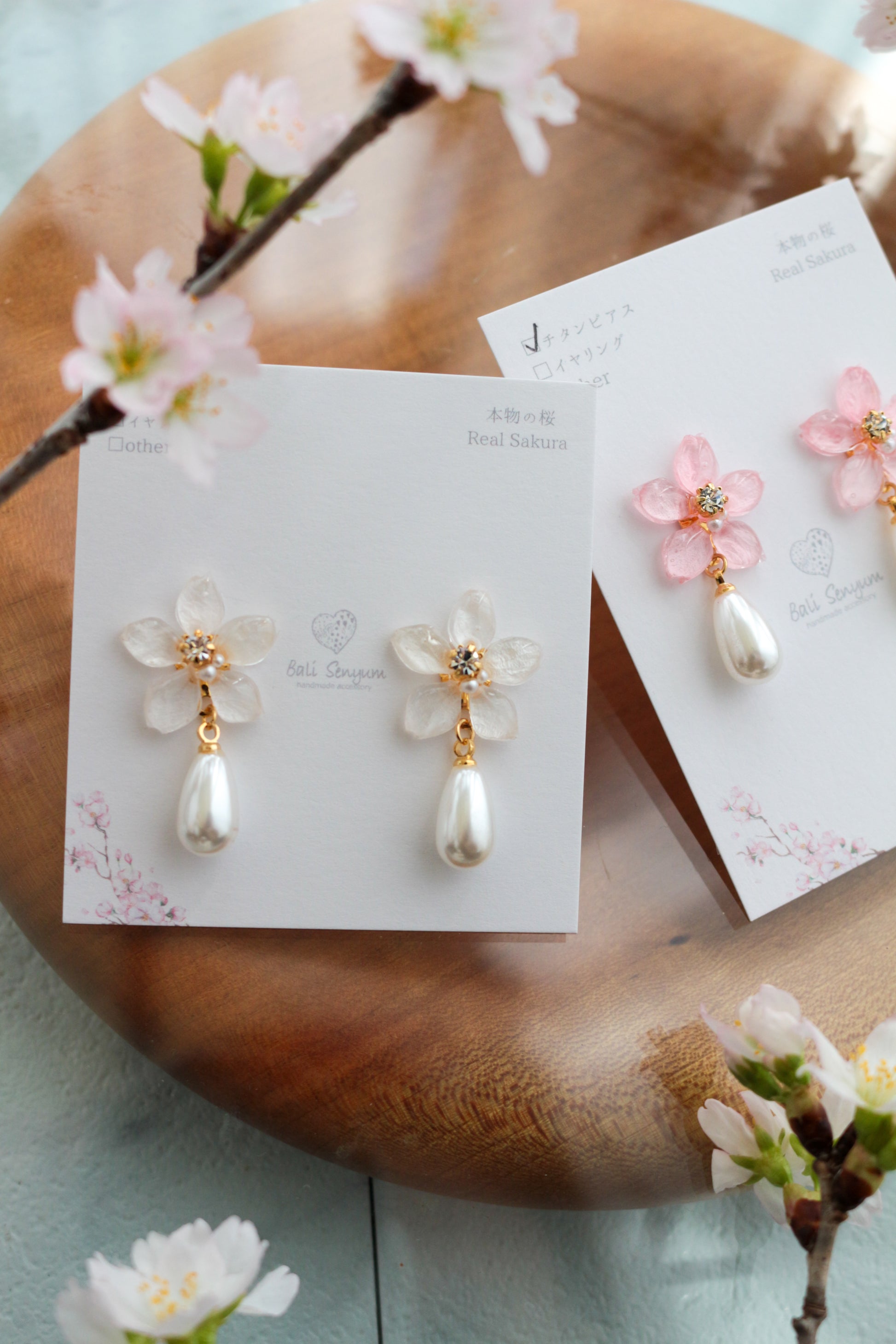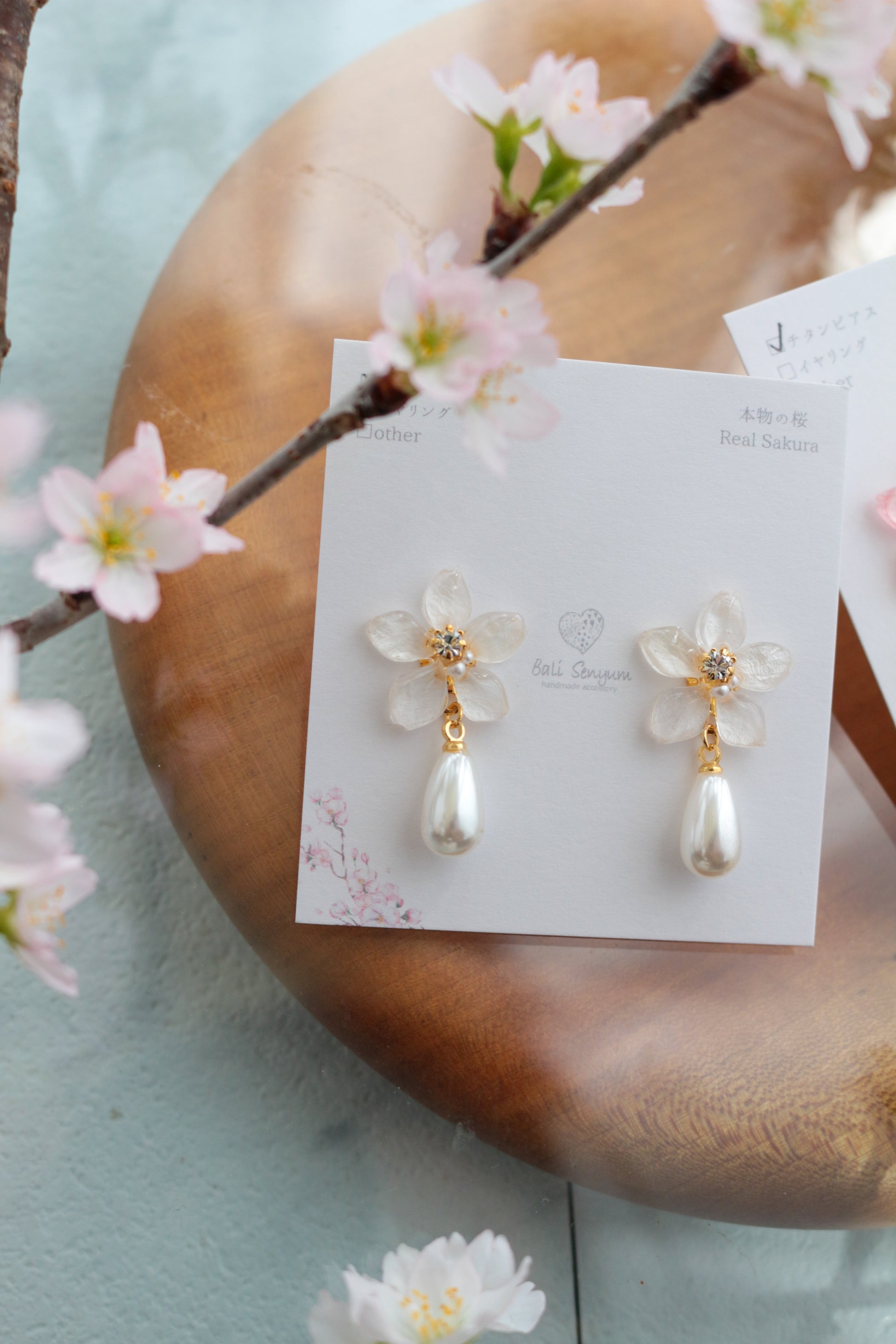 本物の桜ソメイヨシノとドロップパールが揺れるデザイン。