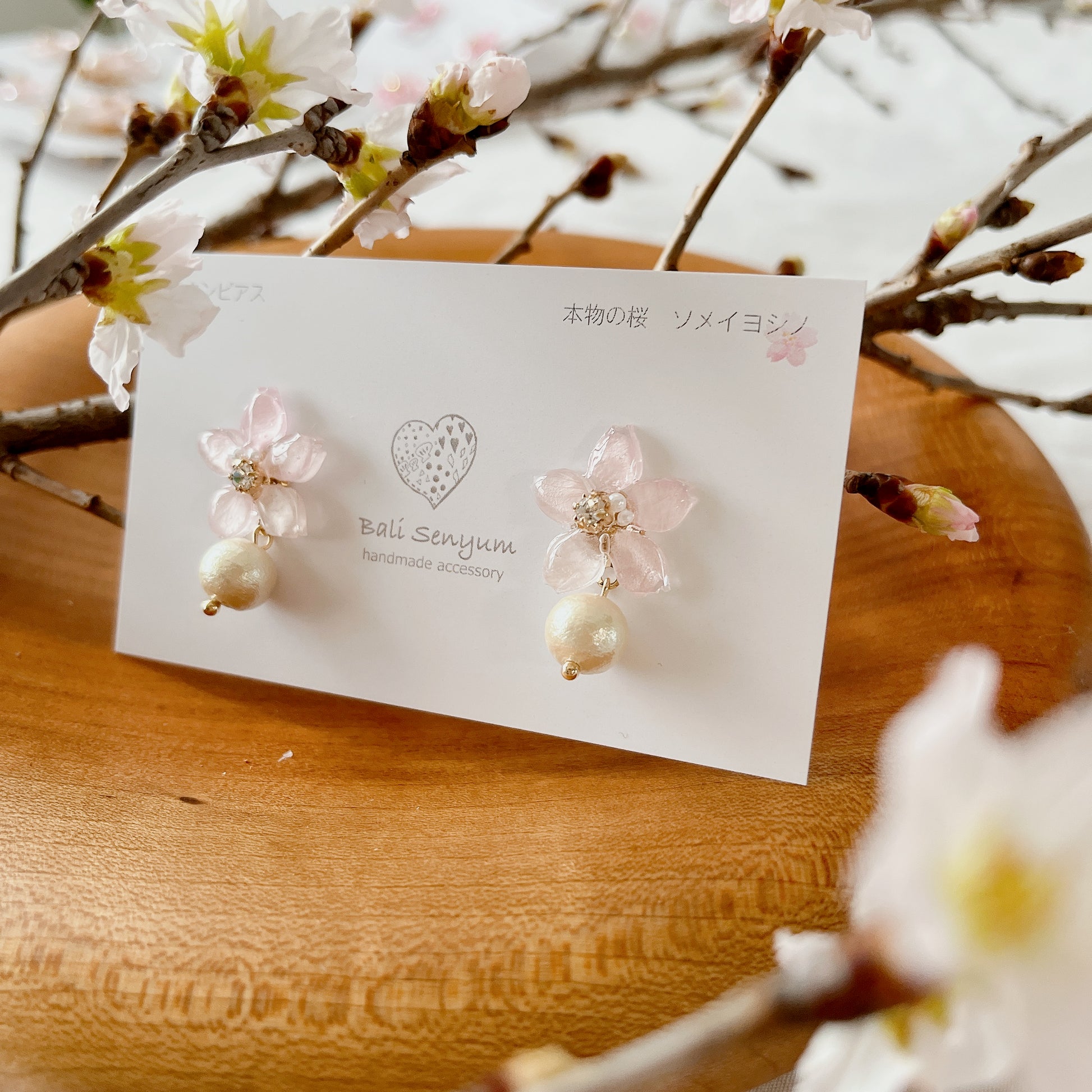 本物の桜ソメイヨシノとコットンパールが揺れるデザイン。