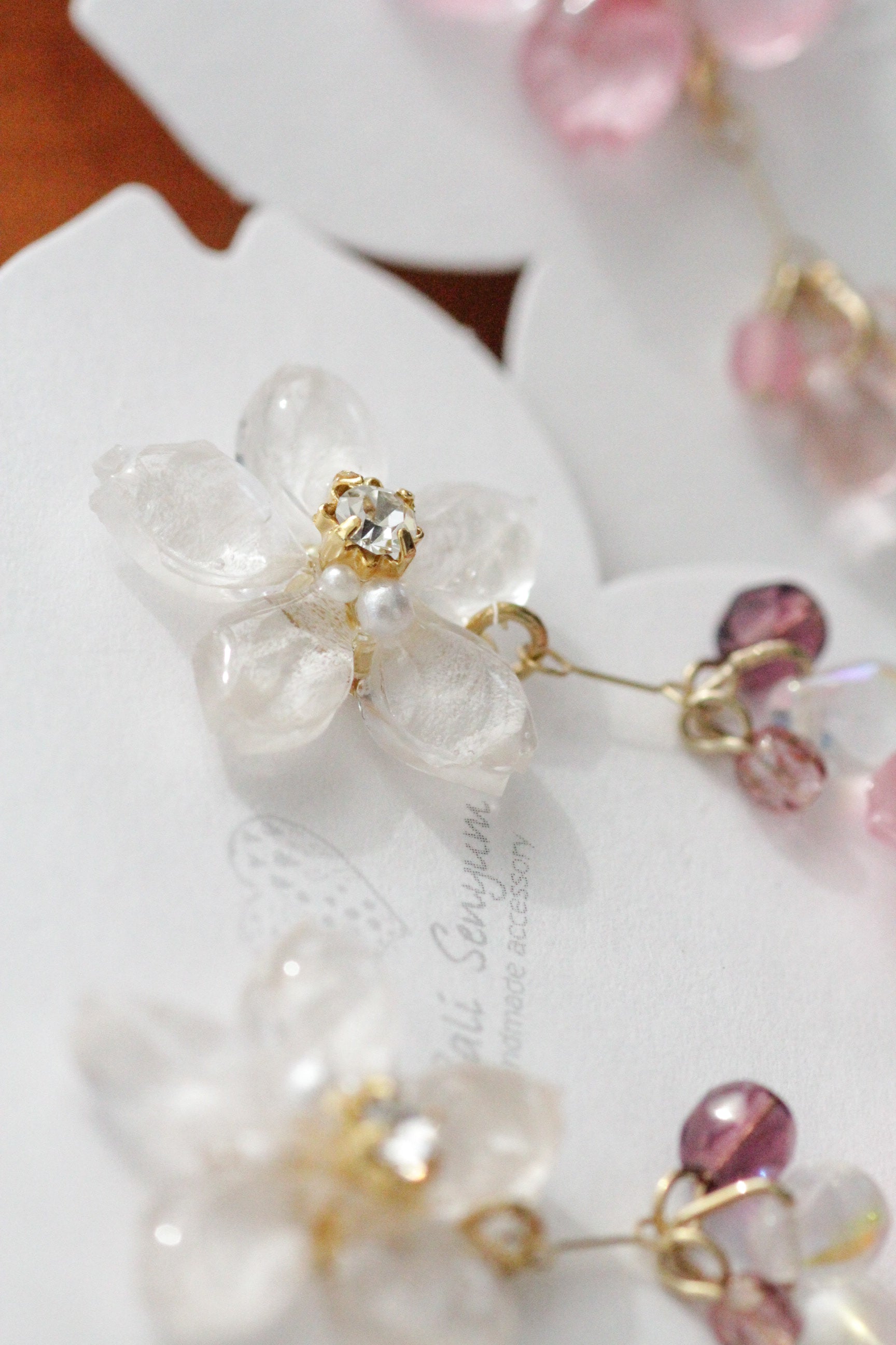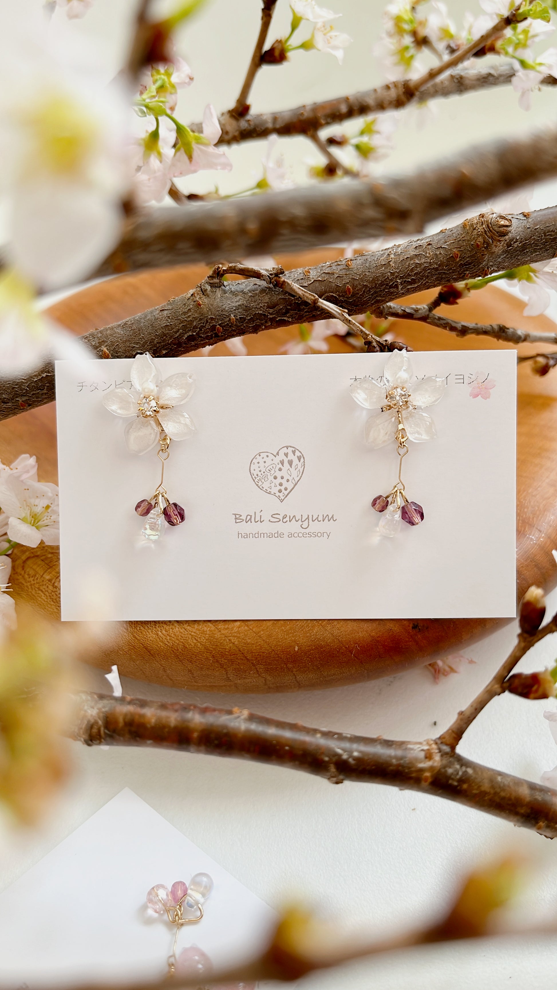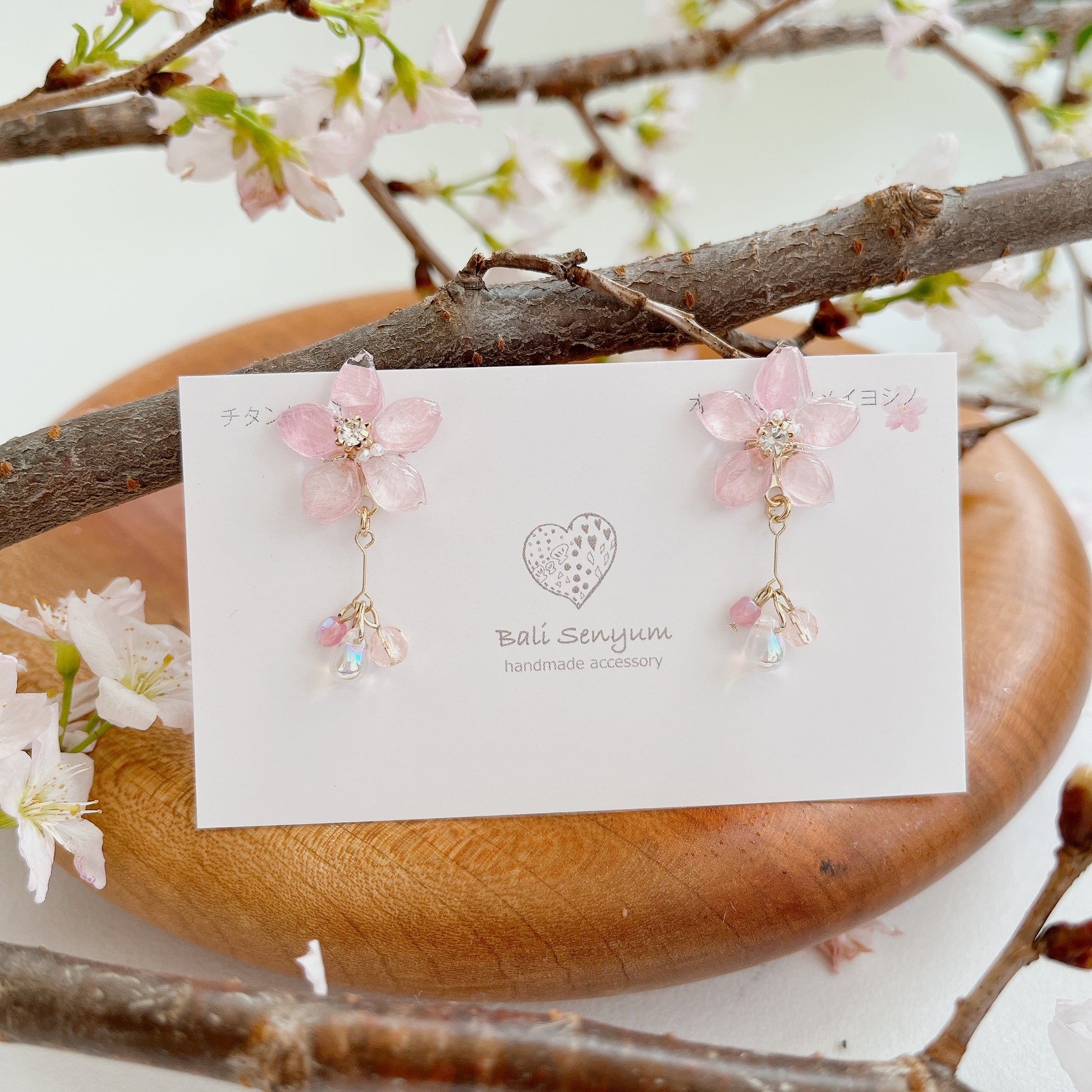 Small someiyoshino sakura petals are arranged around a jewel in the center along with a bouquet of beads dangling below. These cute earrings will let you take the feeling of an iconic Japanese Springtime wherever you go.