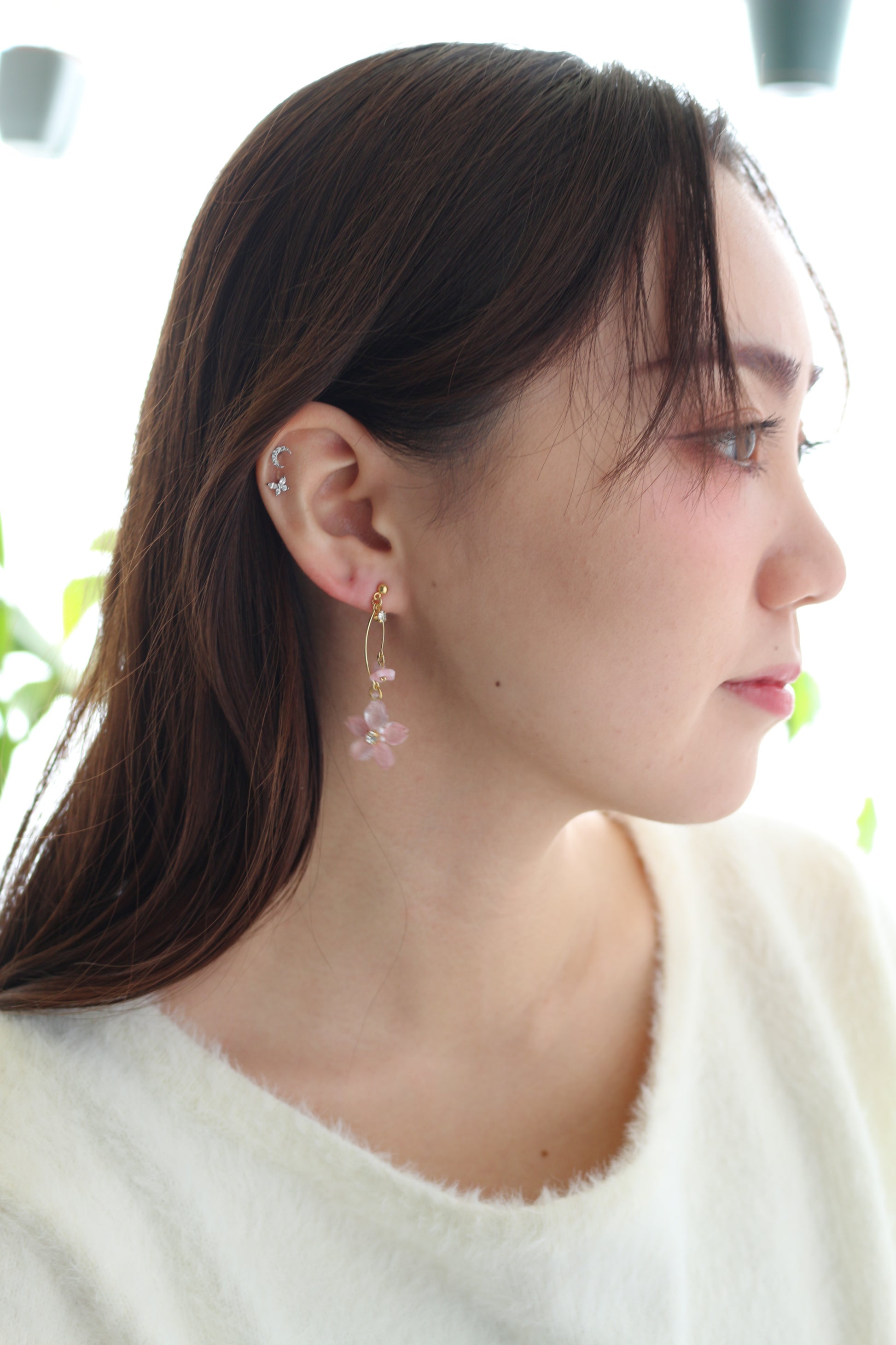 Small someiyoshino sakura petals are arranged around a jewel in the center that dangles from a golden branch. These cute earrings will let you take the feeling of an iconic Japanese Springtime wherever you go.