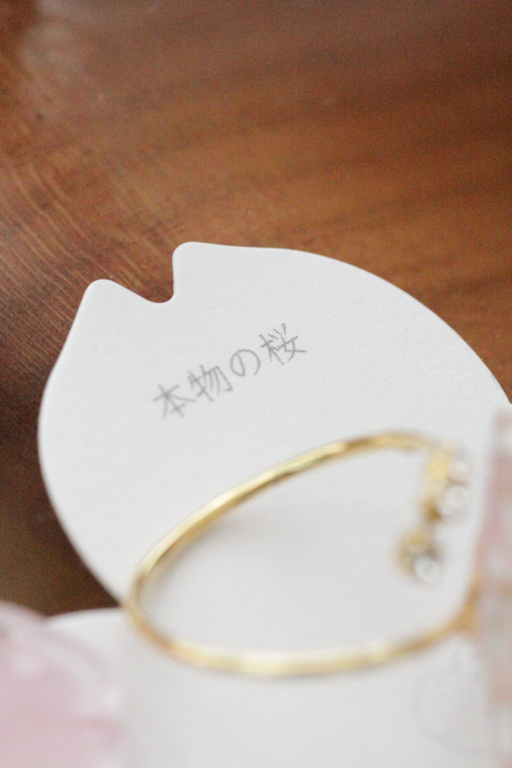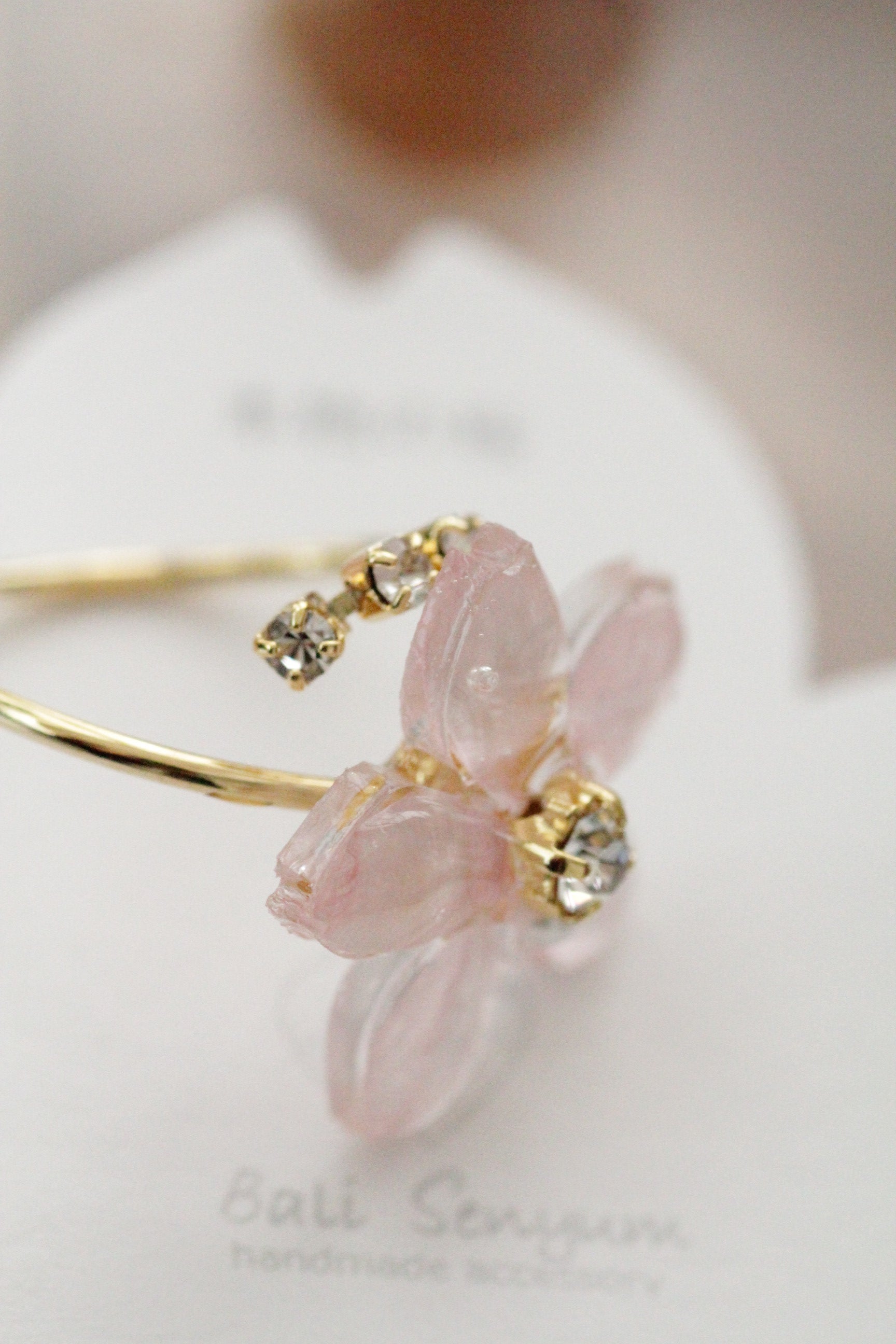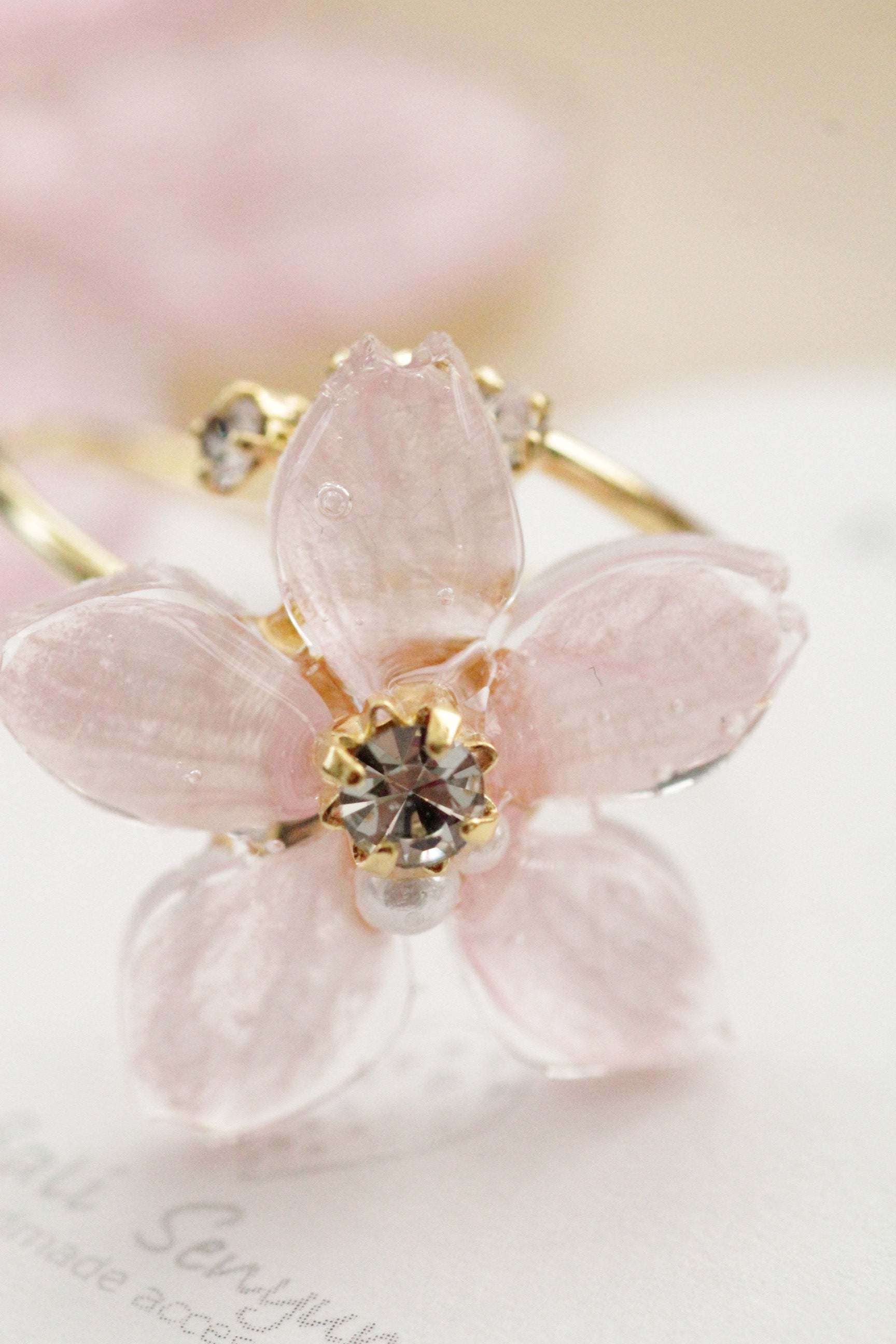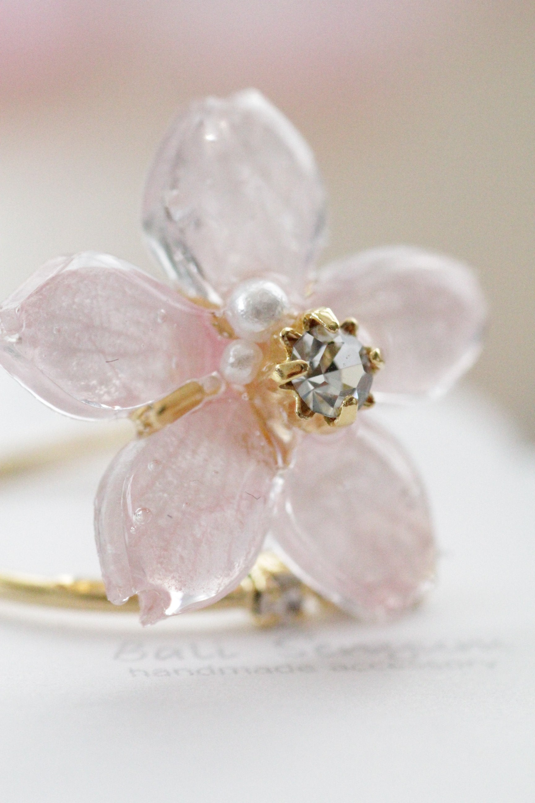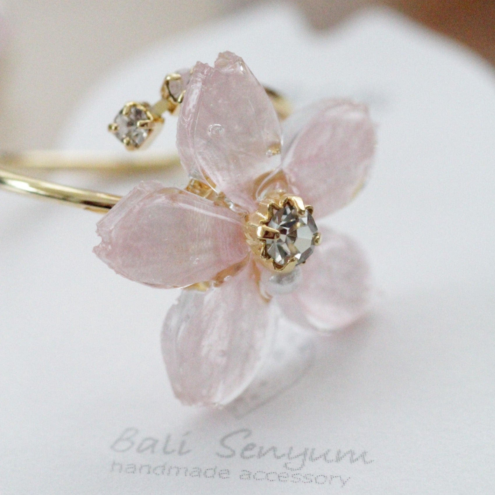 Made with real Someiyoshino sakura petals arranged into a flower with jewels adorning the center. The ring is open and has three gems at one end.