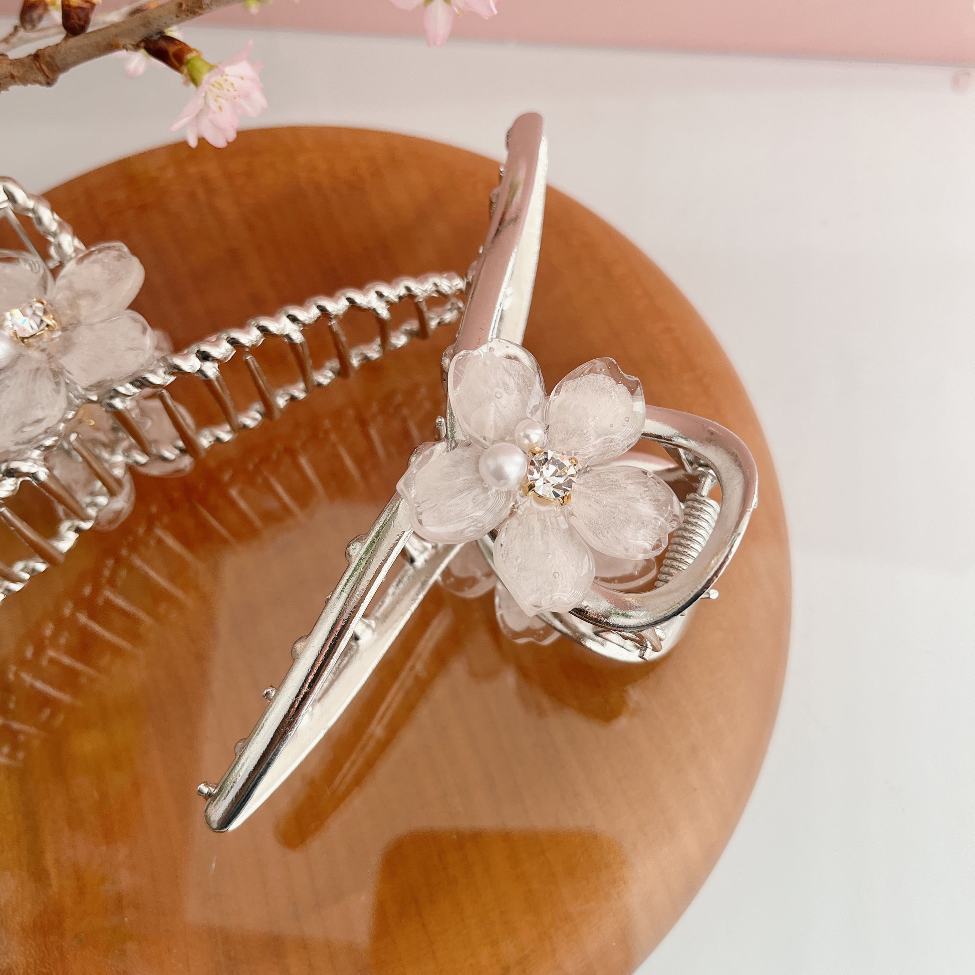 Large someiyoshino sakura petals arranged around gems create a beautiful flower that sits atop a silver colored hair clip.