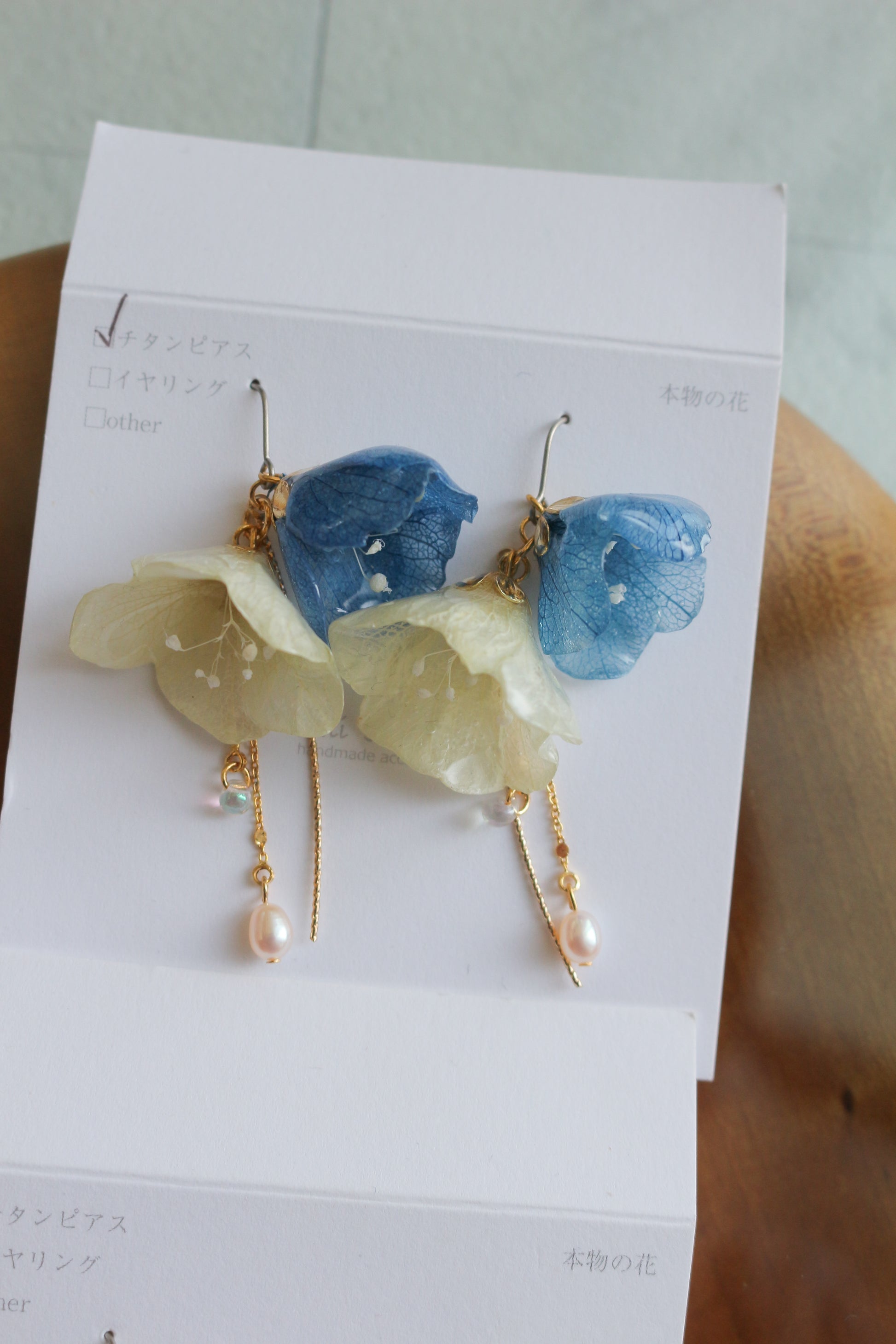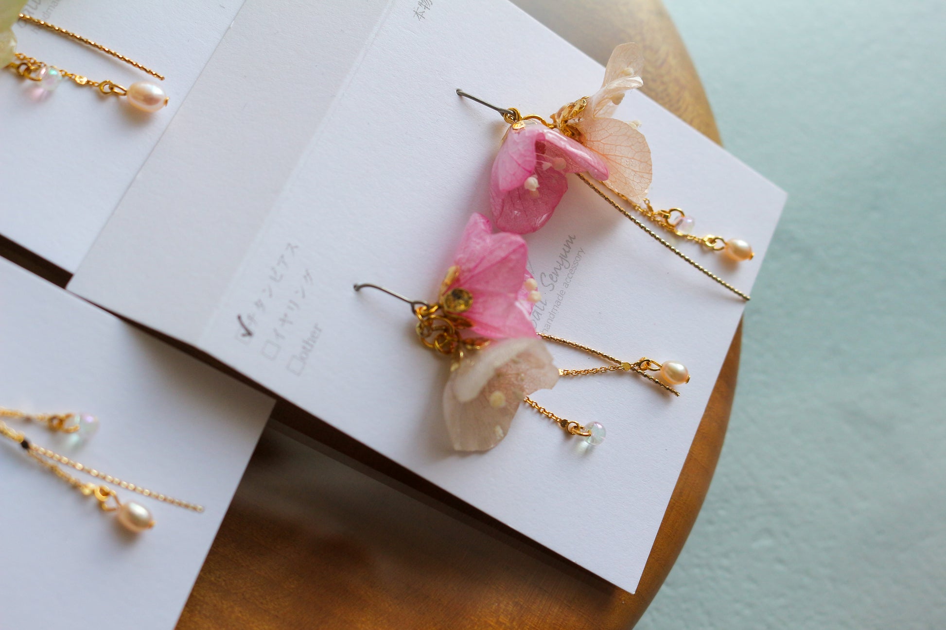 鈴蘭のピアスと"HANAYOME"のピアスをかけ合わせて作りました。