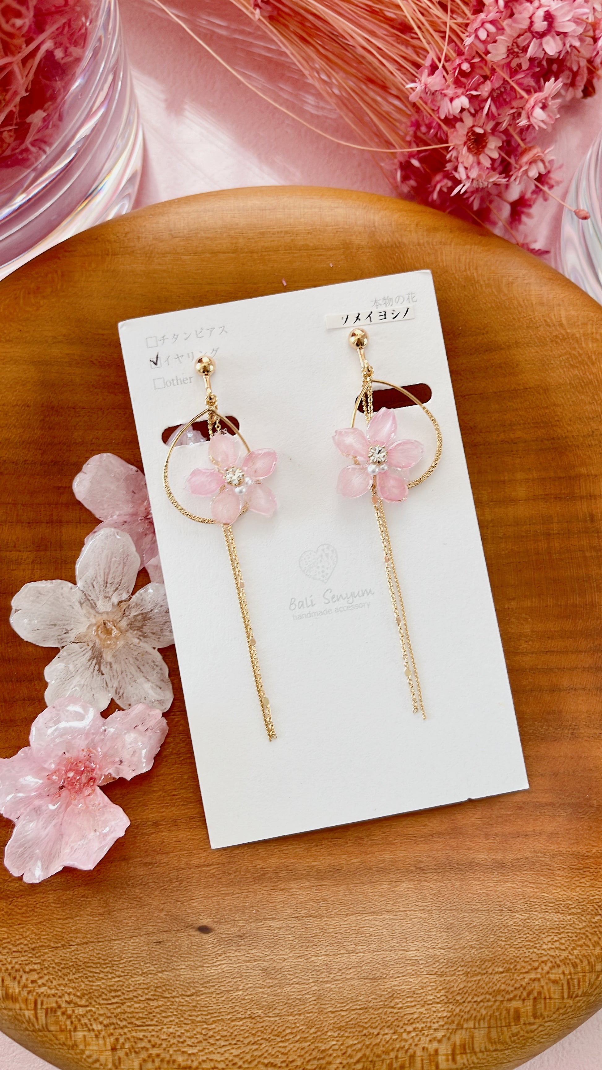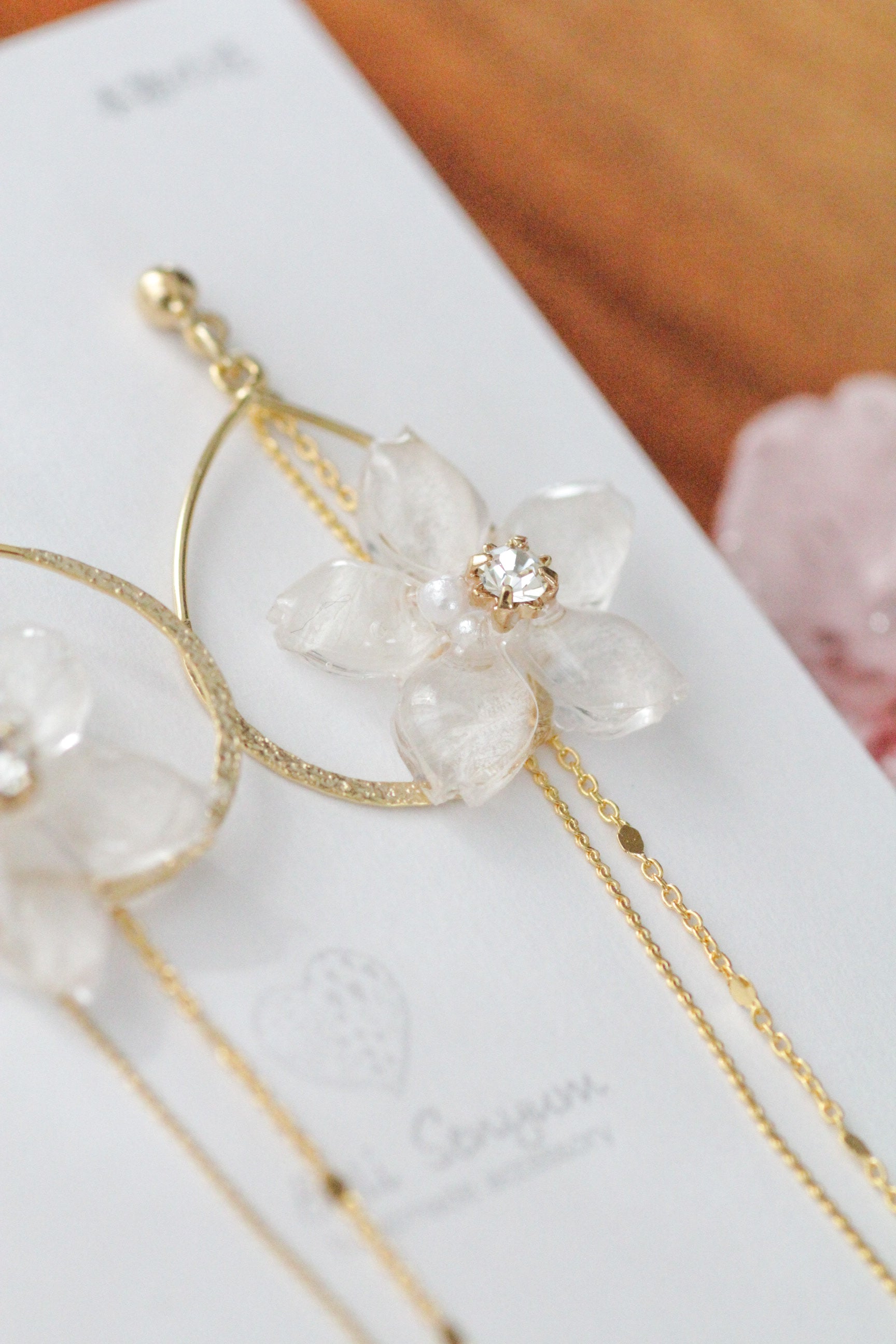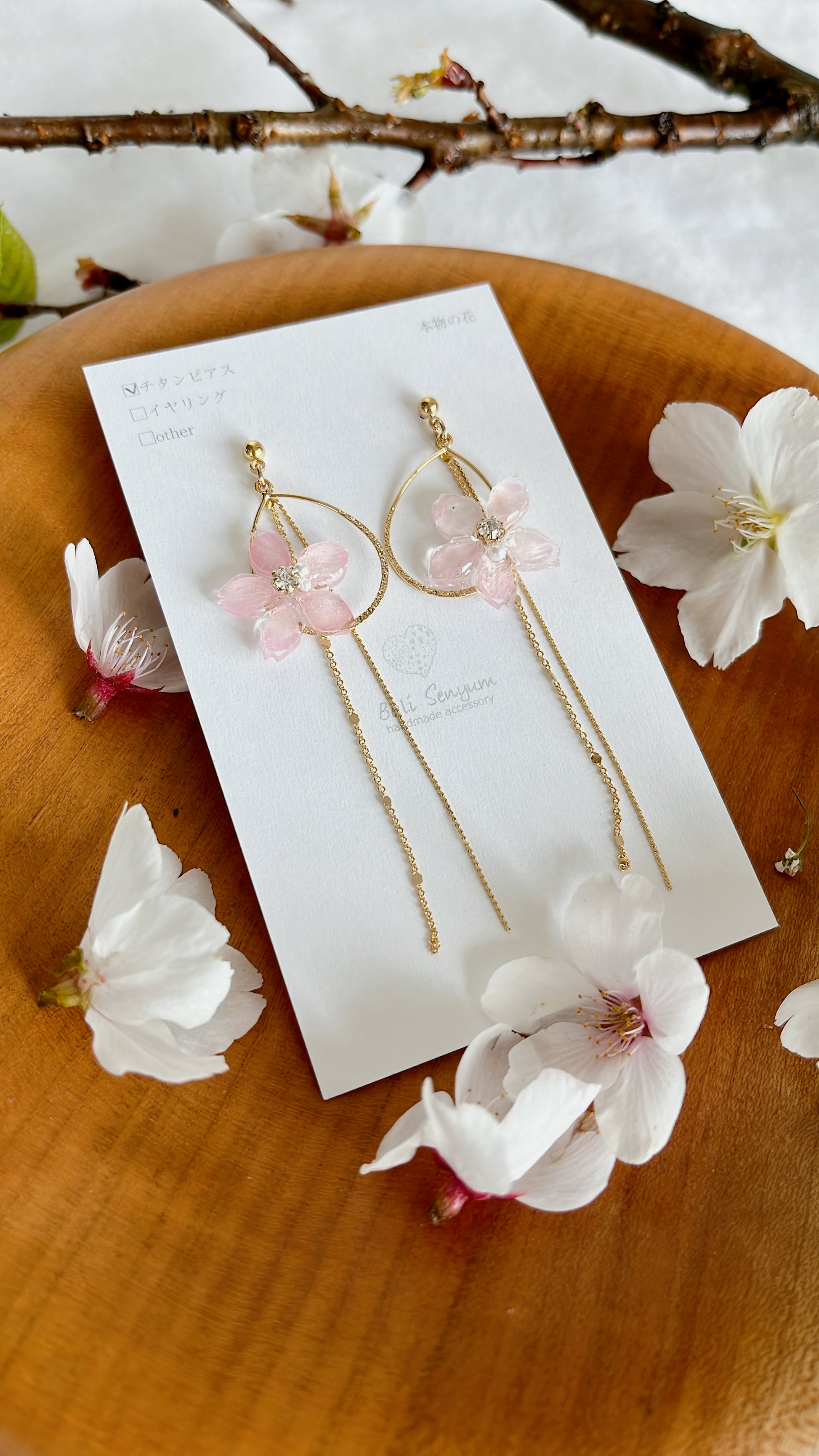 Made with real someiyoshino sakura petals from Japan. A teardrop shaped hooped adorned with the sakura with two flowing golden chains behind.
