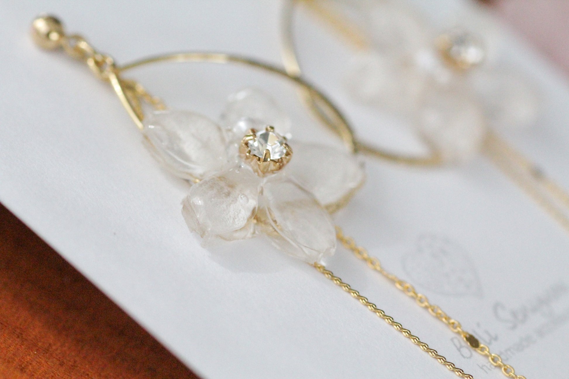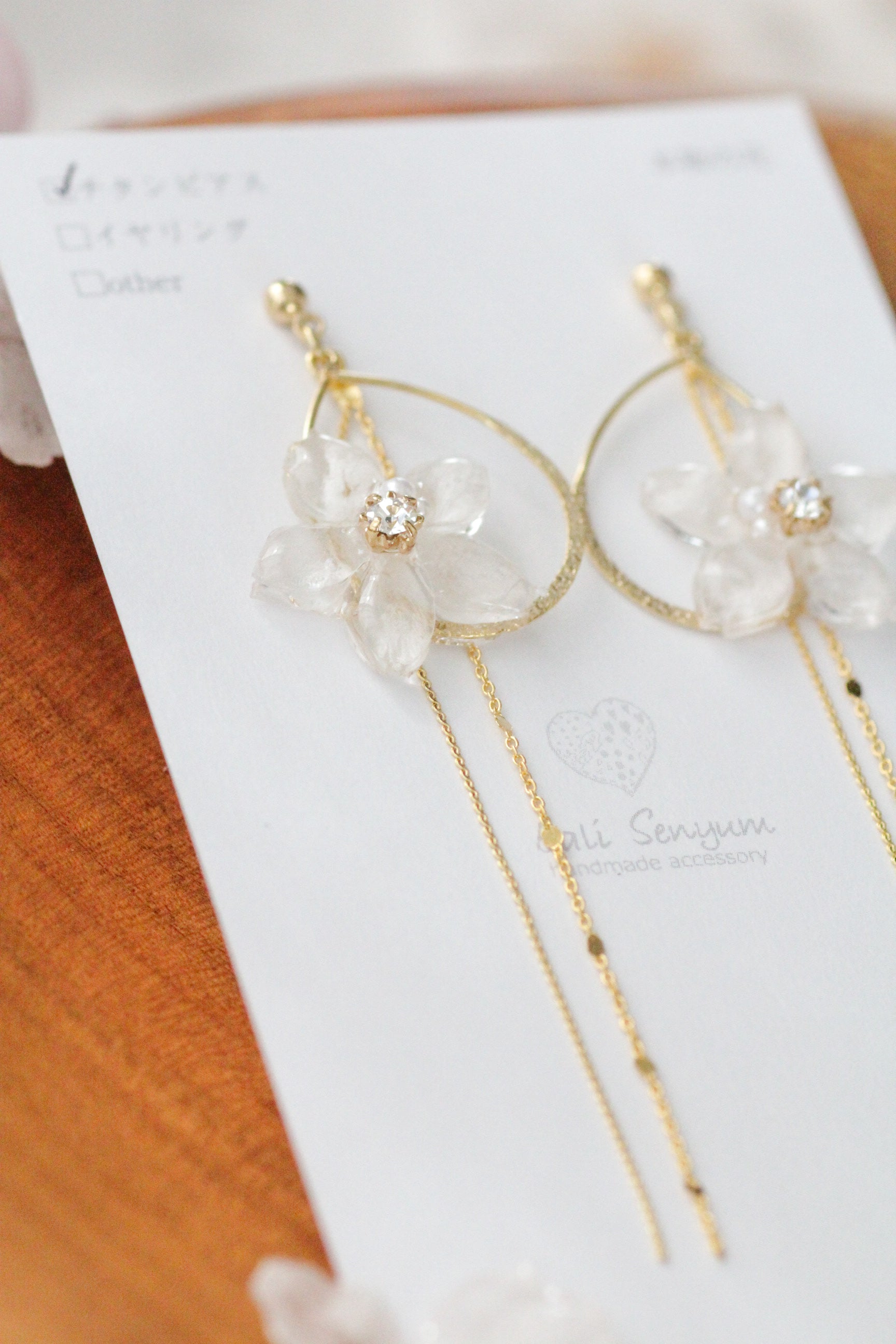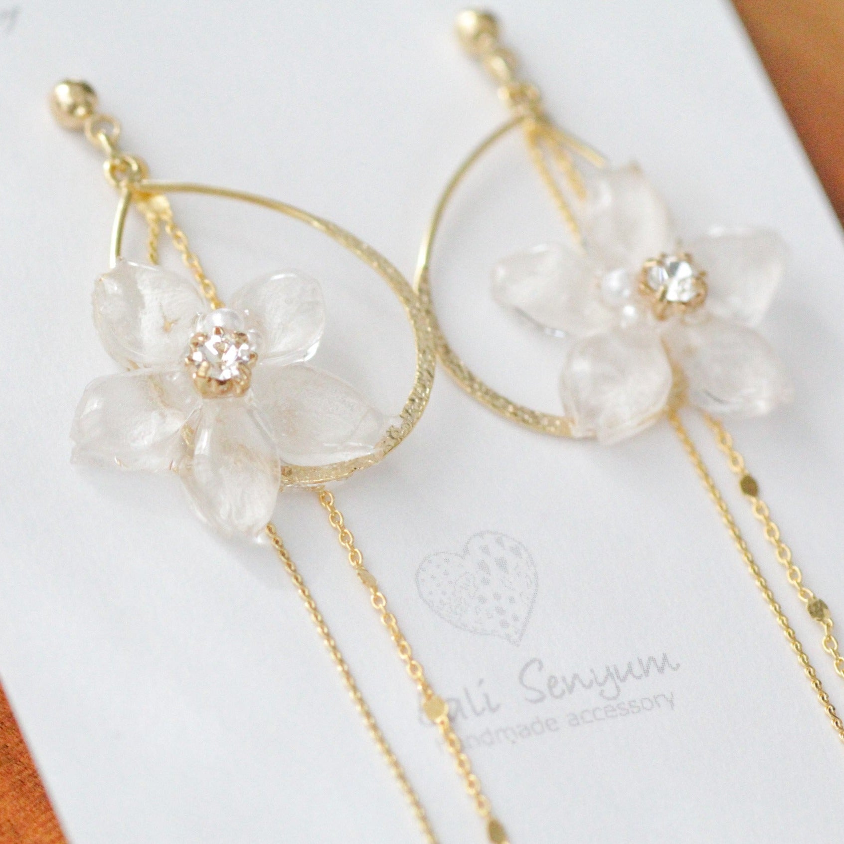 Made with real someiyoshino sakura petals from Japan. A teardrop shaped hooped adorned with the sakura with two flowing golden chains behind.