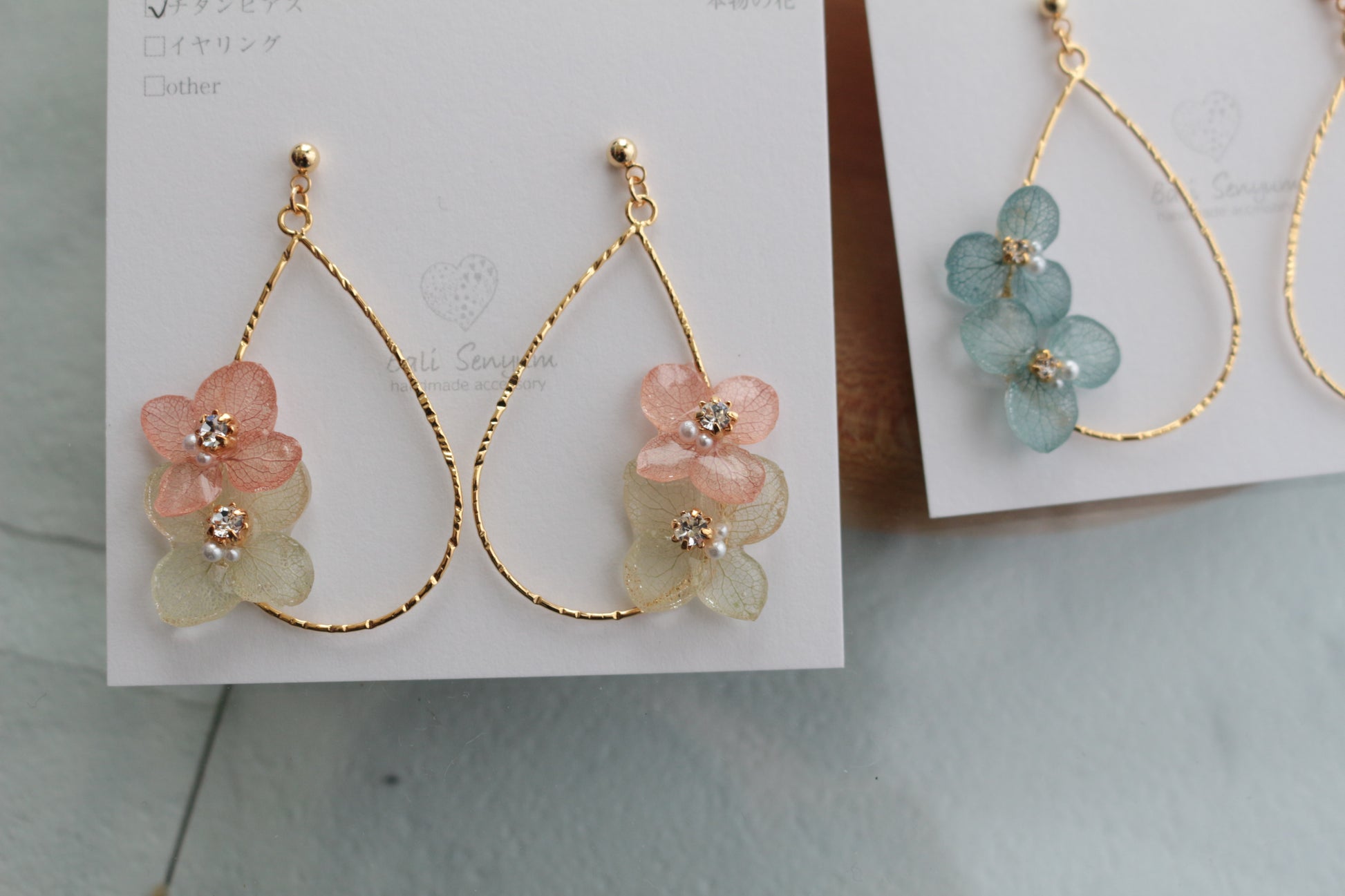 These earrings use real hydrangea flower petals.