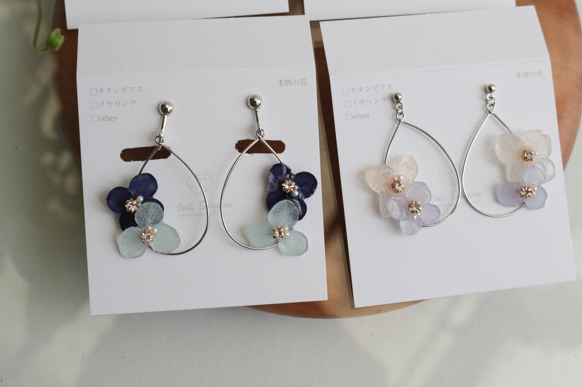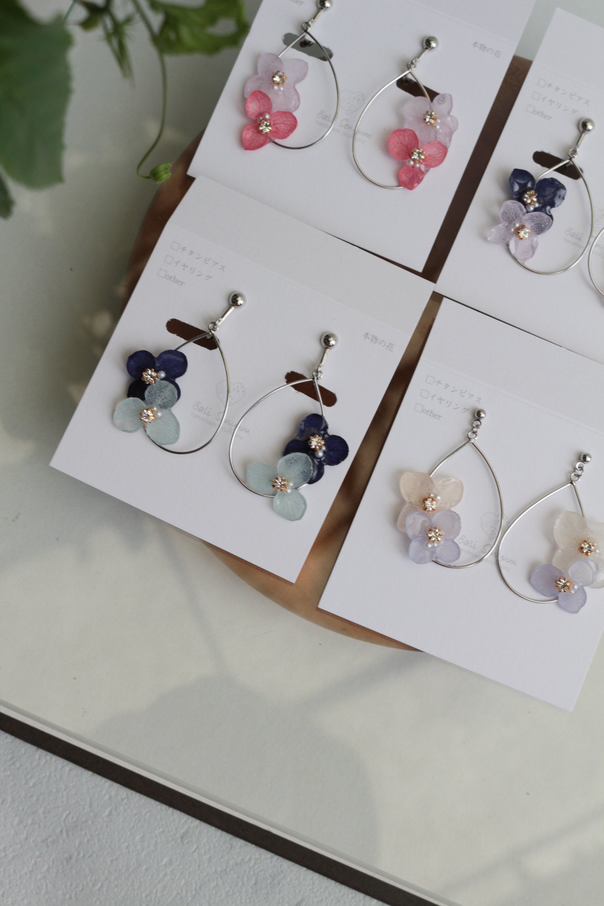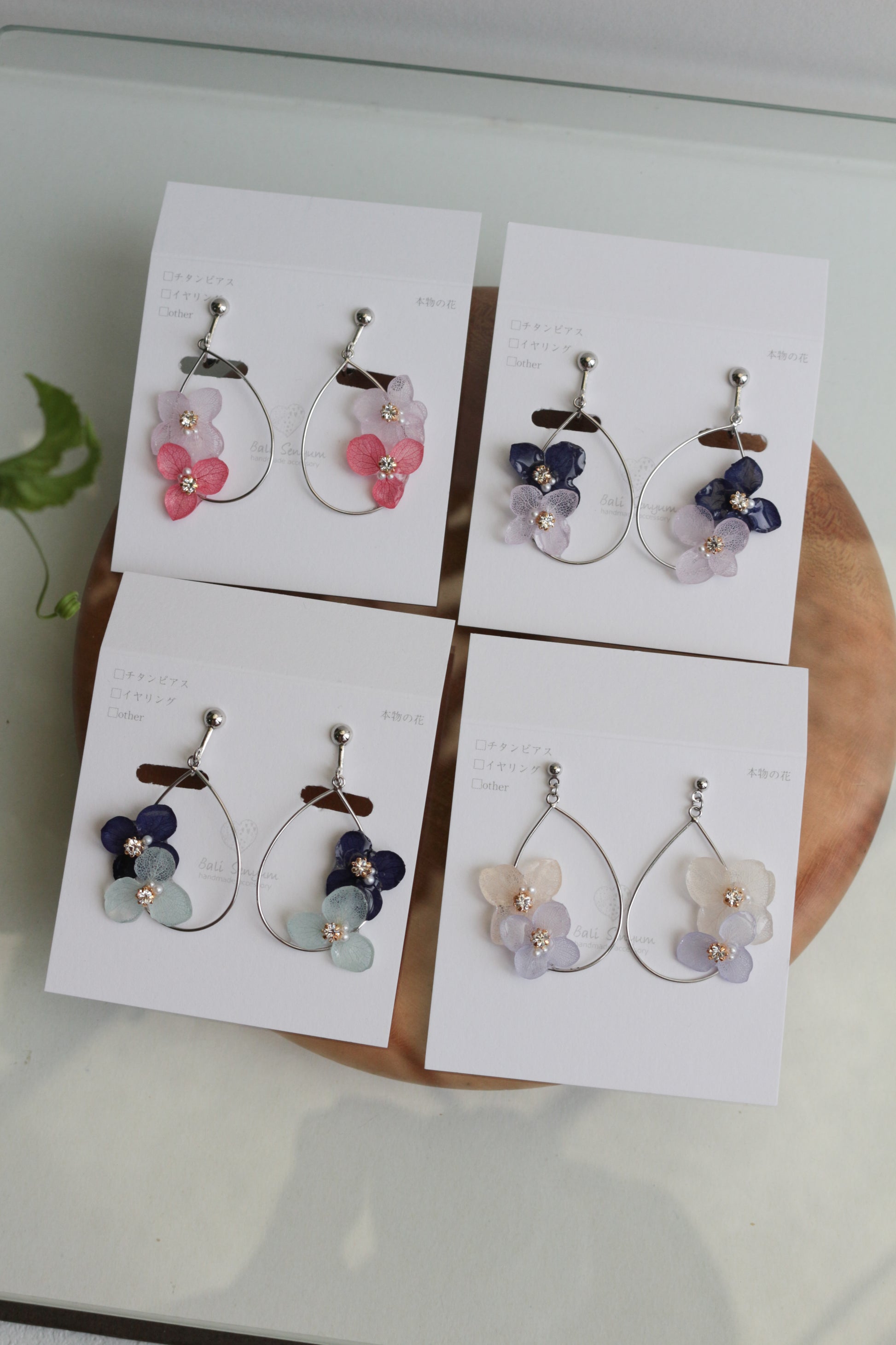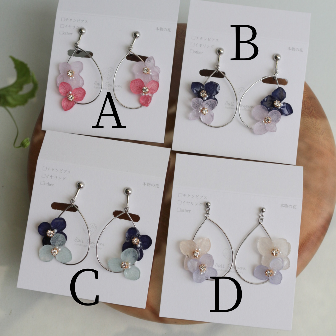 These earrings use real hydrangea flower petals.